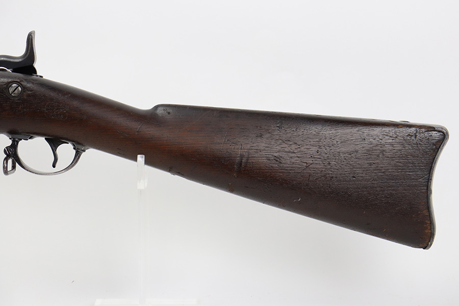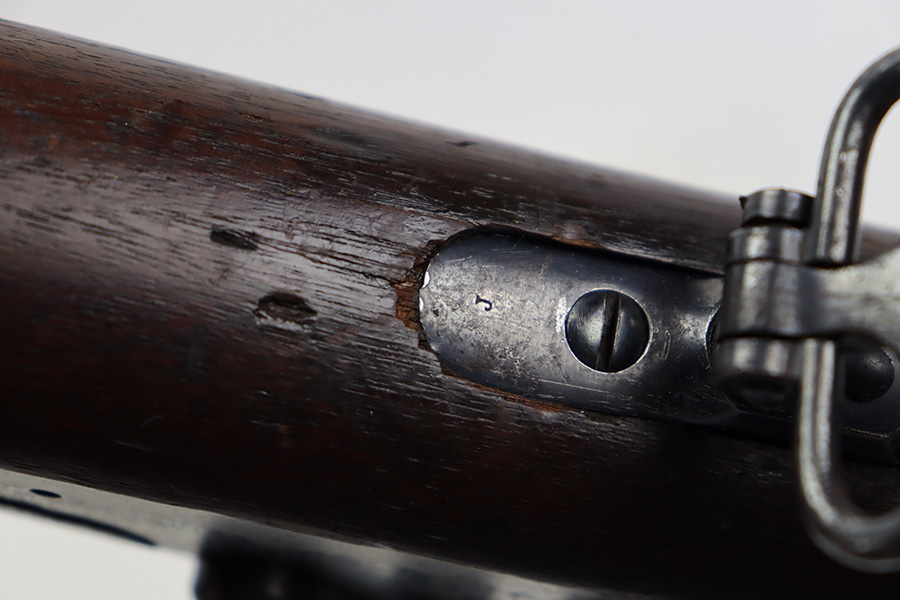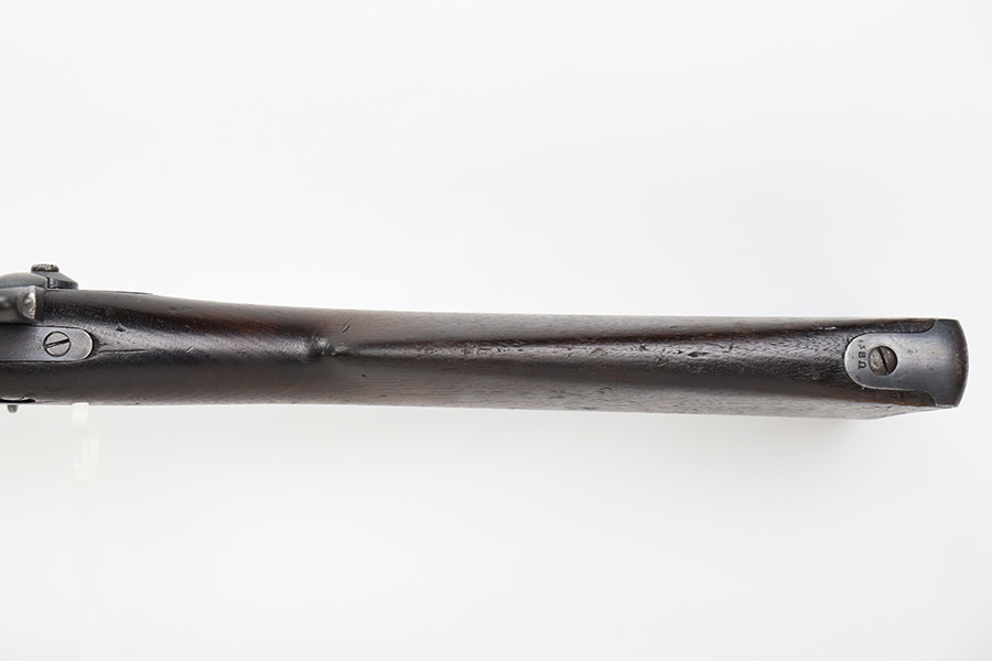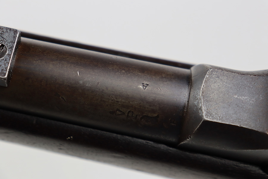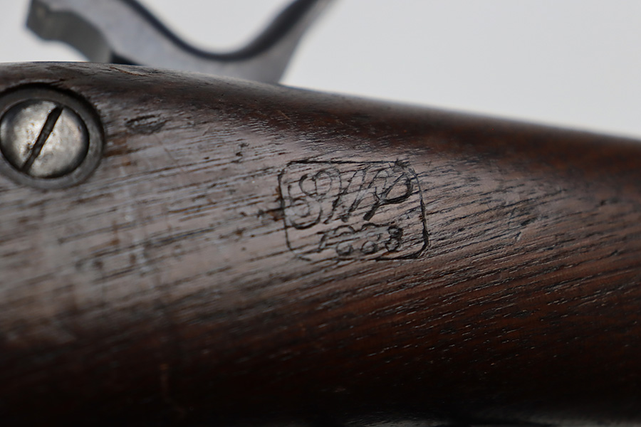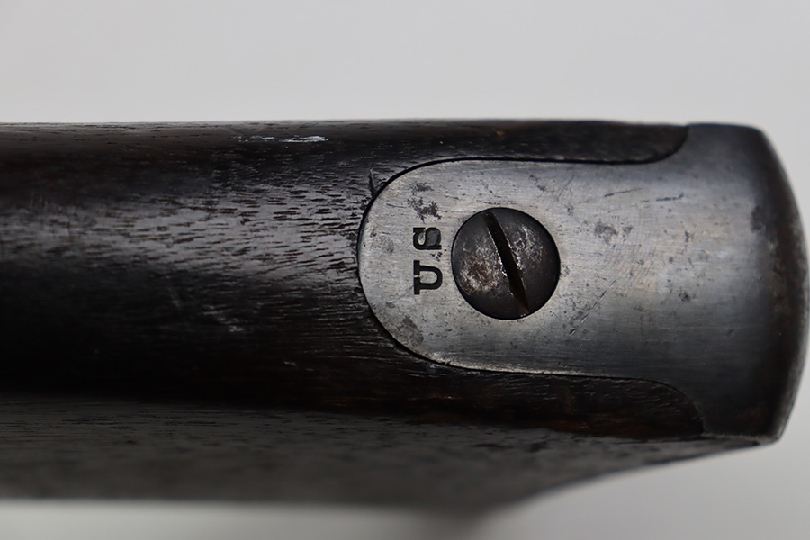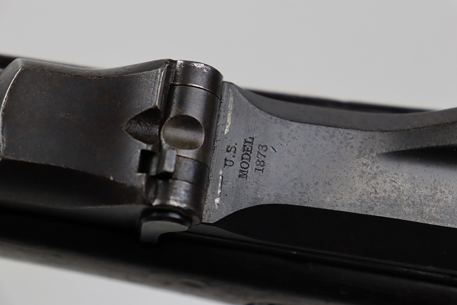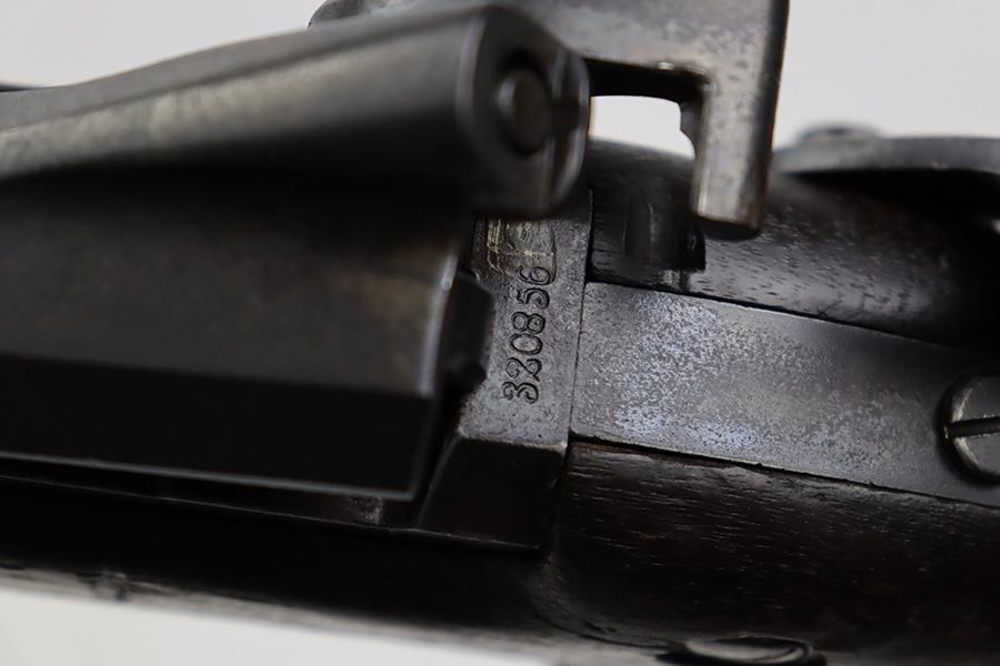 7/24/23 – This is a nice example of a Springfield Model 1873 Trapdoor rifle, chambered in .45-70. The serial number is 320856, which dates the receiver to about 1886. There are US military inspection proofs on the breech and the barrel and a military cartouche on the stock that appears to be dated 1883. Overall, the gun is in fair condition. There isn’t much actual finish loss, but there is heavy brown patina and spotty oxidation throughout. Very nice wood stock for its age with only minor bruising and scratching here and there. Near-mint bore.