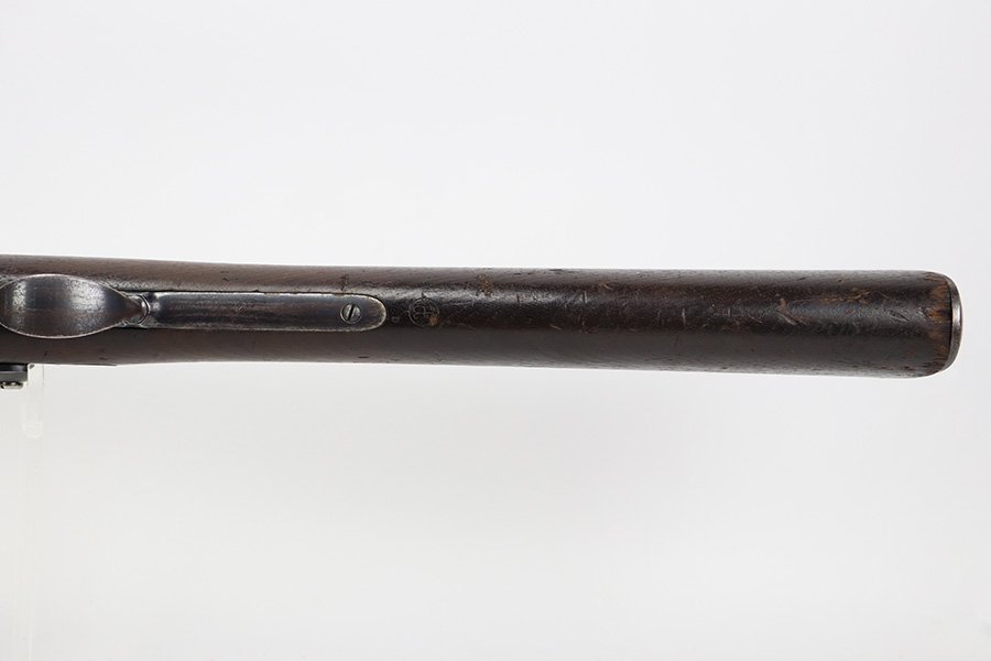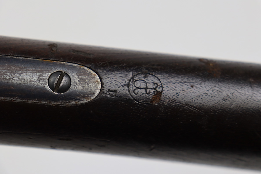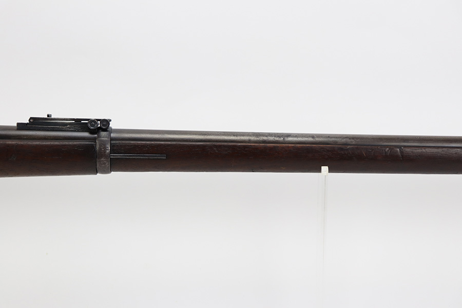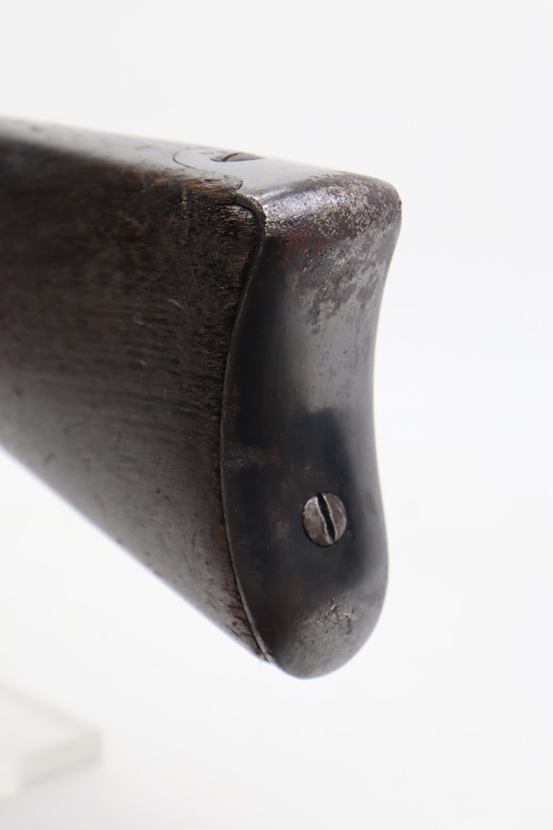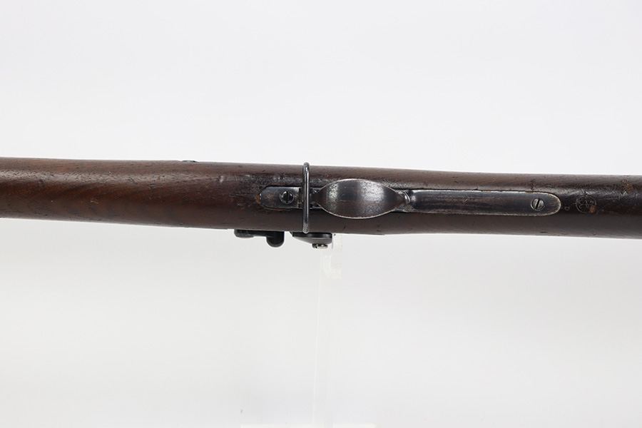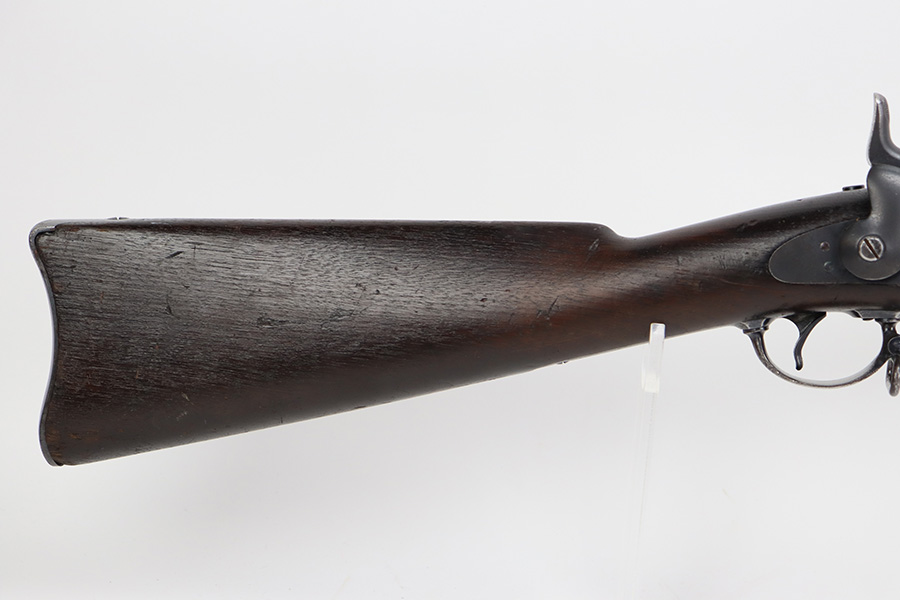 7/24/23 – This is a nice example of a Springfield Model 1873 Trapdoor rifle, chambered in .45-70. The serial number is 320856, which dates the receiver to about 1886. There are US military inspection proofs on the breech and the barrel and a military cartouche on the stock that appears to be dated 1883. Overall, the gun is in fair condition. There isn’t much actual finish loss, but there is heavy brown patina and spotty oxidation throughout. Very nice wood stock for its age with only minor bruising and scratching here and there. Near-mint bore.