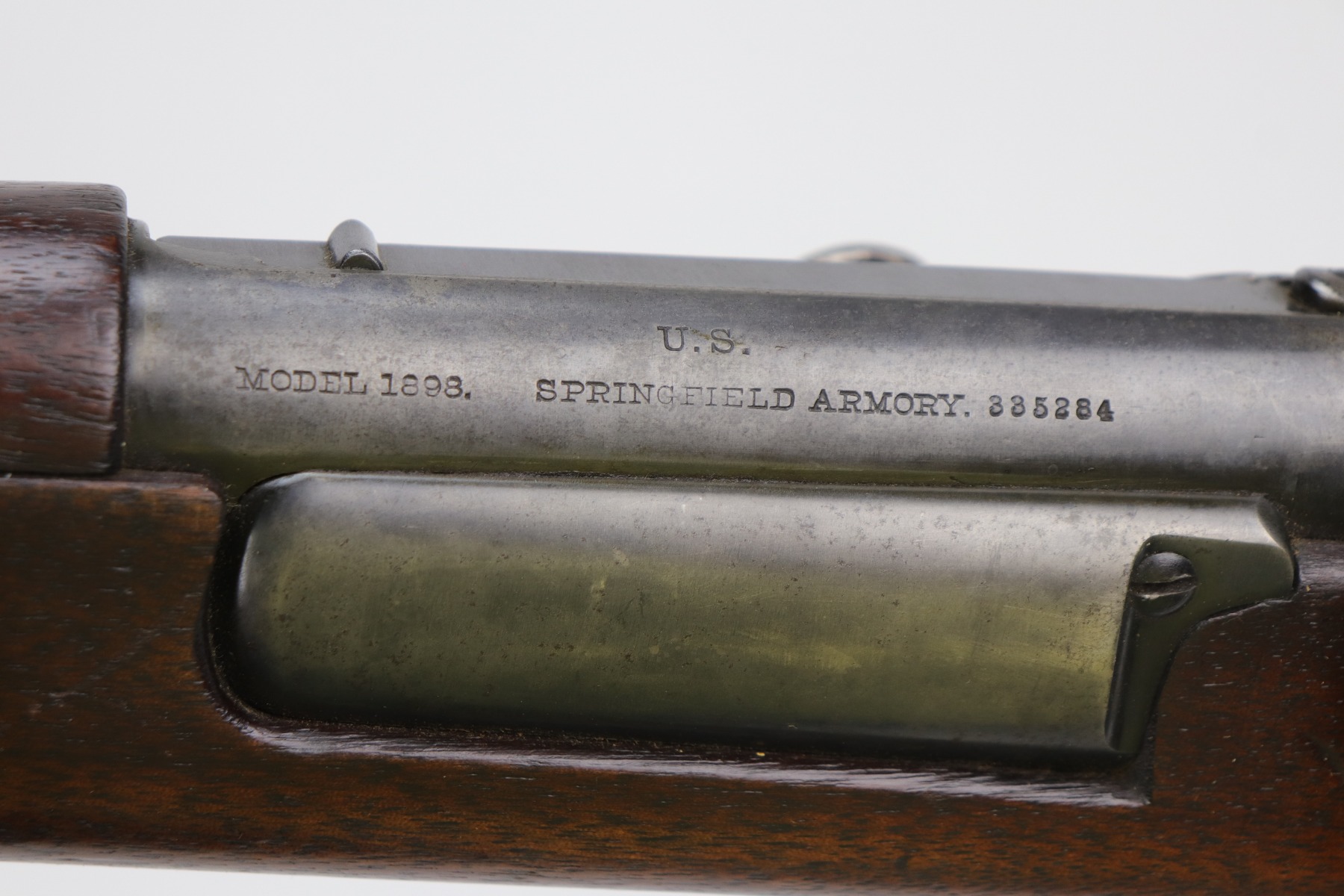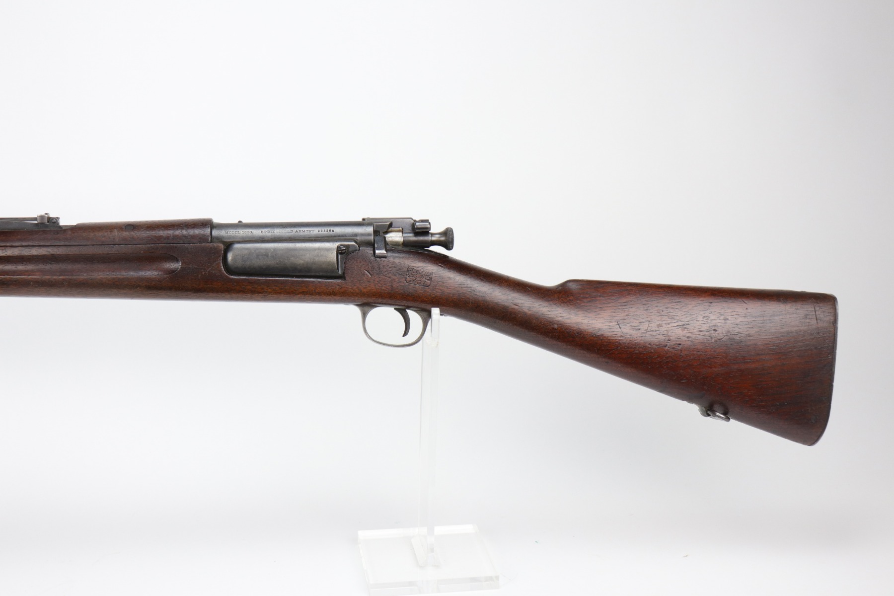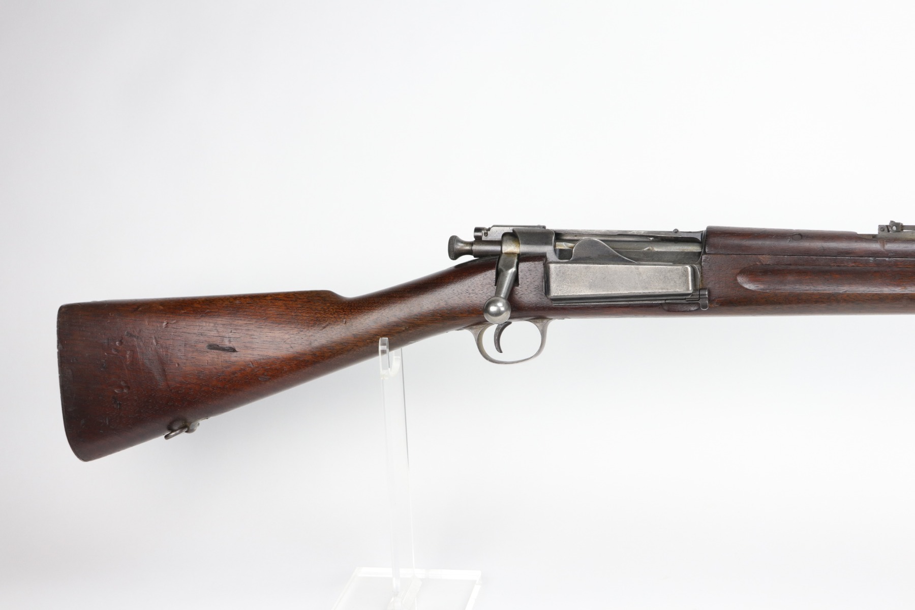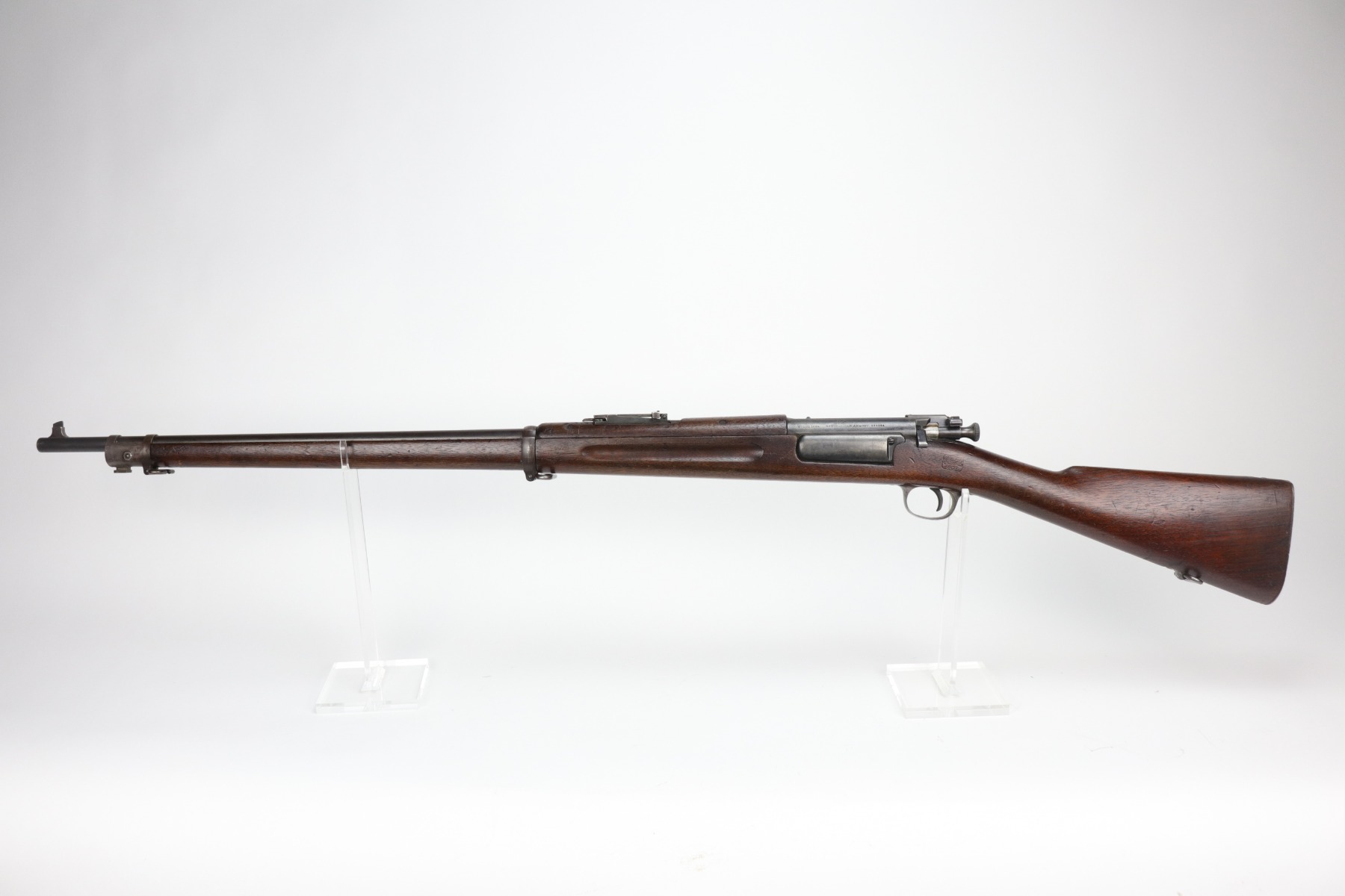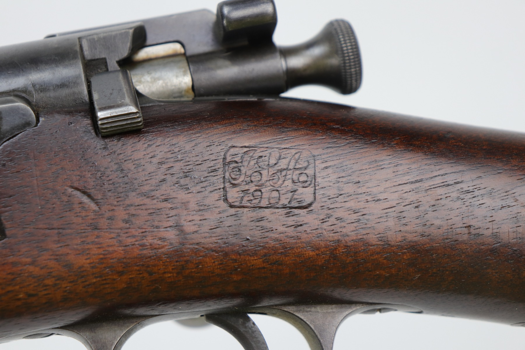 10/8/20 – This is a nice example of a Springfield “Krag” Model 1898, manufactured in 1901. Overall, it is in nice condition. The original bluing is mostly worn throughout, except for on the barrel. There is spotty oxidation and discoloration throughout. The stock is excellent condition, just a few bruises and minor dings. The stock is dated 1901 and has inspectors initials on the left side. There is a “P” proof on the wrist. The gun is fully functional and the action is smooth. The bore has decent rifling, but there are areas of minor pitting throughout.