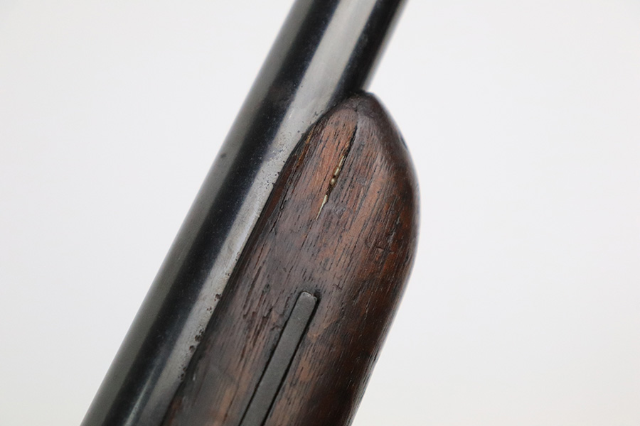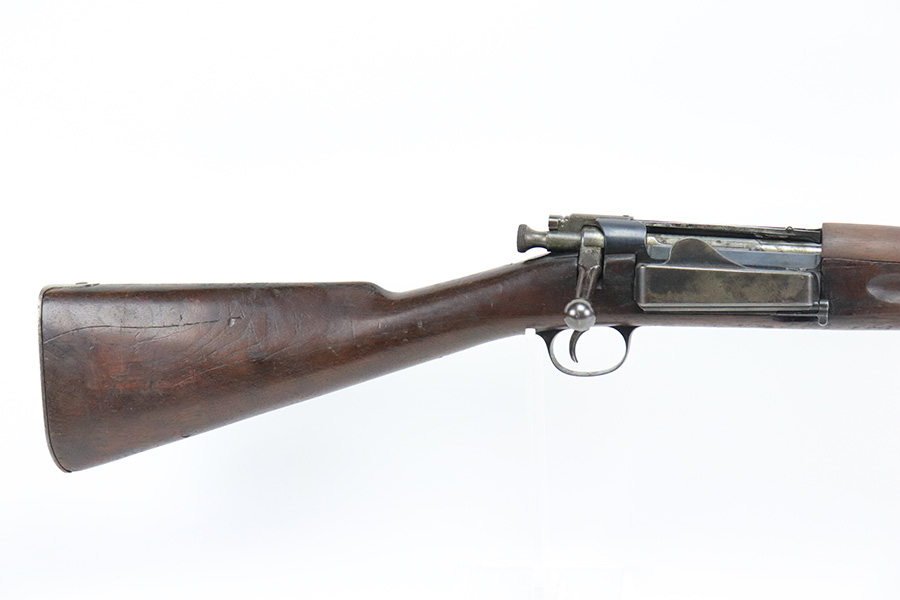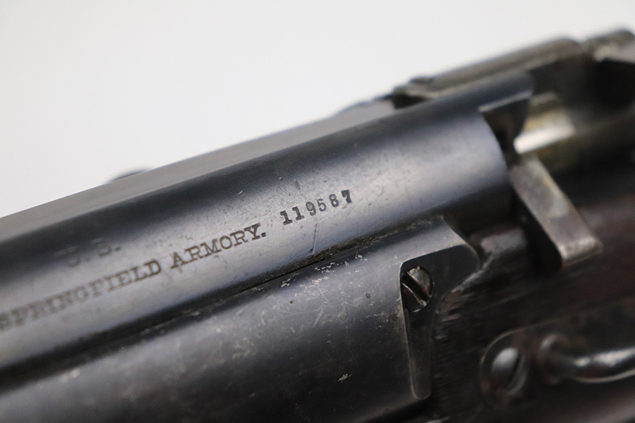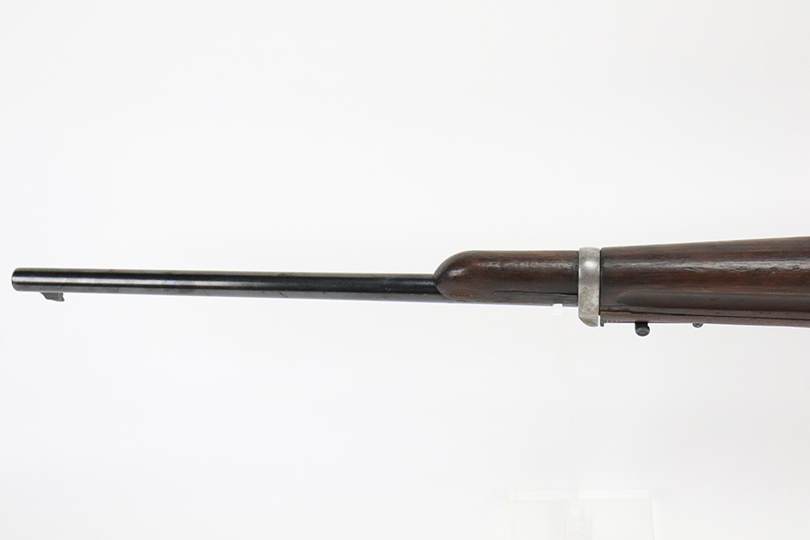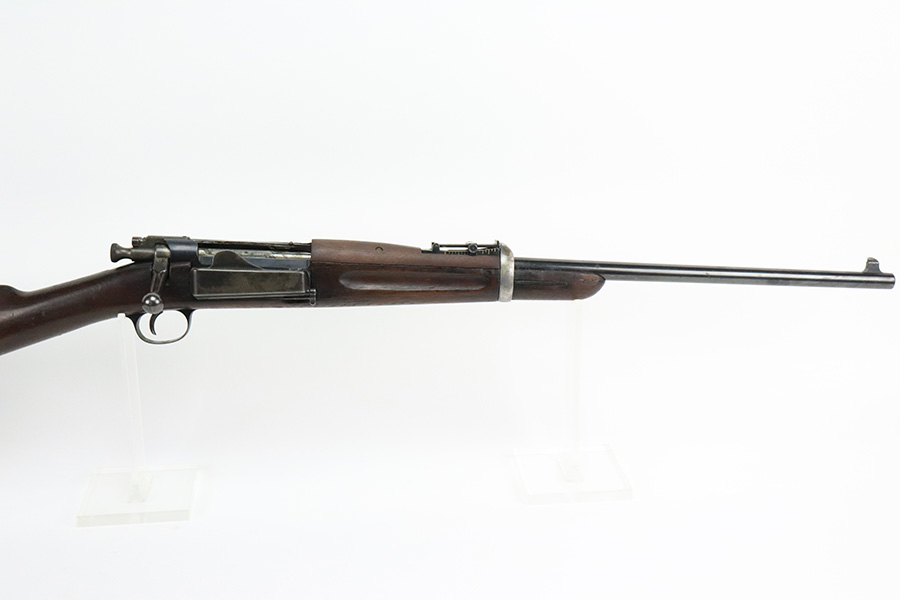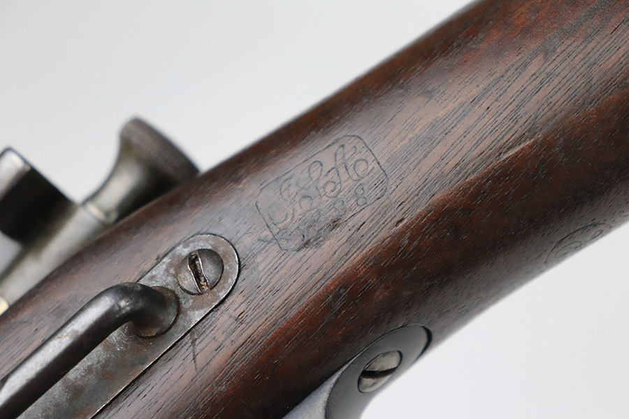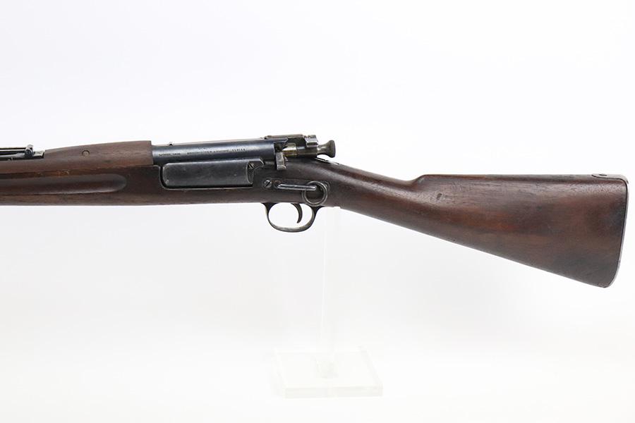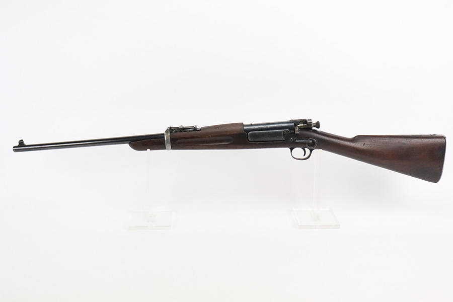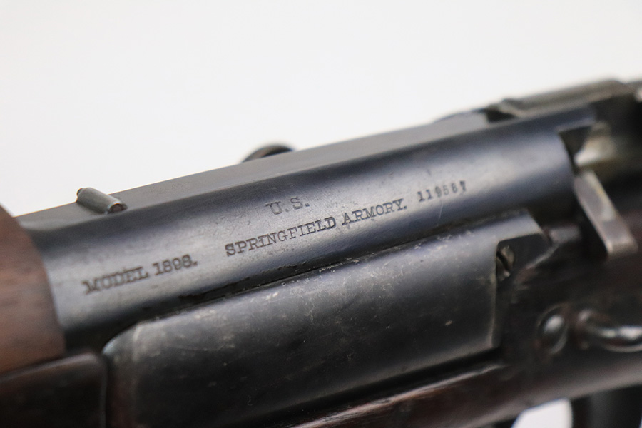 8/3/22 – This is a very nice example of a Model 1898 carbine rifle made by Springfield Armory. One of only 5,000 carbines produced, the rifle features the correct “C” marking on the rear sight, “p” proof on the stock, “JLA” over “1989” cartouche on the left side of the wrist about the trigger, properly cut stock, and saddle ring on the left side of the stock. The original finish is in good condition with some patches of thinning here and there, most noticeably on the side plate of the receiver, the magazine gate, muzzle, bolt, and bolt handle. There is minor oxidation throughout, with a small patch of surface rust on the bottom of the barrel. The wood stock is in good condition and shows minor handling wear throughout. The upper handguard has been replaced, evident by the inconsistency between its texture and sheen with the rest of the stock. The handguard is however a good fit and is secured well. The bore is shiny with good rifling but does have some freckling and frost throughout.