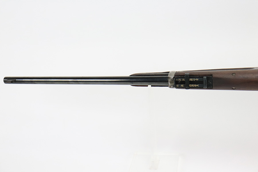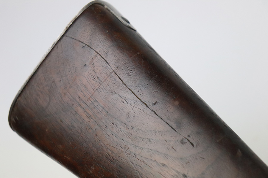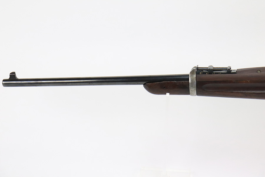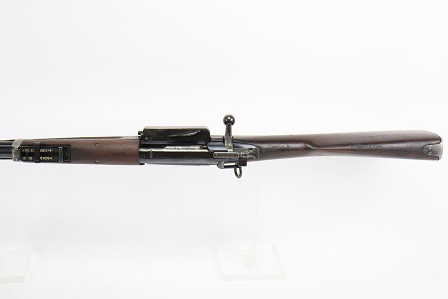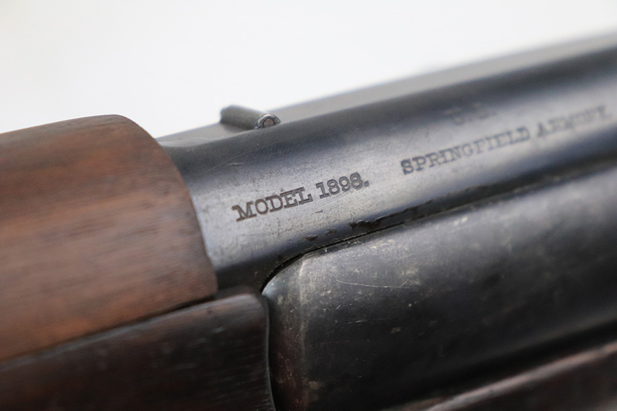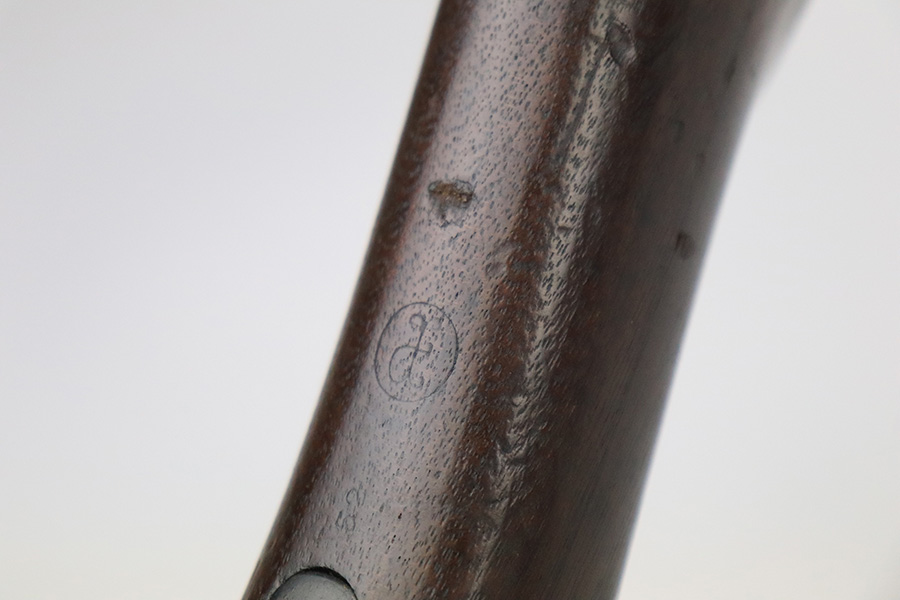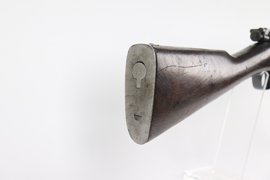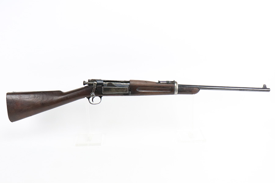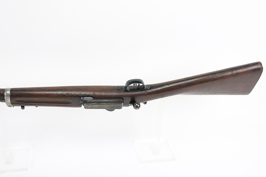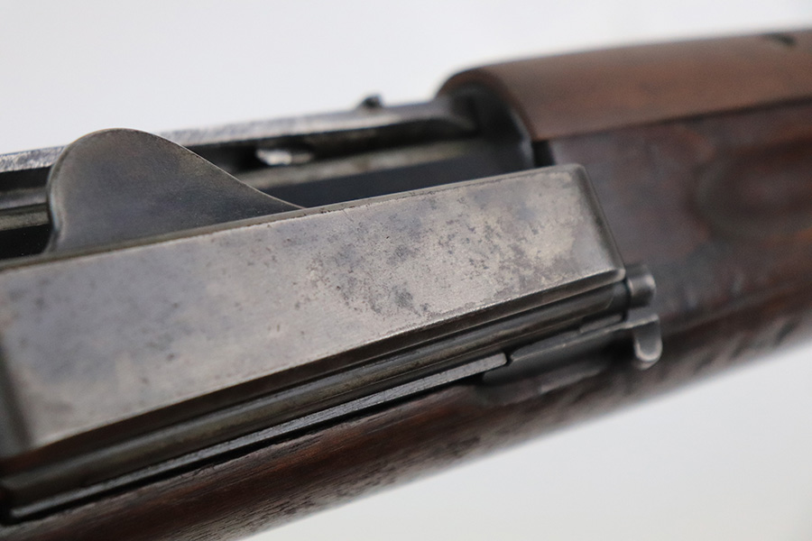 8/3/22 – This is a very nice example of a Model 1898 carbine rifle made by Springfield Armory. One of only 5,000 carbines produced, the rifle features the correct “C” marking on the rear sight, “p” proof on the stock, “JLA” over “1989” cartouche on the left side of the wrist about the trigger, properly cut stock, and saddle ring on the left side of the stock. The original finish is in good condition with some patches of thinning here and there, most noticeably on the side plate of the receiver, the magazine gate, muzzle, bolt, and bolt handle. There is minor oxidation throughout, with a small patch of surface rust on the bottom of the barrel. The wood stock is in good condition and shows minor handling wear throughout. The upper handguard has been replaced, evident by the inconsistency between its texture and sheen with the rest of the stock. The handguard is however a good fit and is secured well. The bore is shiny with good rifling but does have some freckling and frost throughout.