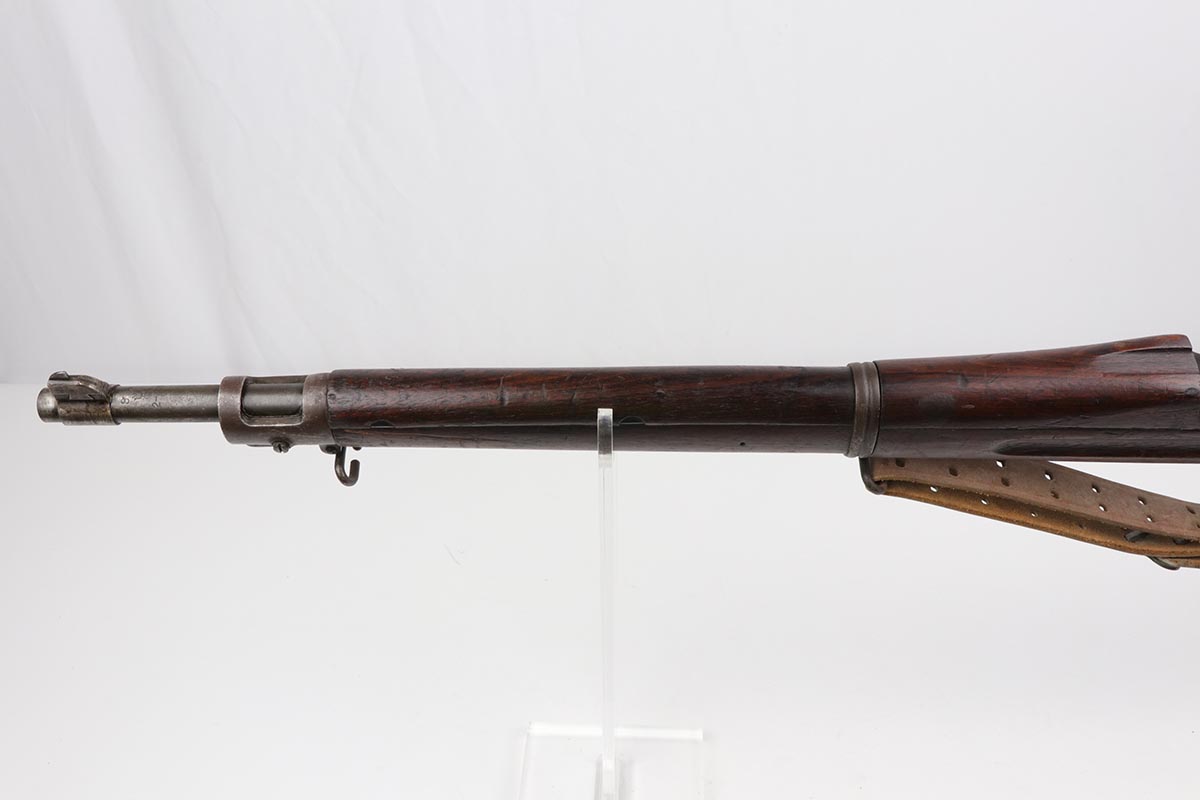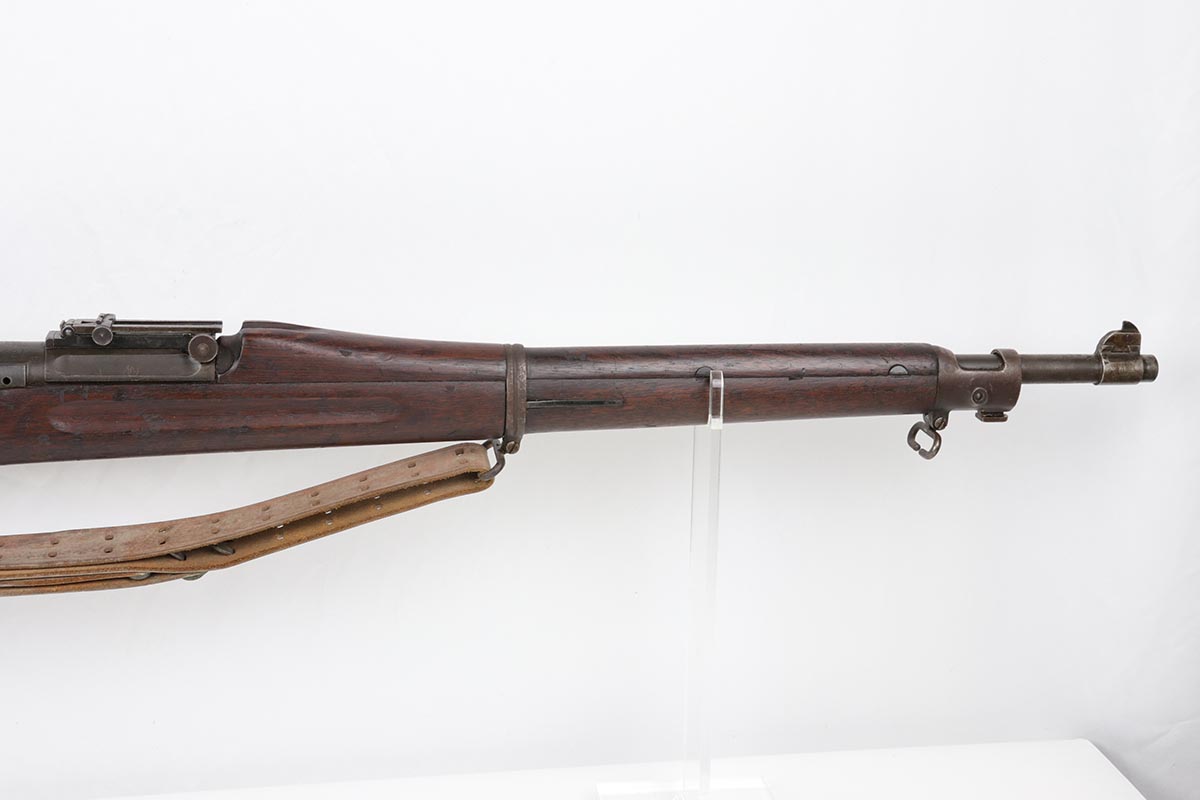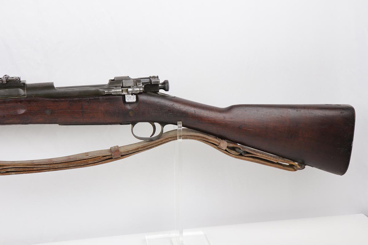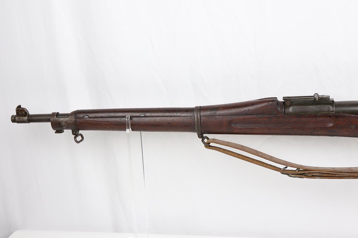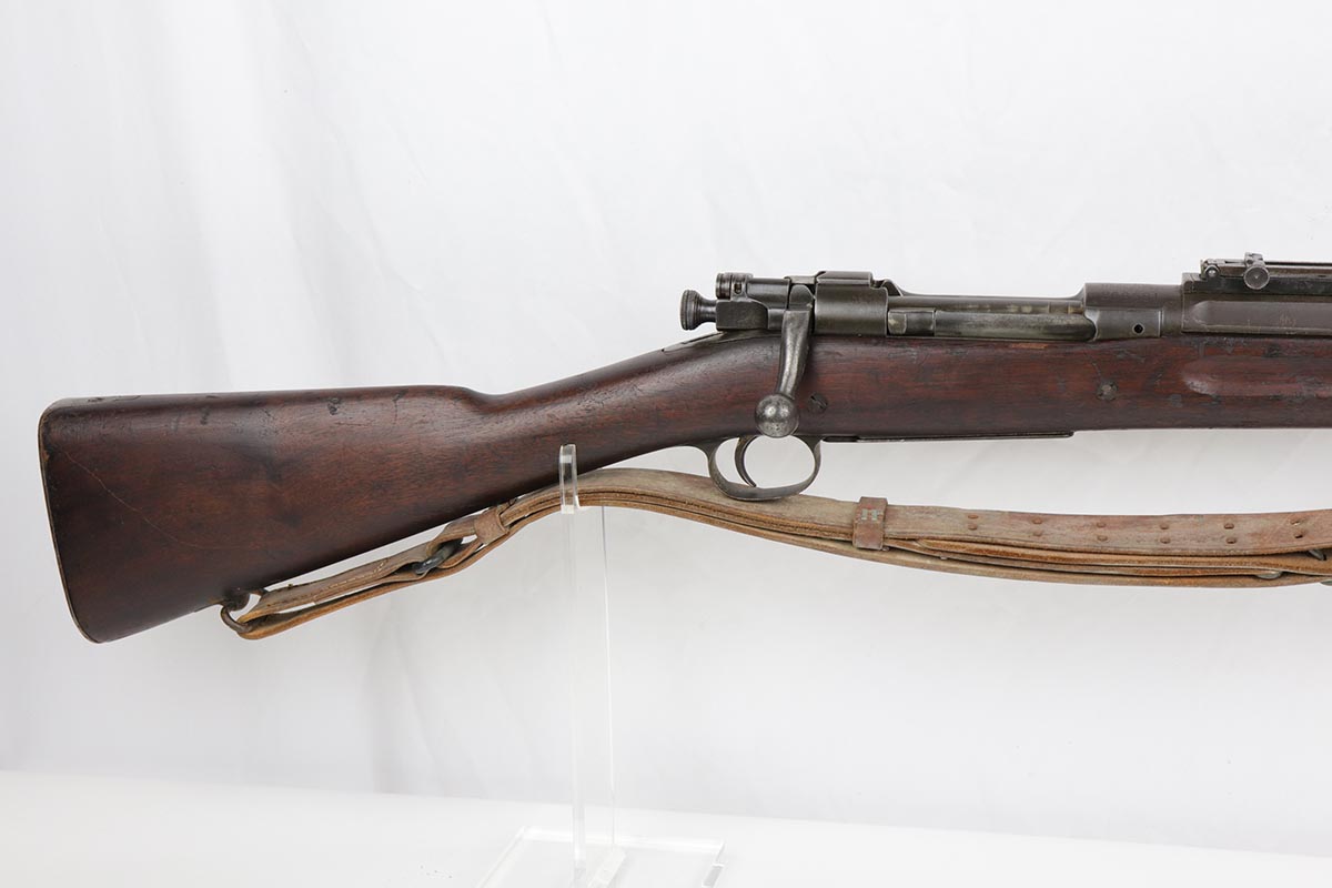 8/19/19 – This is an original Springfield model 1903 rifle, made in 1918 for use during WW1. The rifle is all original, including the original stock. The stock has an inspector stamp on the left side, and though faint you can read “O.G.E.K.” . The stock has a few minor dings and surface scratches, but no notable cracks. The metal has dark patina and light discoloration throughout the receiver and bolt assembly, as well as some finish loss on the barrel / muzzle area. The bolt has a smooth action, but the bore is fairly rough, only rating at 4/10 overall. The rifling is in tact but there’s evidence of residue / rust throughout the bore. Comes with a nice, original leather strap that appears period correct, but we don’t see any maker stamps or dates.