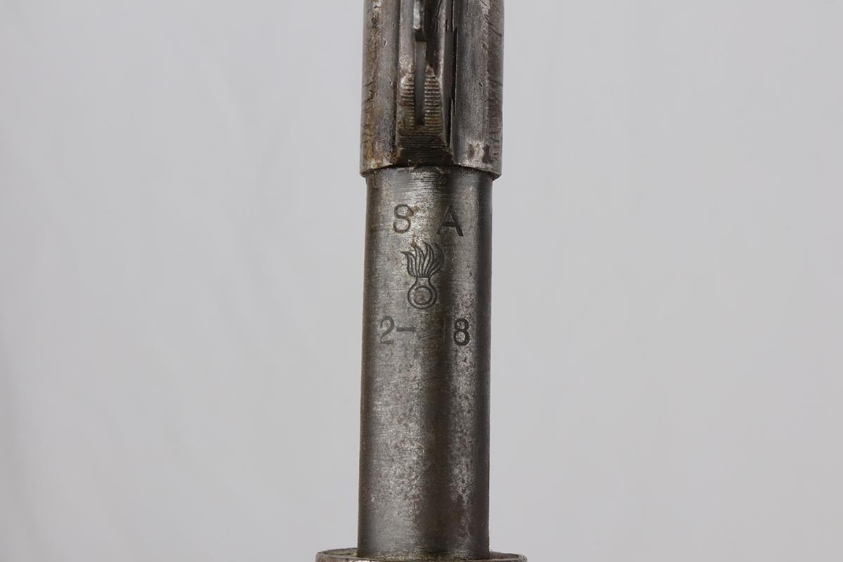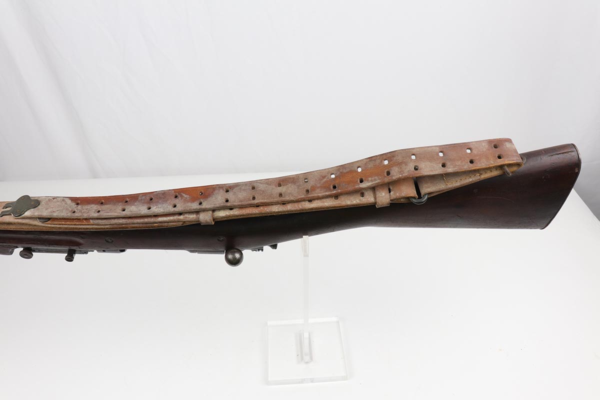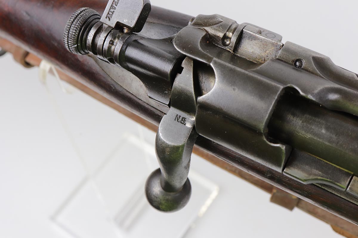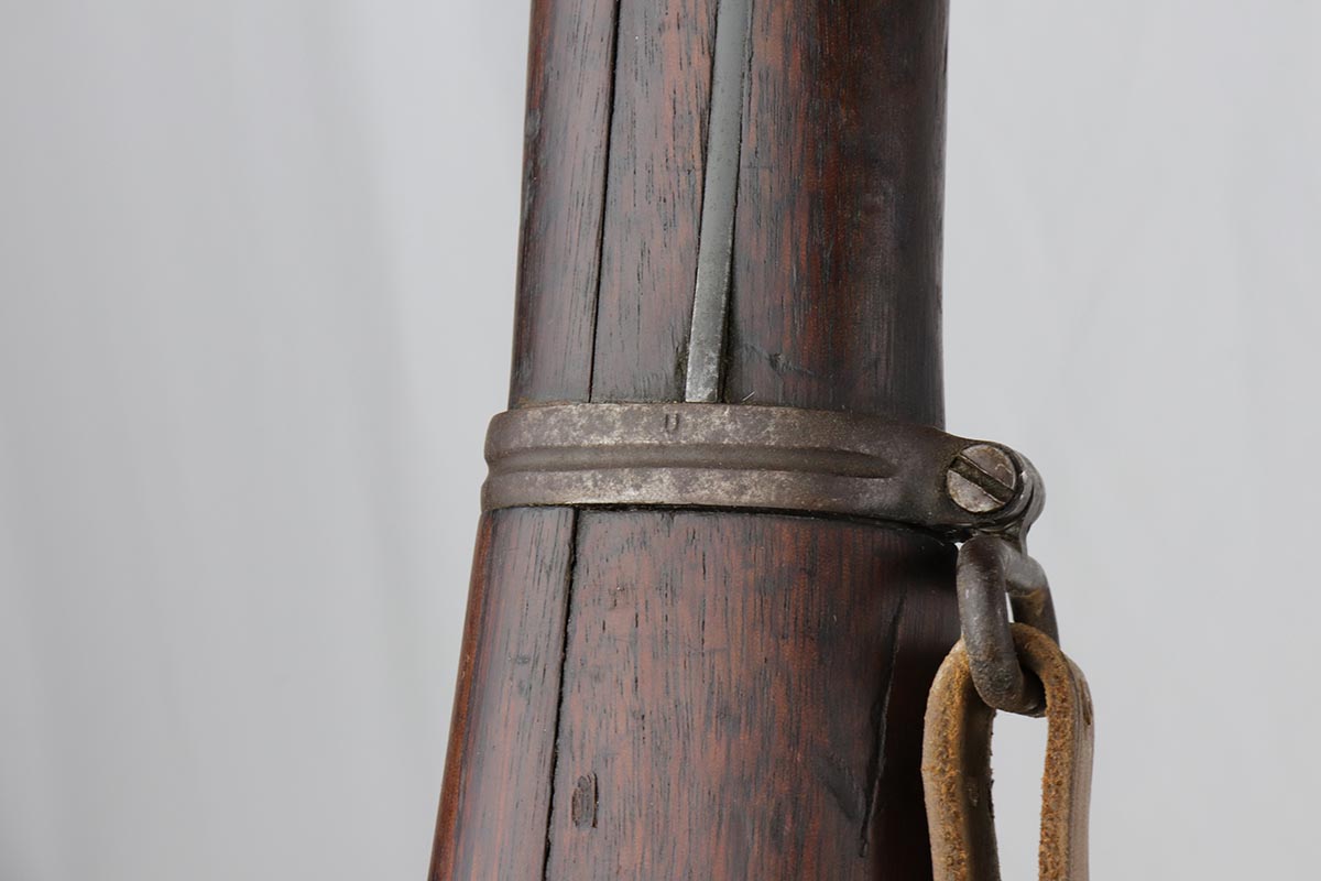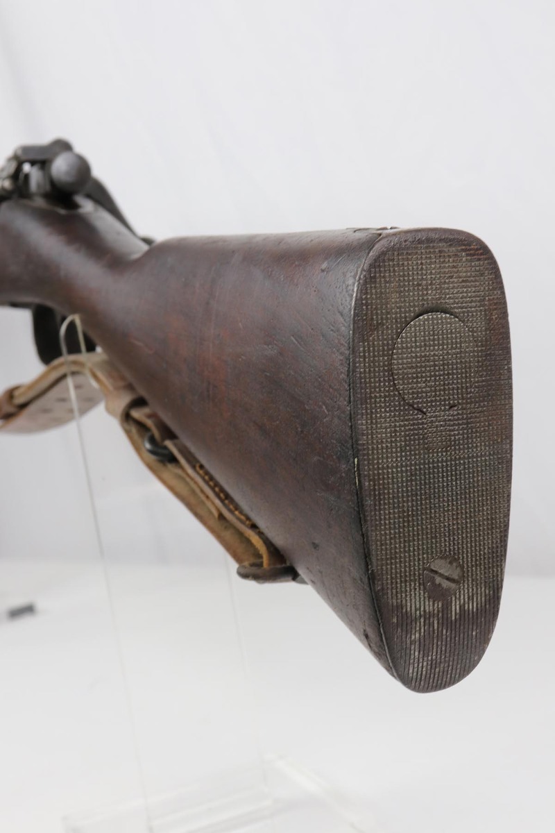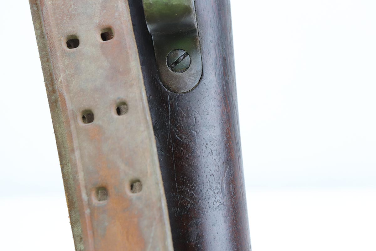 8/19/19 – This is an original Springfield model 1903 rifle, made in 1918 for use during WW1. The rifle is all original, including the original stock. The stock has an inspector stamp on the left side, and though faint you can read “O.G.E.K.” . The stock has a few minor dings and surface scratches, but no notable cracks. The metal has dark patina and light discoloration throughout the receiver and bolt assembly, as well as some finish loss on the barrel / muzzle area. The bolt has a smooth action, but the bore is fairly rough, only rating at 4/10 overall. The rifling is in tact but there’s evidence of residue / rust throughout the bore. Comes with a nice, original leather strap that appears period correct, but we don’t see any maker stamps or dates.