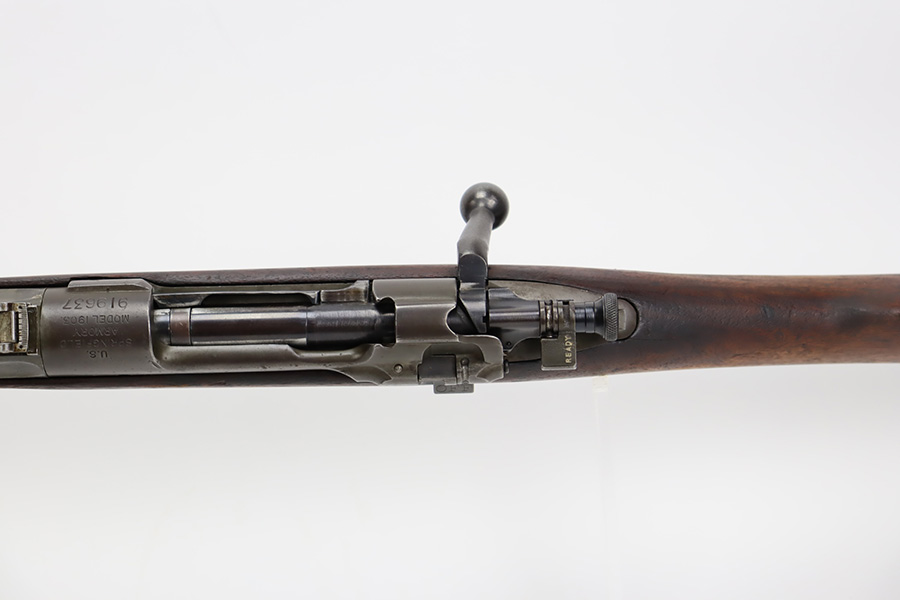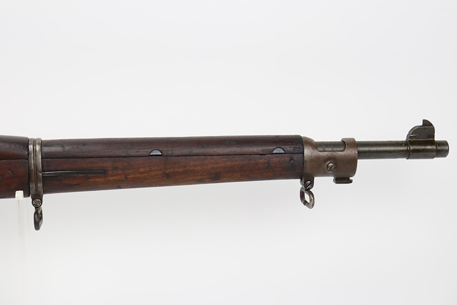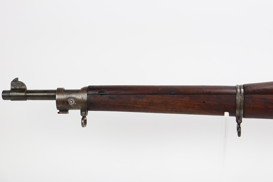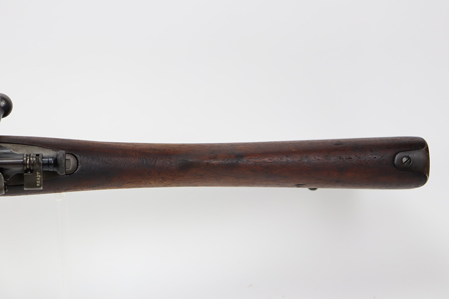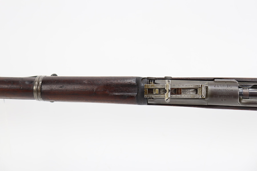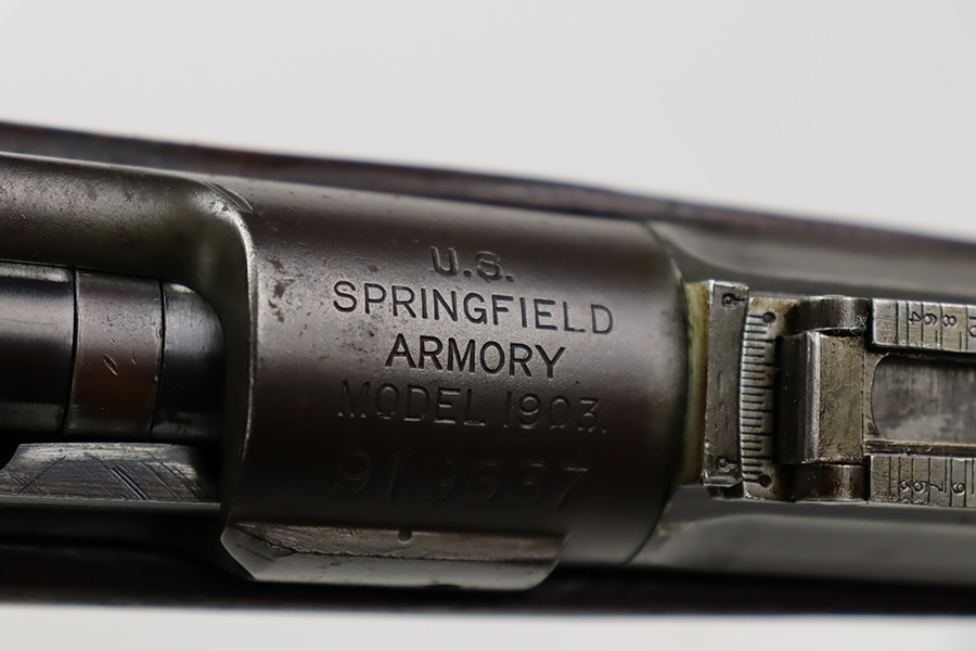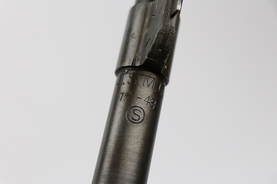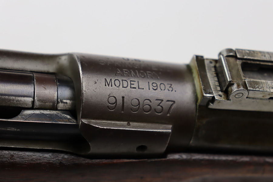 10/3/23 – This a nice Springfield Model 1903 rifle. The serial number on the receiver dates it to 1918. The barrel is USMC marked and dated October of 1943. Faint “P” proof on the wrist of the stock. The finish on the metal rates roughly 75% with thinning on the barrel, barrel bands, and floor plate/trigger group. Some light freckling and a few small pits on the receiver. The wood furniture is nice but shows the typical signs of wear – bruises and dings throughout. Mint bore.