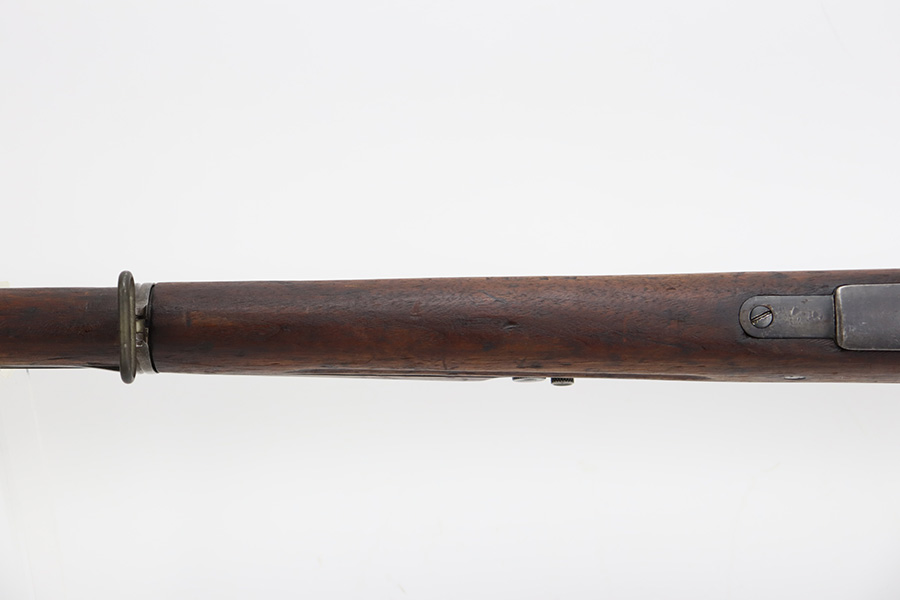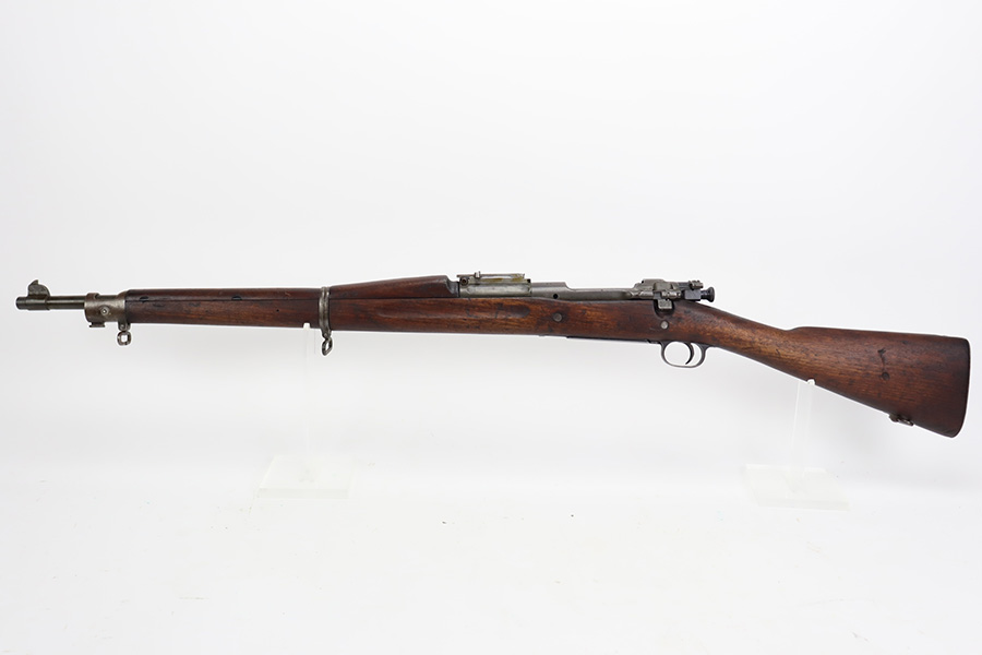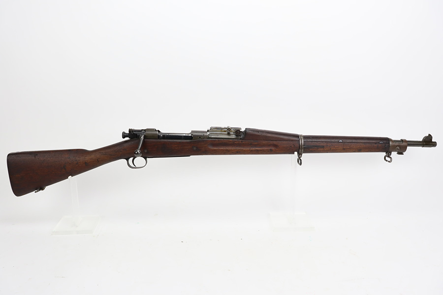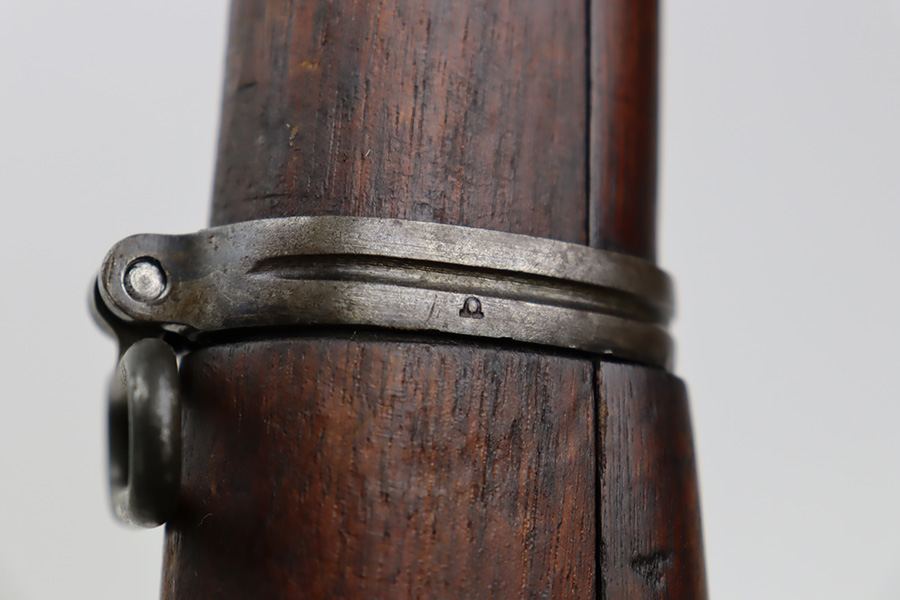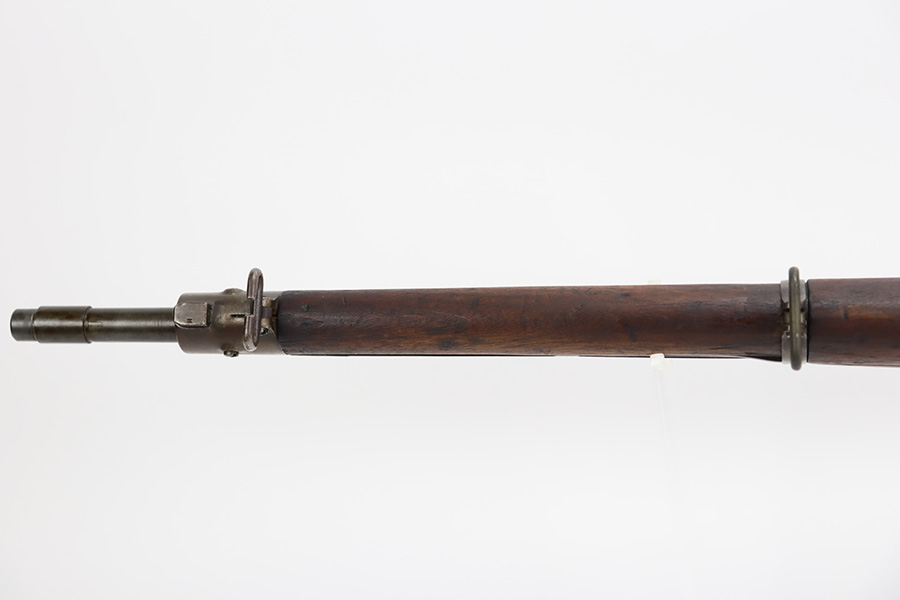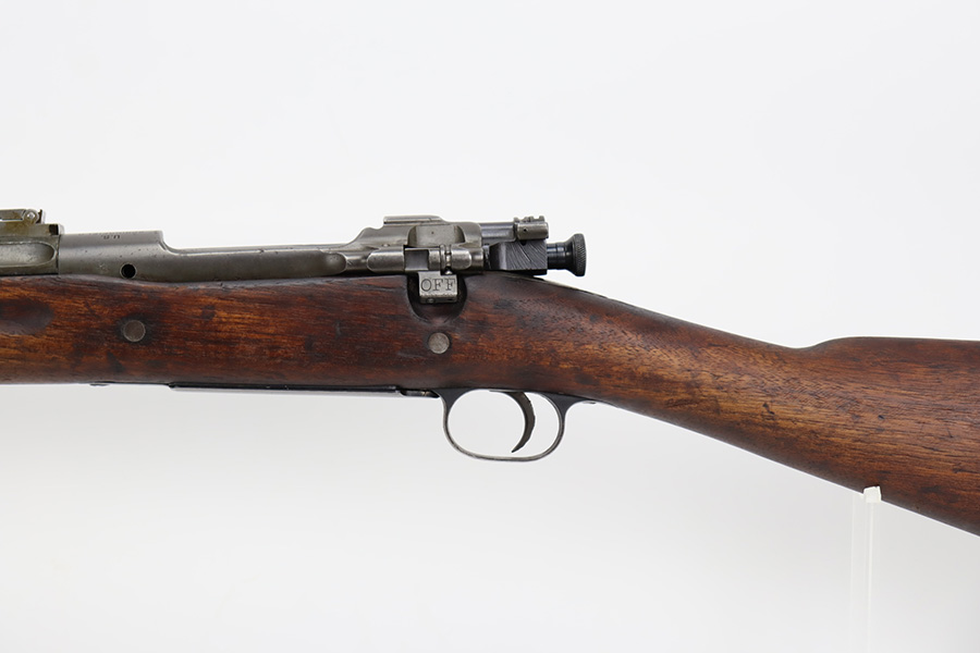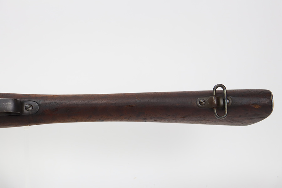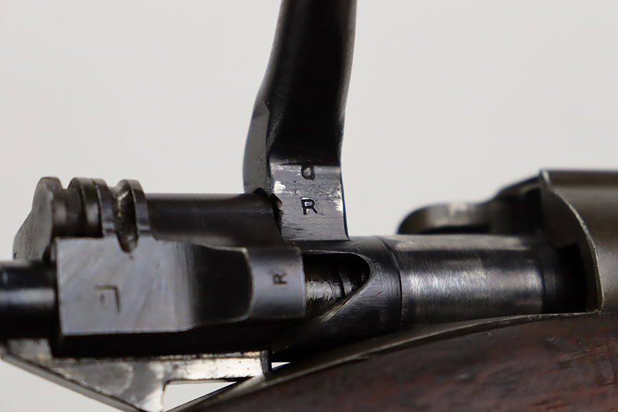 10/3/23 – This a nice Springfield Model 1903 rifle. The serial number on the receiver dates it to 1918. The barrel is USMC marked and dated October of 1943. Faint “P” proof on the wrist of the stock. The finish on the metal rates roughly 75% with thinning on the barrel, barrel bands, and floor plate/trigger group. Some light freckling and a few small pits on the receiver. The wood furniture is nice but shows the typical signs of wear – bruises and dings throughout. Mint bore.