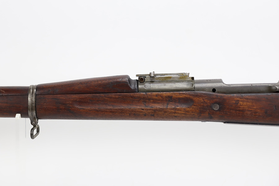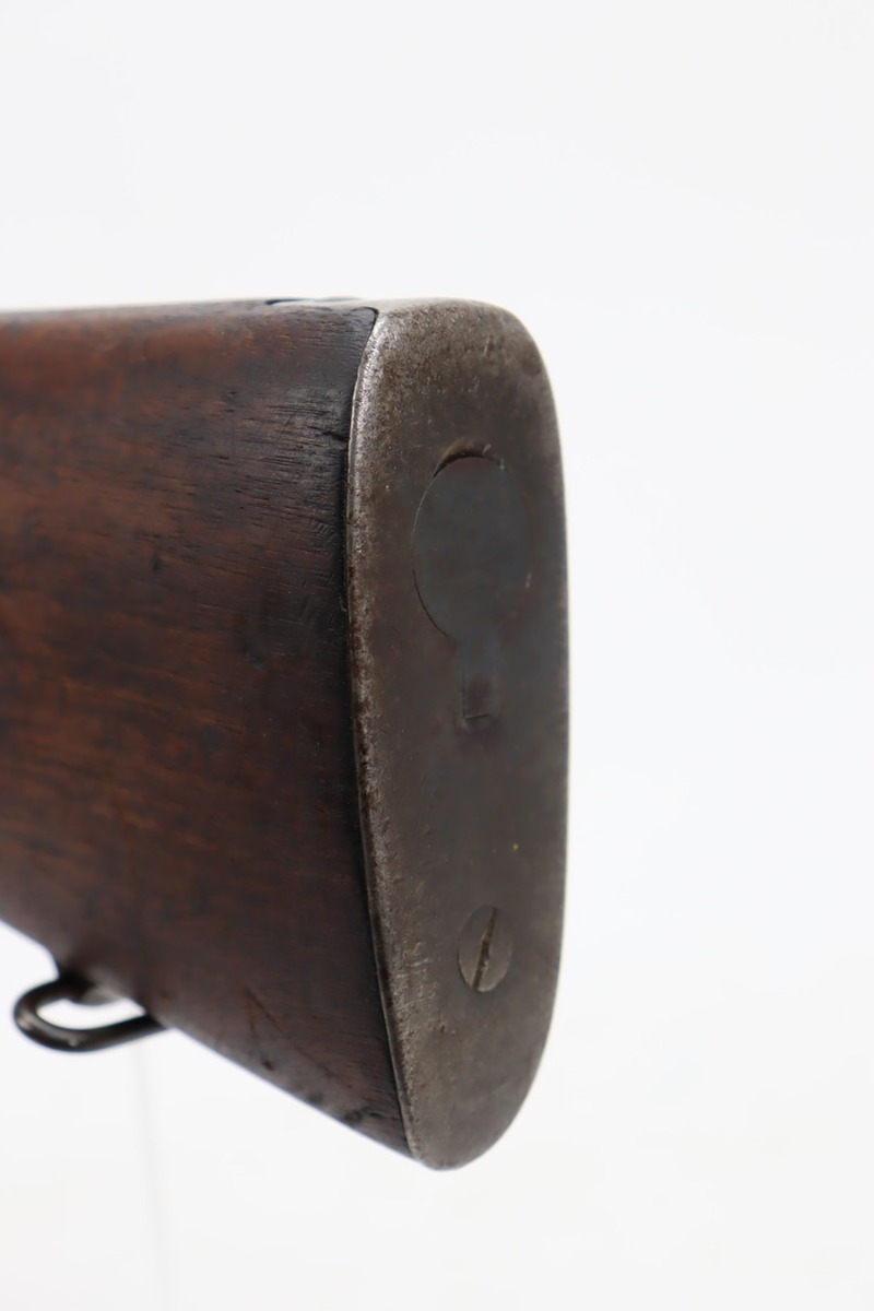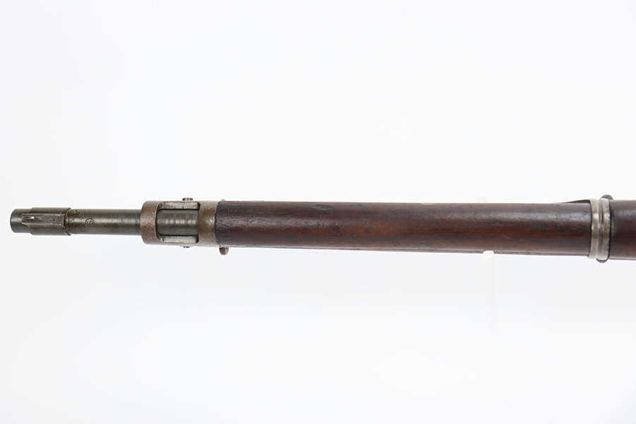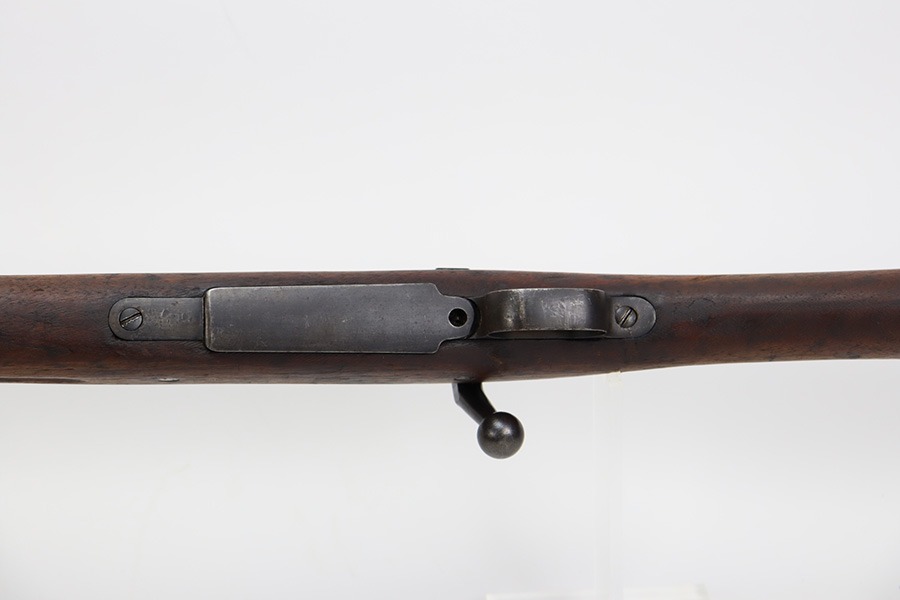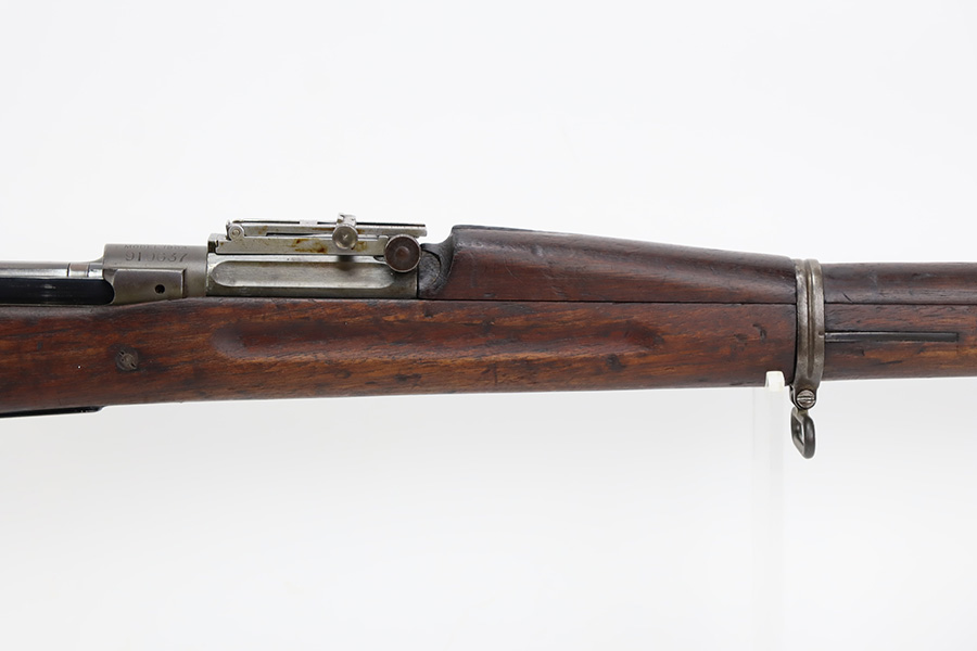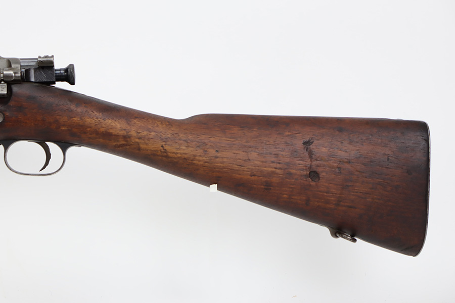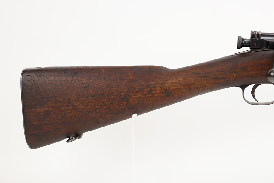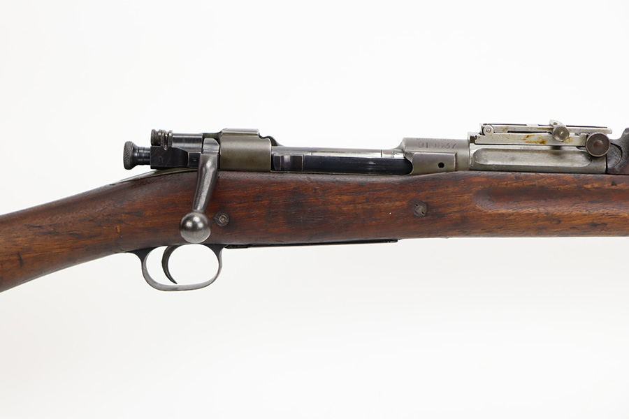 10/3/23 – This a nice Springfield Model 1903 rifle. The serial number on the receiver dates it to 1918. The barrel is USMC marked and dated October of 1943. Faint “P” proof on the wrist of the stock. The finish on the metal rates roughly 75% with thinning on the barrel, barrel bands, and floor plate/trigger group. Some light freckling and a few small pits on the receiver. The wood furniture is nice but shows the typical signs of wear – bruises and dings throughout. Mint bore.