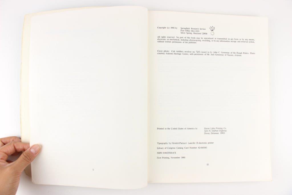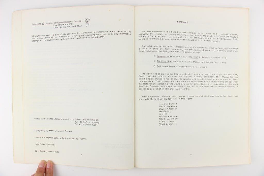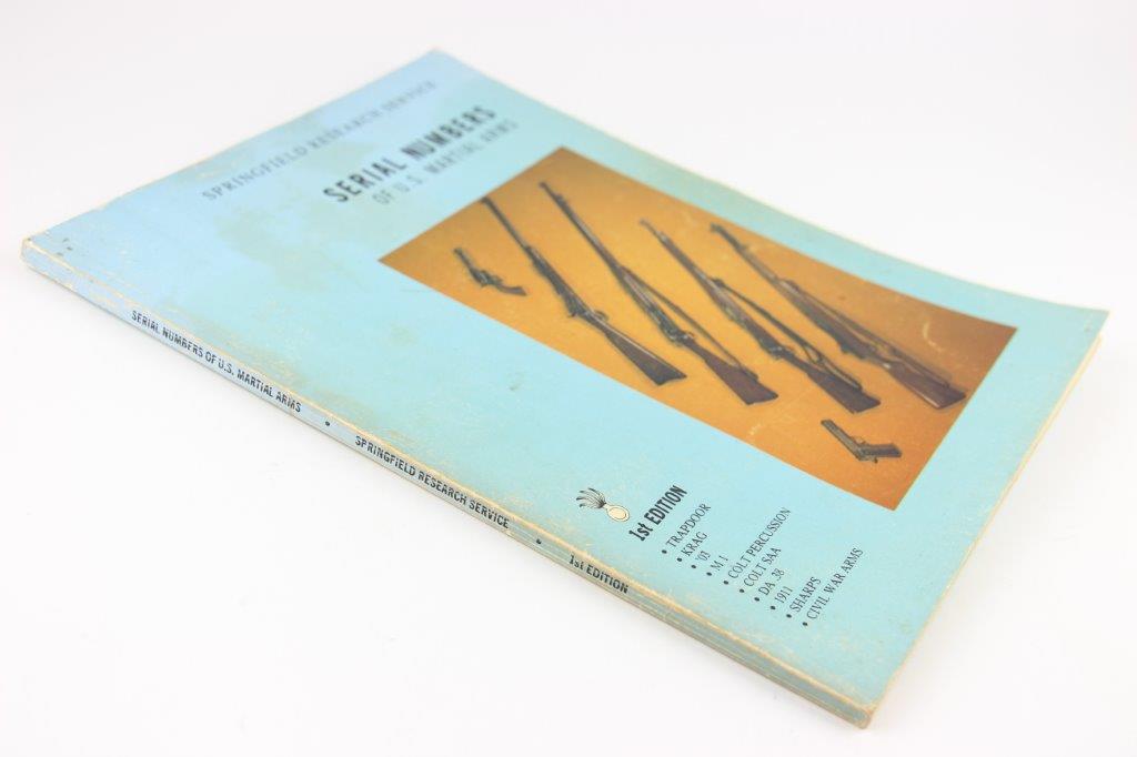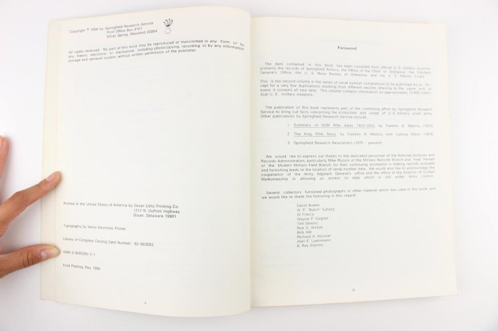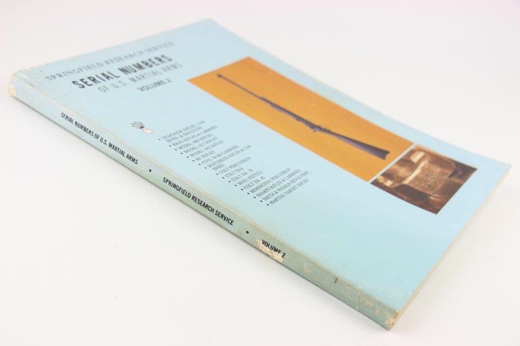 6/10/24 – This is a 3 volume book set, “Springfield Research Service: Serial Numbers of U.S. Martial Arms”. The 3 volumes are paperback 1st editions, published in 1983, 1986, and 1990. Each volume has edge wear and light surface aging on the cover and interior pages. The pages show mild yellowing but all pages are intact and tightly bound. The 3rd volume is signed by Frank Malloy. These are rare research resource books that list the serial numbers of U.S. Martial issued rifles, pistols and revolvers. Great for antique collectors!