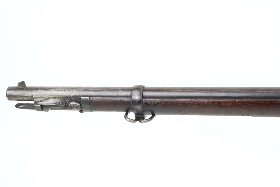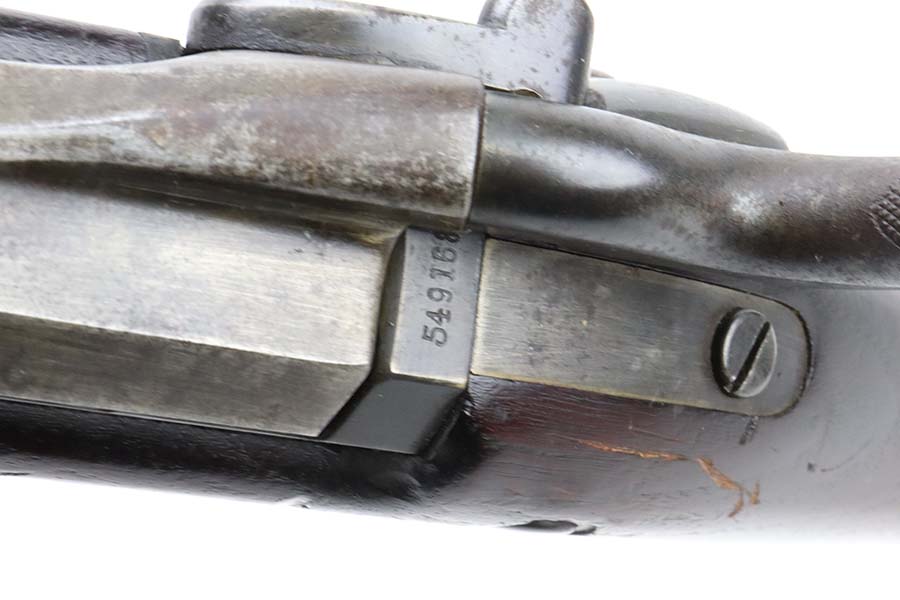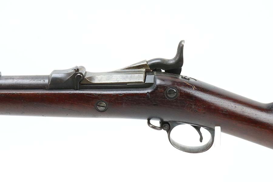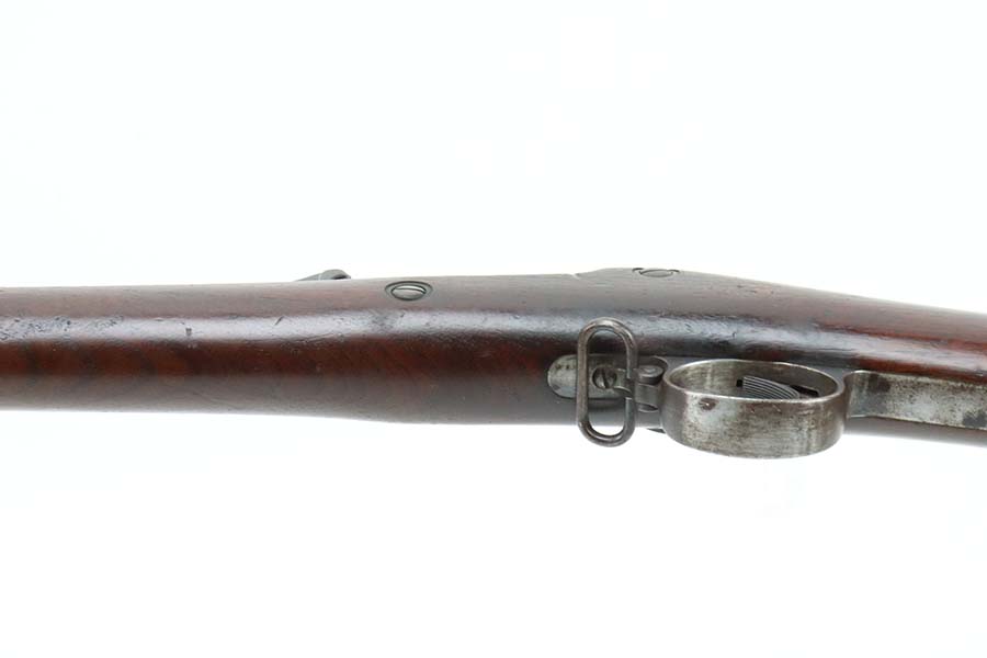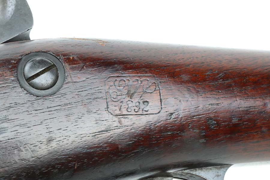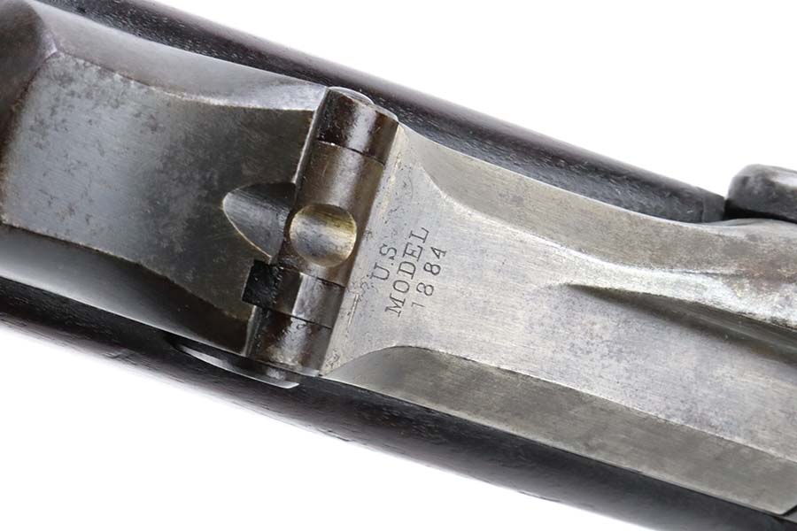 03/04/2024 – For sale is a great condition Springfield trapdoor Model 1884 made in 1892. The rifle has the rare rod bayonet where the cleaning rod can be extended and locked as a bayonet. The finish on the rifle is clean and free of rusting or active pitting. The bluing on the metal has faded away and been replaced with patina. The wood stock is clean and free of any major breaks. The toe of the stock has some small cracks. The bore is mirror bright and excellent for its age.