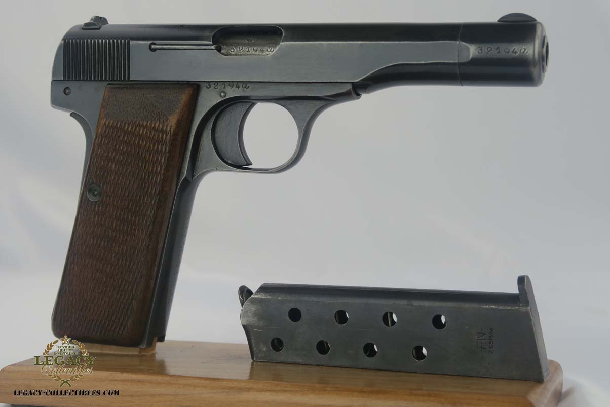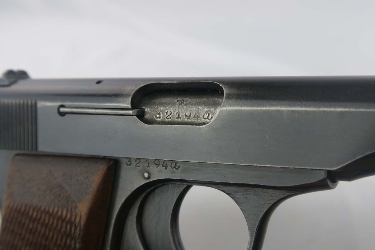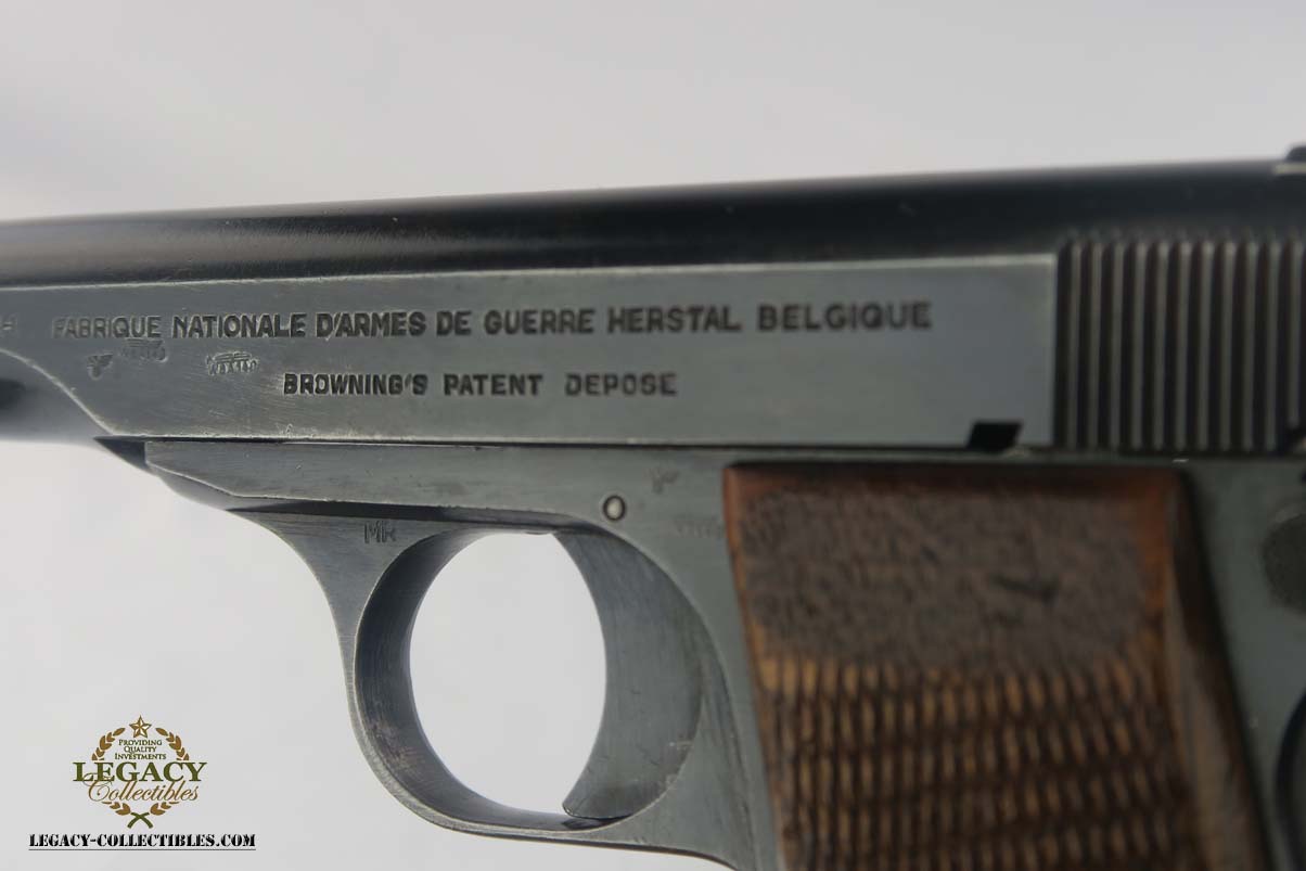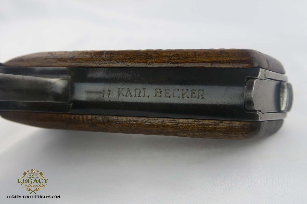 7/17/17 – This is a very nice FN model 1922. The finish rates about 96%, with most of the wear on either side of the barell. It has waffen 140 acceptance proofs on the slide, frame and barrel.  All numbers are matching.  Caliber is 7.65mm.  Minty bore. The front strap is marked ‘SS Karl Becker’.  Of course, this is tough to PROVE as authentic, but it does look to be aged with mostly patina in the engraving.   Comes with a document from a Karl Becker, SS reserve officer.  Googling his name I found an interesting story about Karl W. Becker, who was a leader of the Hitler Youth.  Must have been a smart guy as he “disappeared” from Germany in 1944 and later was found alive in 1996.  Cant say this is the same Karl Becker, but it is possible.
