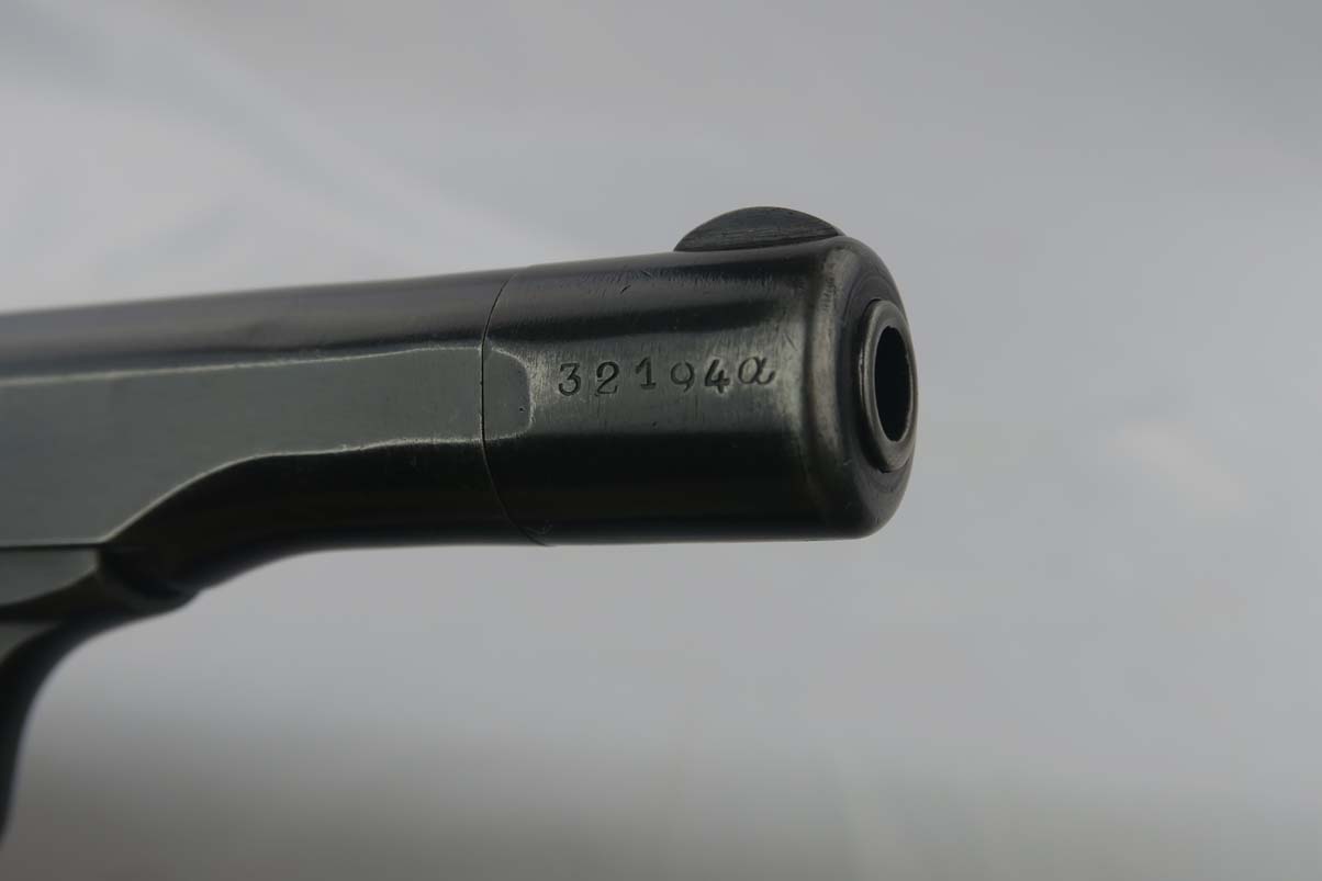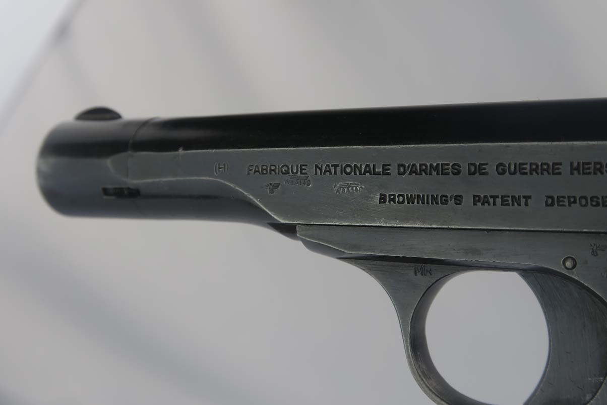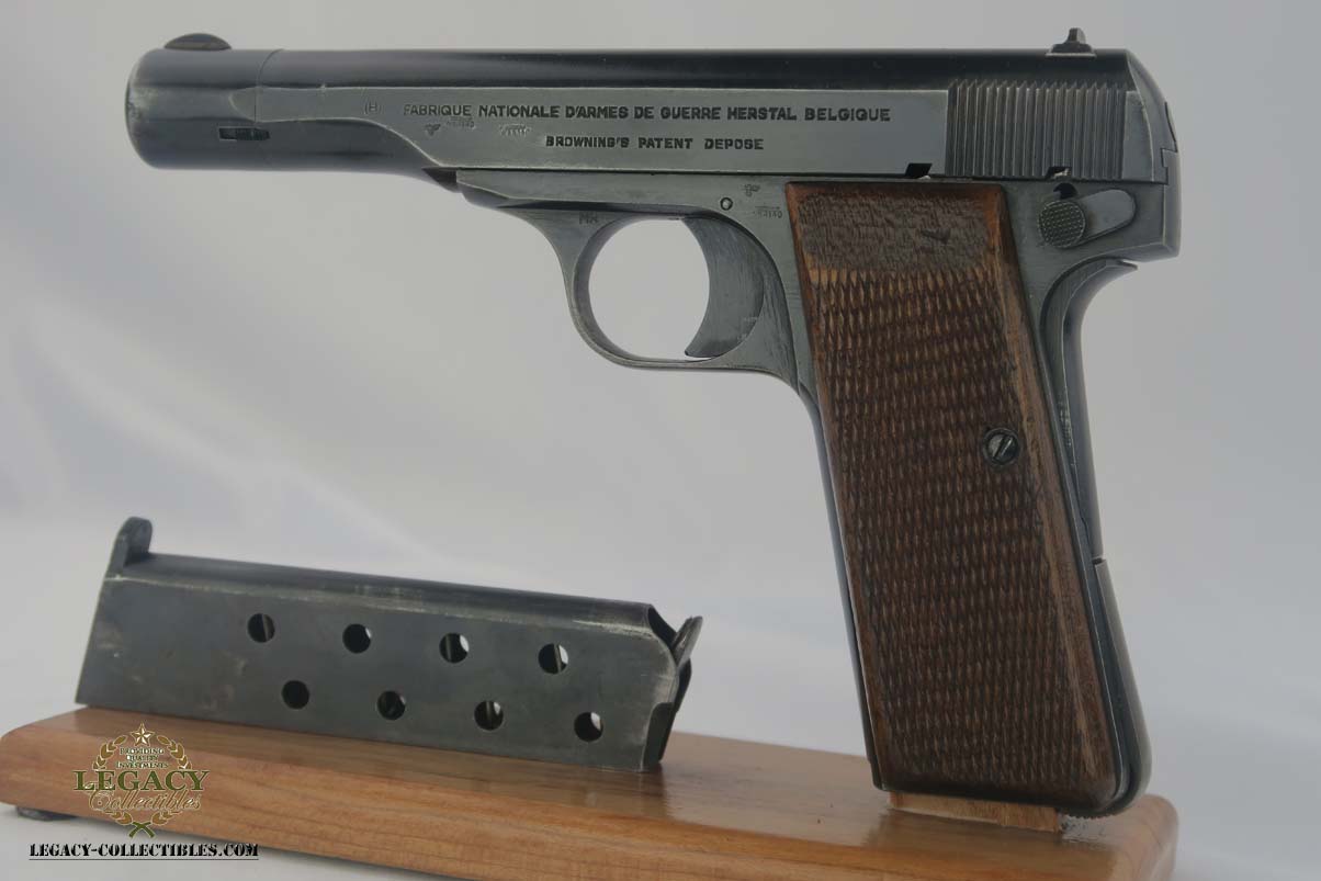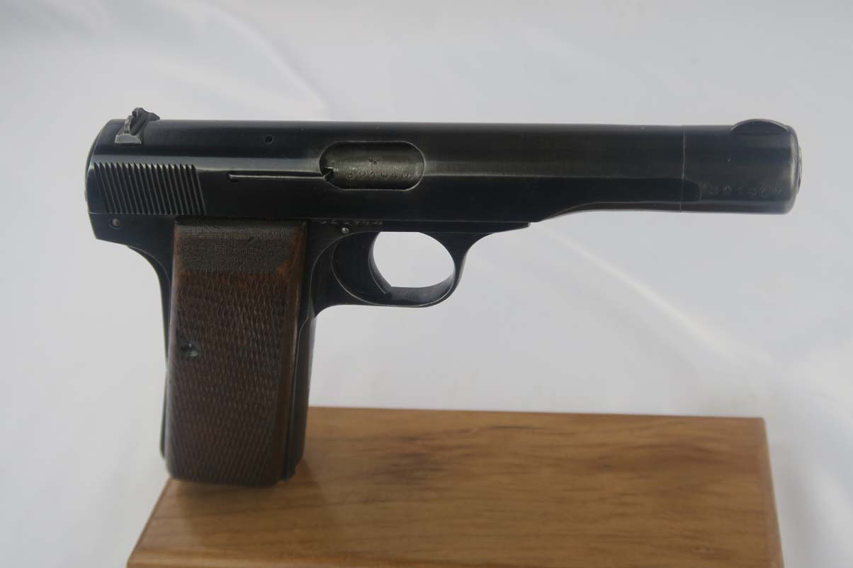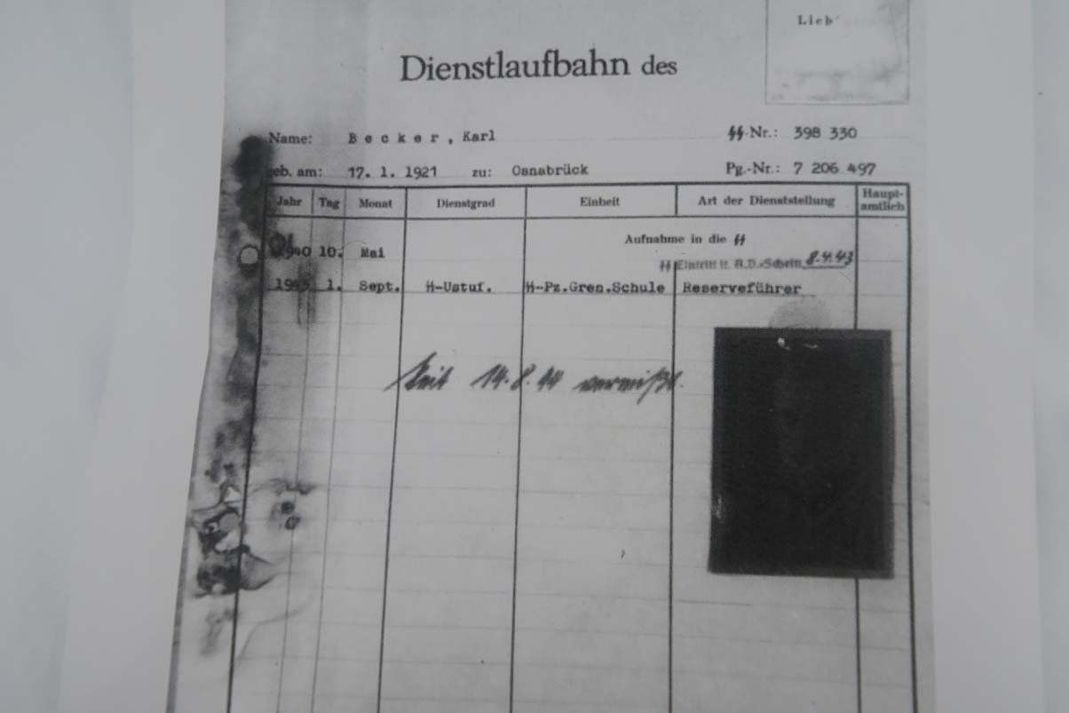 7/17/17 – This is a very nice FN model 1922. The finish rates about 96%, with most of the wear on either side of the barell. It has waffen 140 acceptance proofs on the slide, frame and barrel.  All numbers are matching.  Caliber is 7.65mm.  Minty bore. The front strap is marked ‘SS Karl Becker’.  Of course, this is tough to PROVE as authentic, but it does look to be aged with mostly patina in the engraving.   Comes with a document from a Karl Becker, SS reserve officer.  Googling his name I found an interesting story about Karl W. Becker, who was a leader of the Hitler Youth.  Must have been a smart guy as he “disappeared” from Germany in 1944 and later was found alive in 1996.  Cant say this is the same Karl Becker, but it is possible.