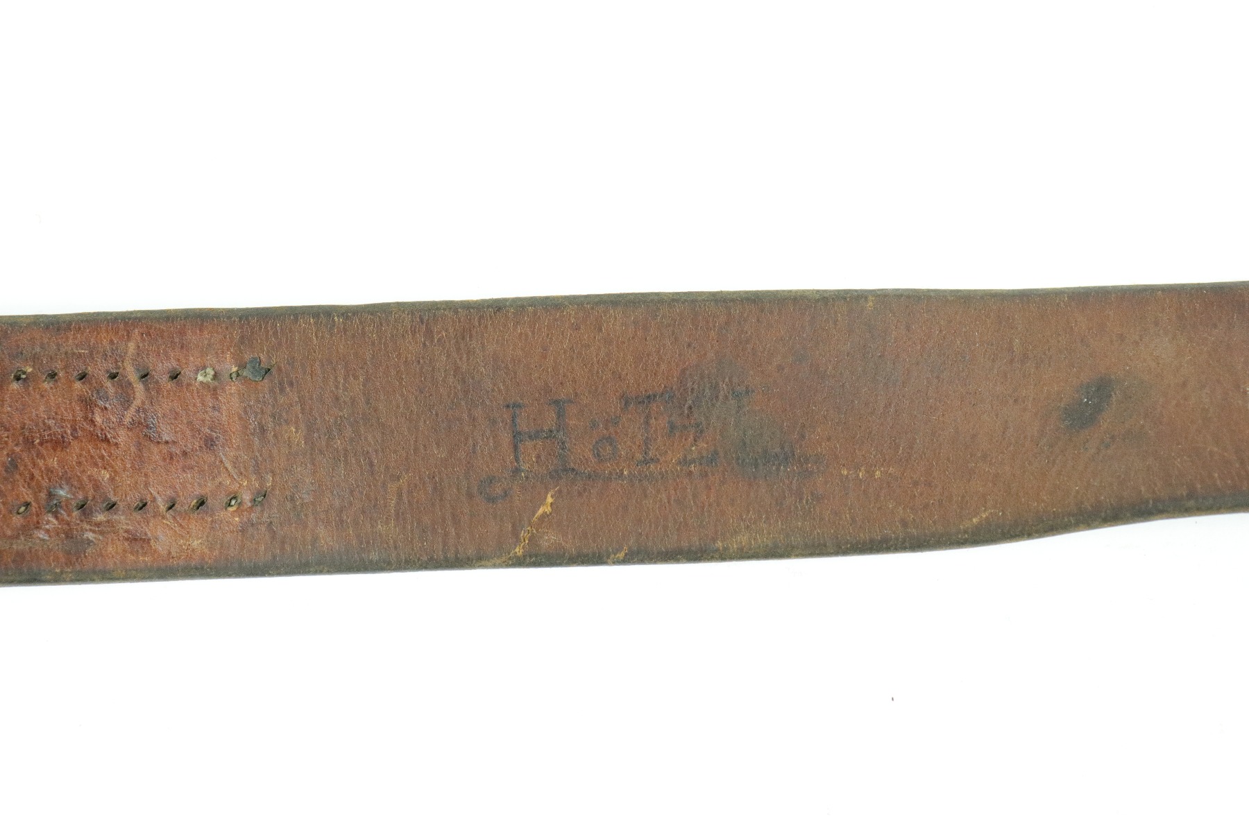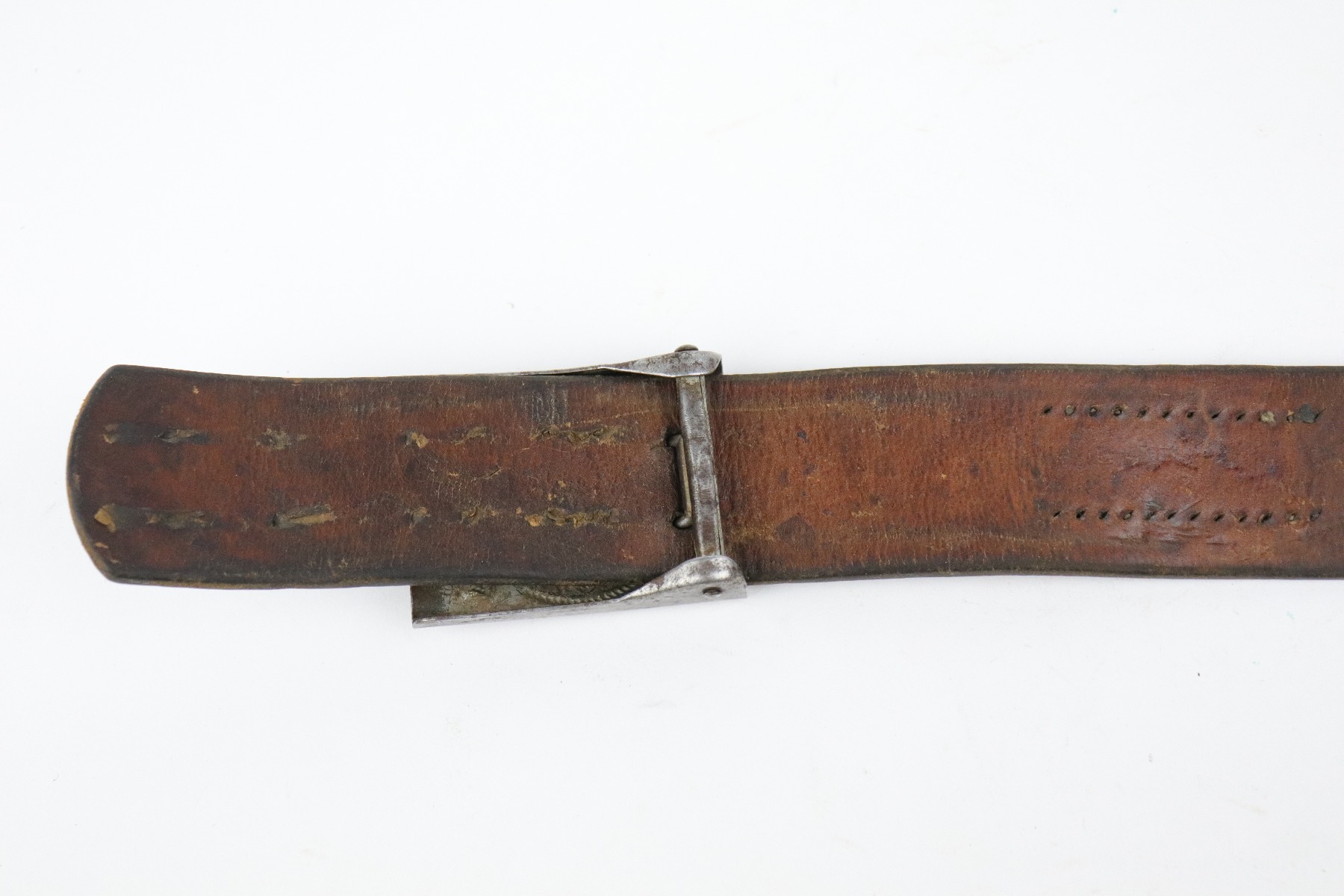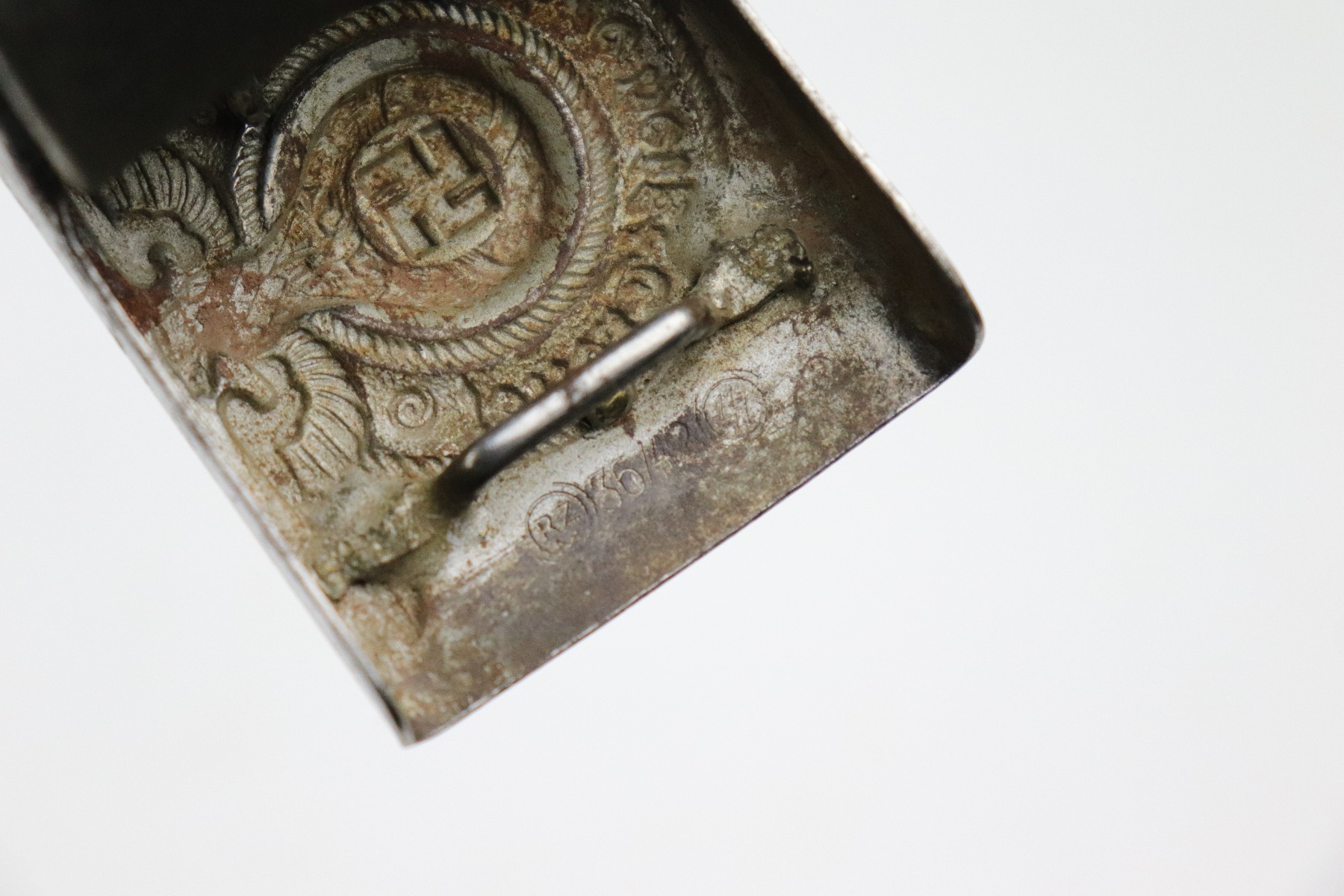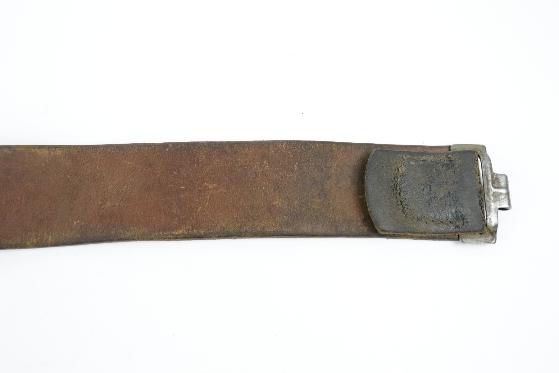 8/18/20 – This is an original belt and buckle issued to the Nazi SS. The buckle has SS runes on the inside and is marked “RZM 36/42”. The insignia on the buckle is in tact, but most of the buckle is covered in spotty brown patina. The leather belt is mostly in tact, but there is light cracking in the leather throughout. The name “Hoetzl” is written on the inside. There is an area of missing stitches on the inside and two rows of gouges from the buckle. The leather belt is soft and workable.