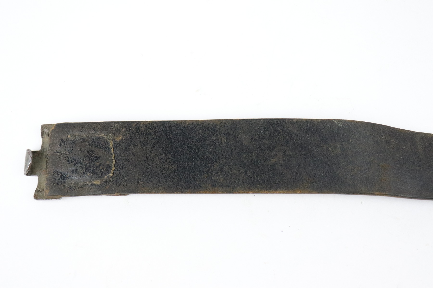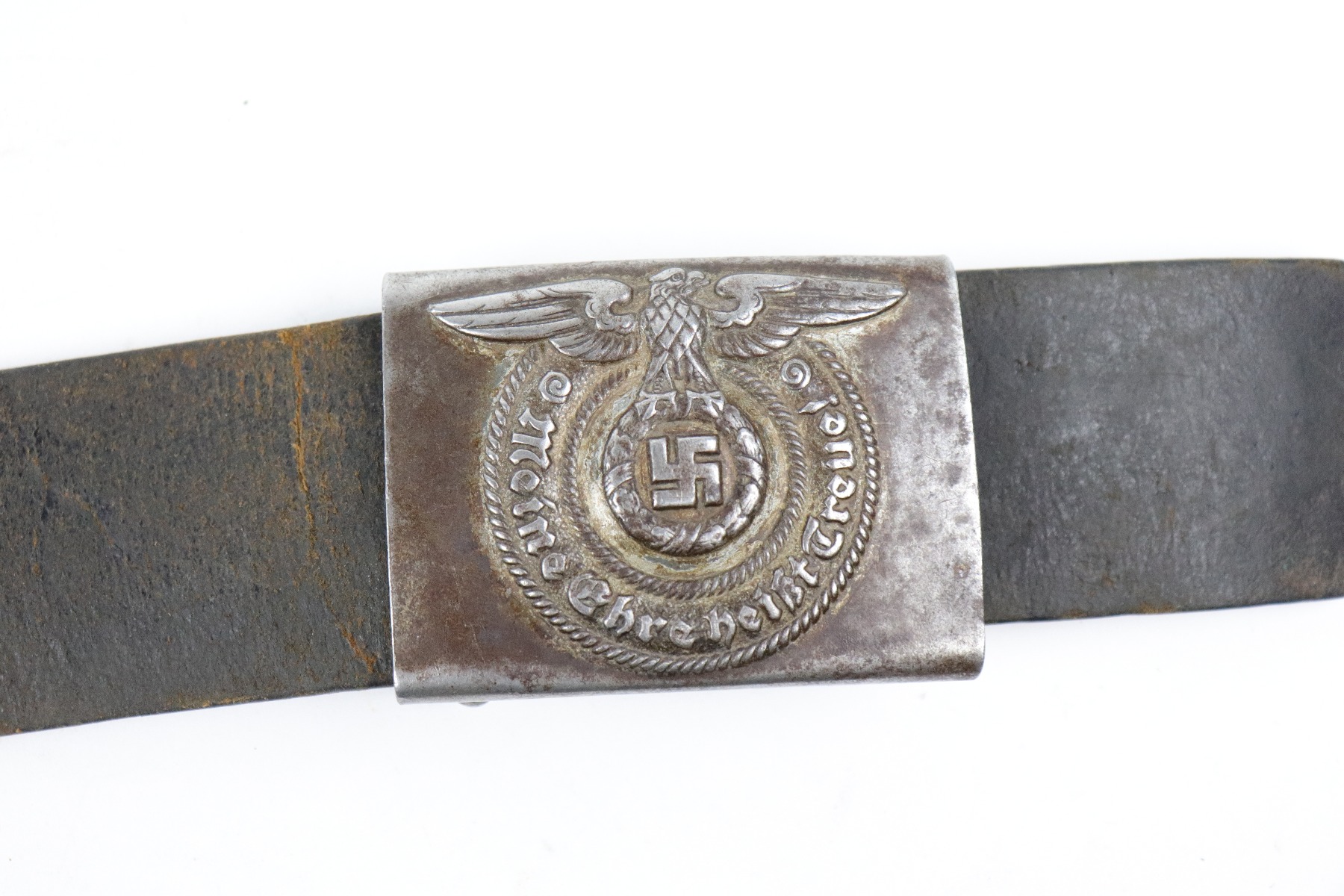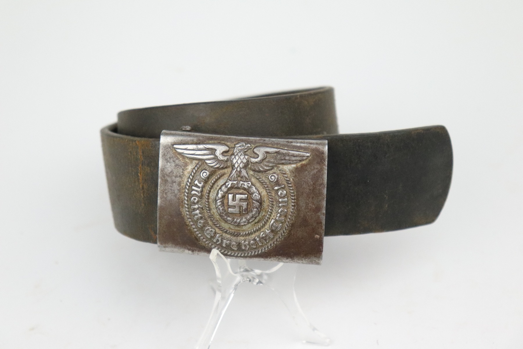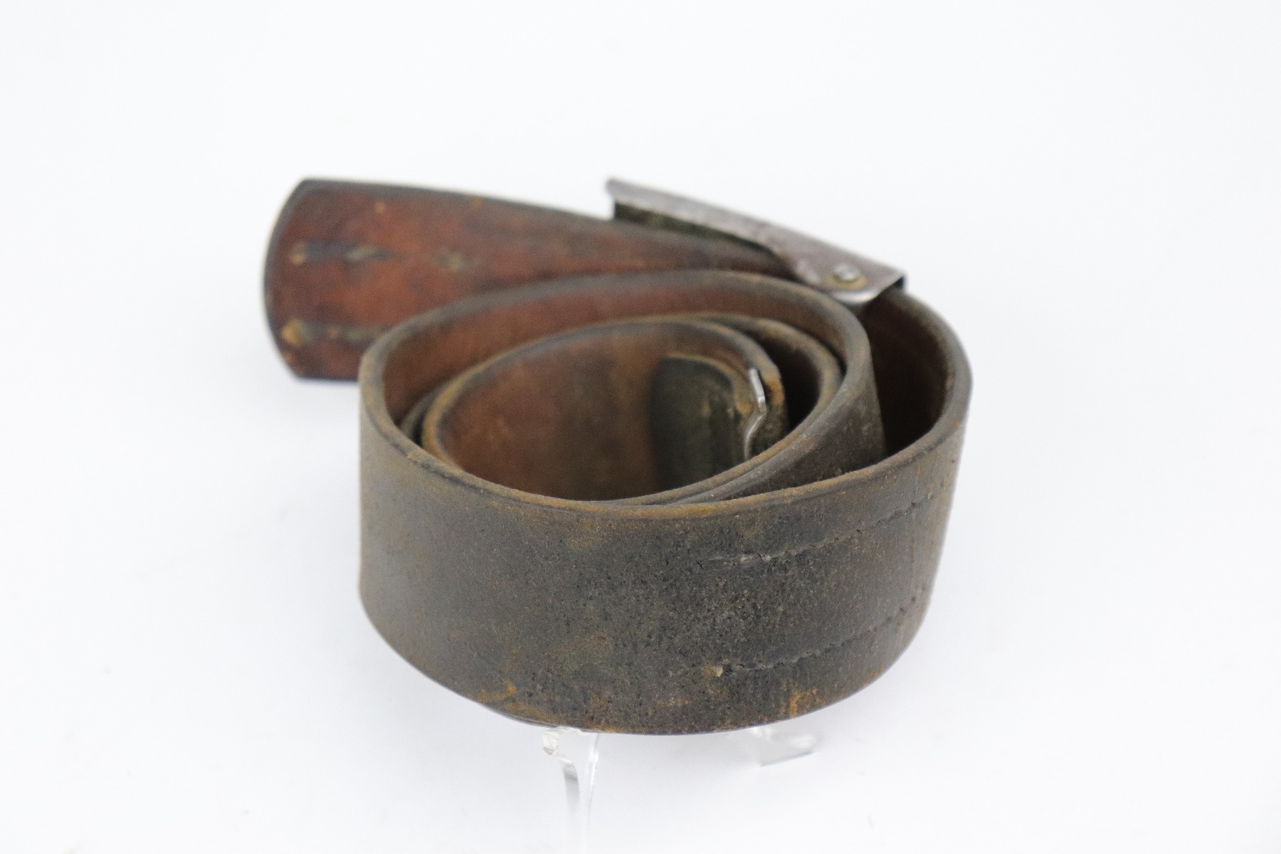 8/18/20 – This is an original belt and buckle issued to the Nazi SS. The buckle has SS runes on the inside and is marked “RZM 36/42”. The insignia on the buckle is in tact, but most of the buckle is covered in spotty brown patina. The leather belt is mostly in tact, but there is light cracking in the leather throughout. The name “Hoetzl” is written on the inside. There is an area of missing stitches on the inside and two rows of gouges from the buckle. The leather belt is soft and workable.