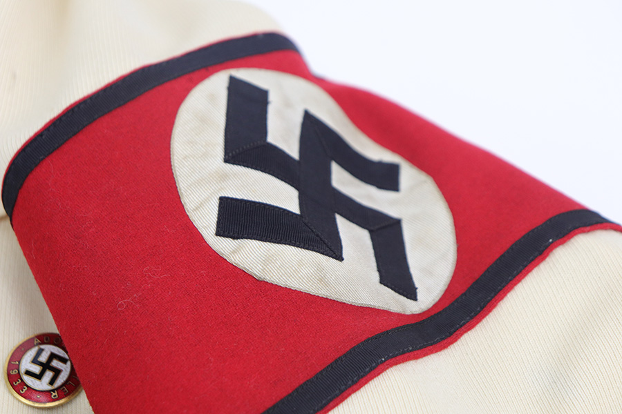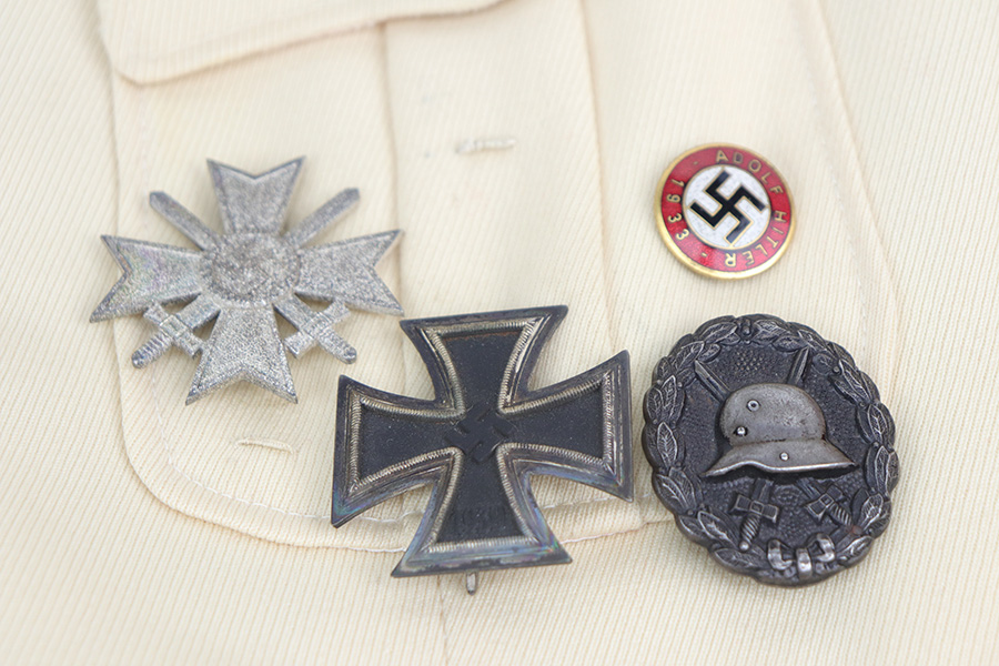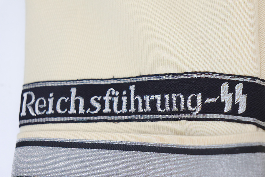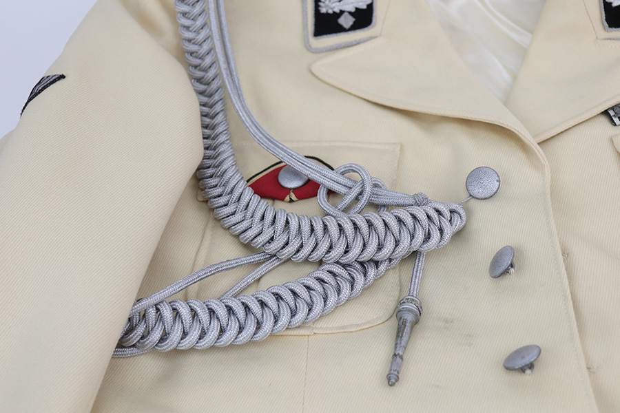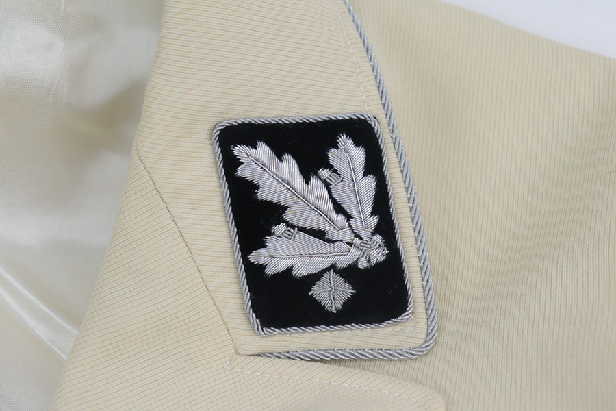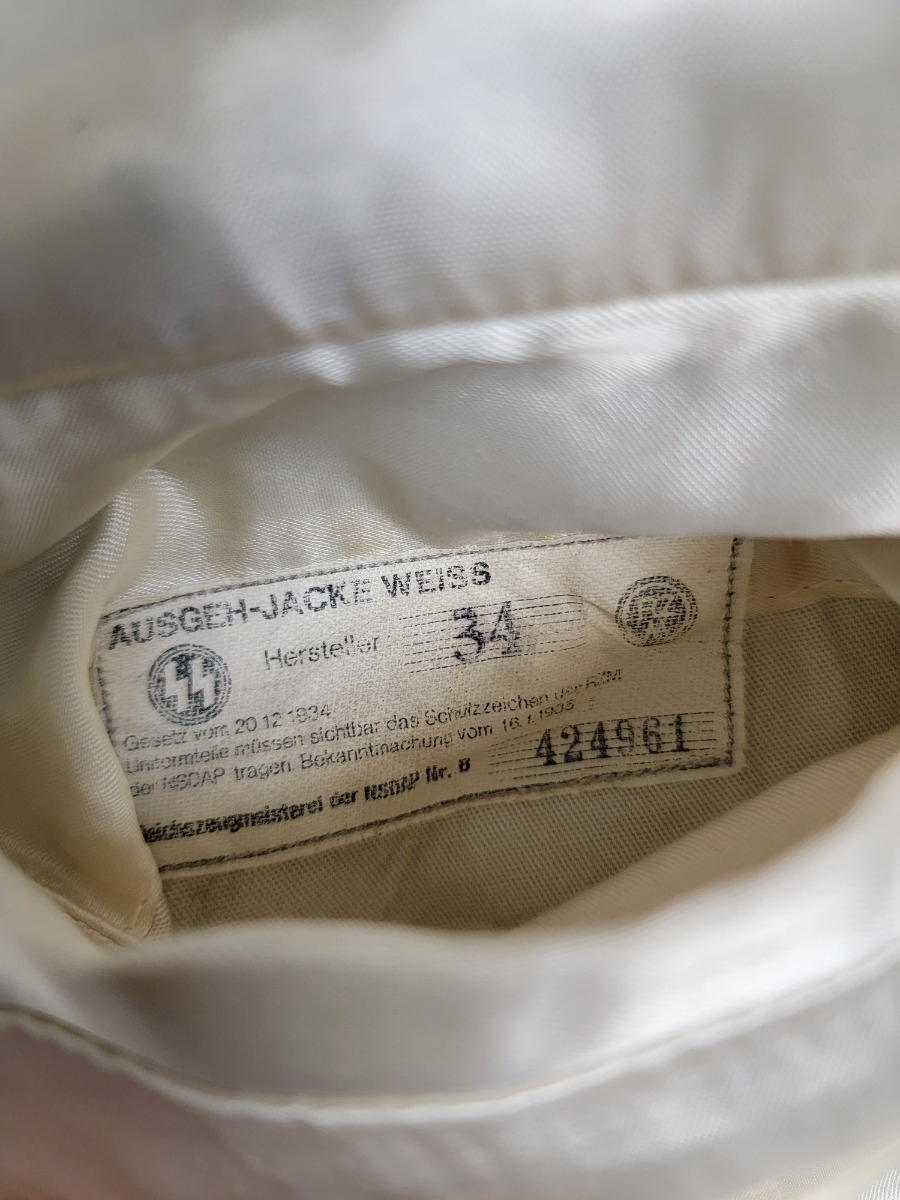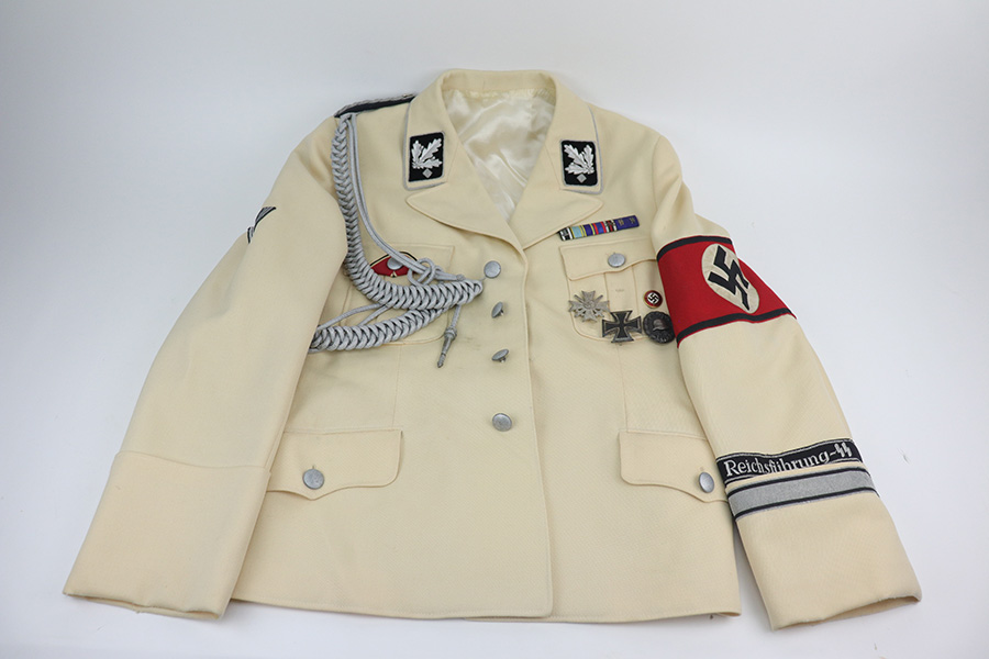 11/22/21 – This is a rare WW2 Nazi SS Officer’s Summer Tunic. The tunic has a Reichsfuhrung band and a silver cuff band, as well as multiple medals attached. We believe the silver cuff is not original, but the Reichsfuhrung looks correct based on a few expert opinions. The 4 pins and medals attached to the breast pocket are not original. The ribbon above these medals as well as the collar tabs are also reproduction. We do believe the SS armband is original, however. The tunic has no holes or notable stains. All stitching is in great condition and original. The shoulder boards have mild aging and are in great overall condition. The original tag is still visible inside the interior pocket – see images.