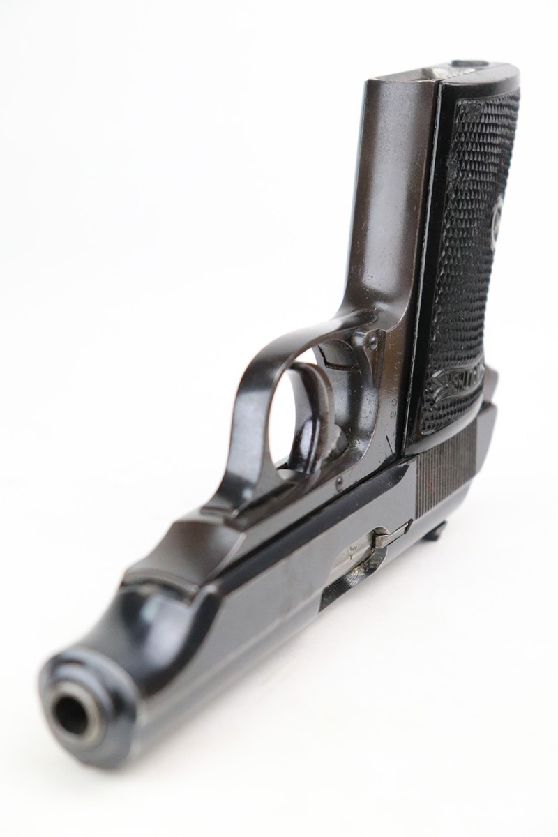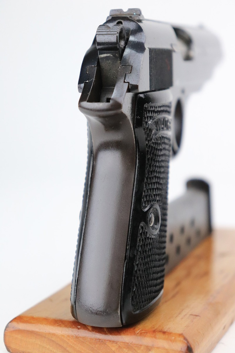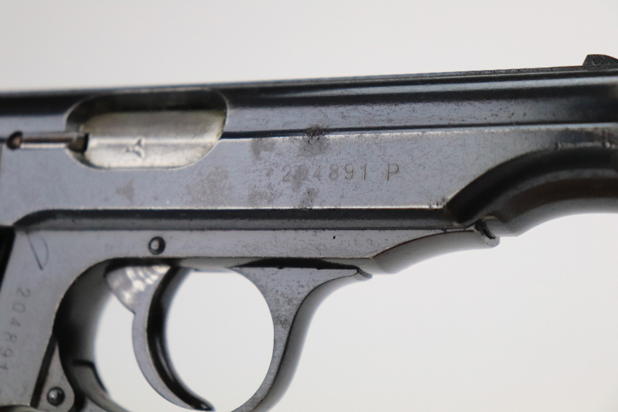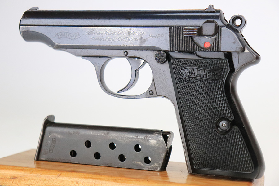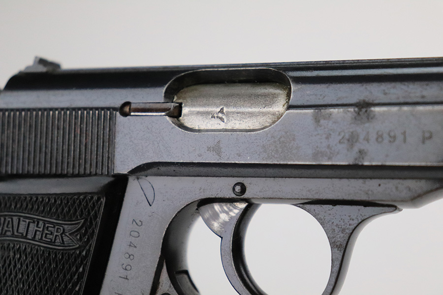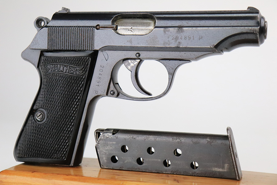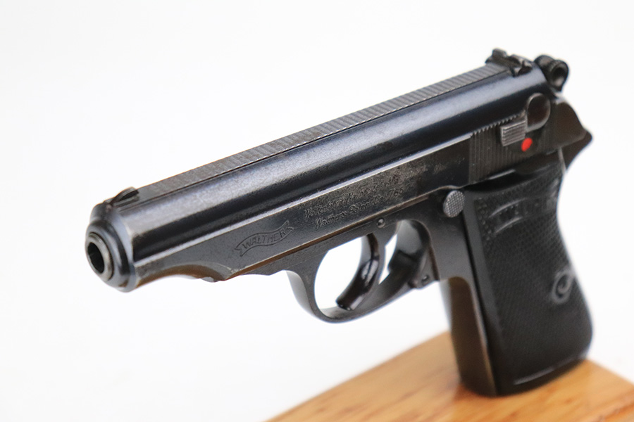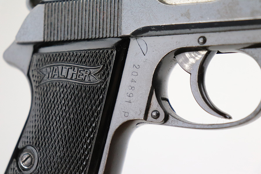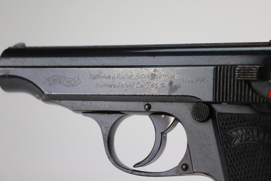8/2/22 – This is a nice example of a rare SS-contract Walther PP manufactured in 1940. This gun is all matching and is in the correct serial range for an SS-issued gun. It also comes with one original matching-numbered magazine. The gun has retained about 95% of its original finish with an area of obvious wear on the left side of the slide. While there isn’t a lot of actual finish loss, there is noticeable brown patina, general dulling of the finish, and spotty oxidation throughout. Some small spots of more noticeable oxidation on the right side of the slide. Comes with nice black bakelite grips – a couple of tiny chips on the right side. The bore has great rifling, but there is light freckling throughout.