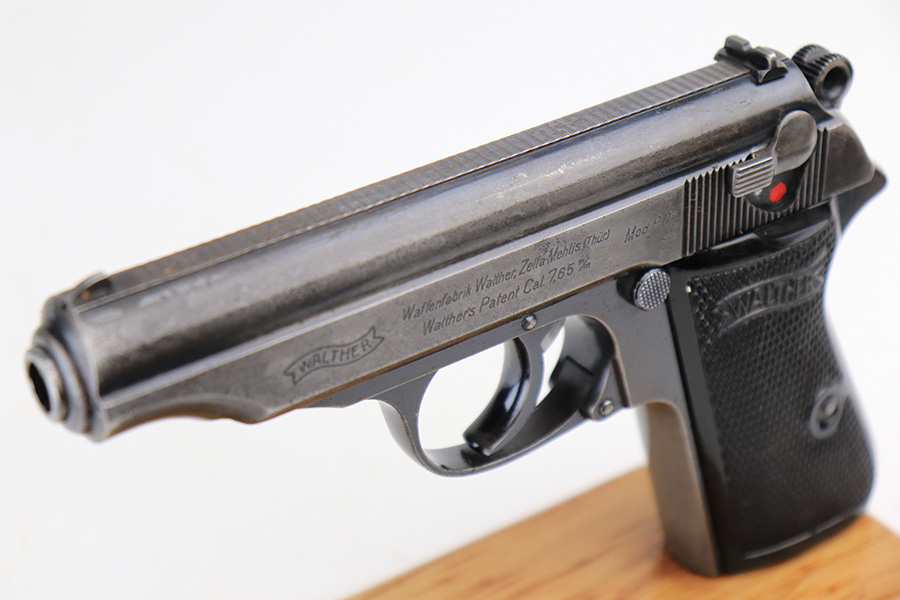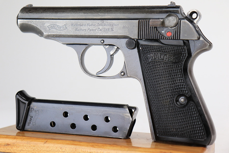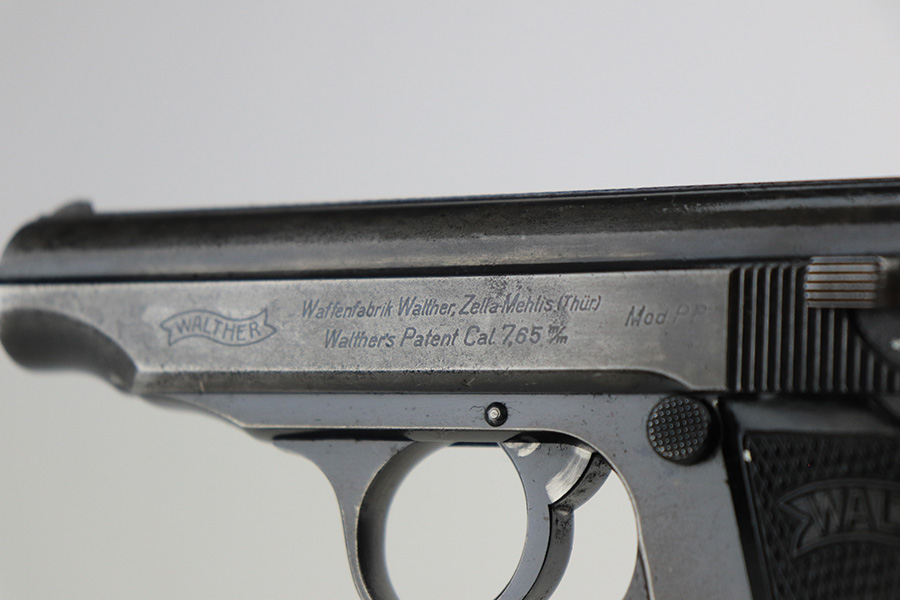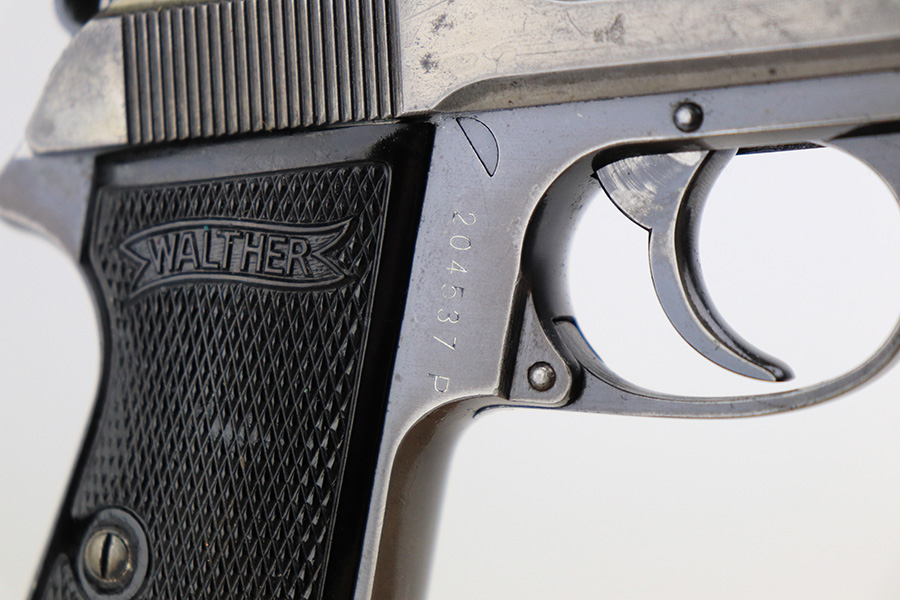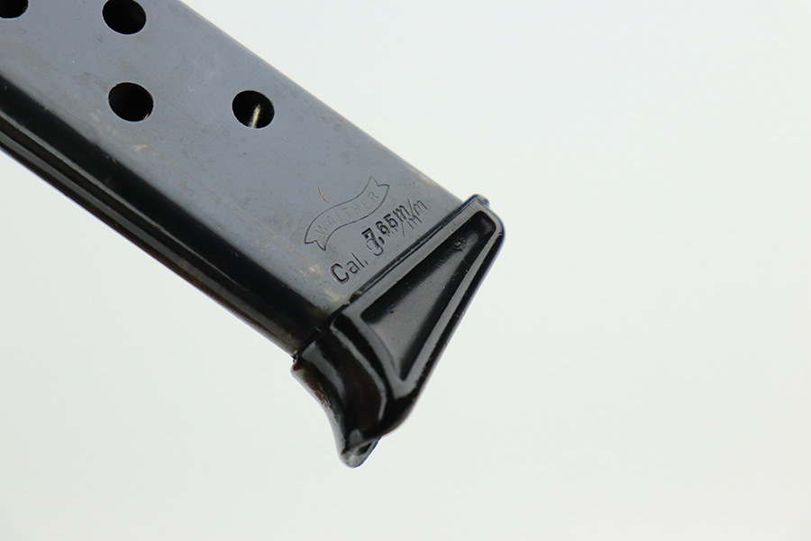 5/26/22 – This is a nice example of a Walther PP issued to the SS in 1940. The gun is all matching and has the proper “Eagle N” firing proofs. It is in the correct serial range for an SS-contract gun and comes with one original matching-numbered finger extension magazine. This particular magazine is unique because it has a factory over-stamp on the caliber legend. It was originally labeled 9mm and was changed to 7.65mm. The gun itself has lost most of its original bluing with only roughly 15% remaining. There is spotty brown patina on the back strap and areas of tiny pin-pricking along the whole slide. Comes with excellent period-correct grips. The bore is near-mint.