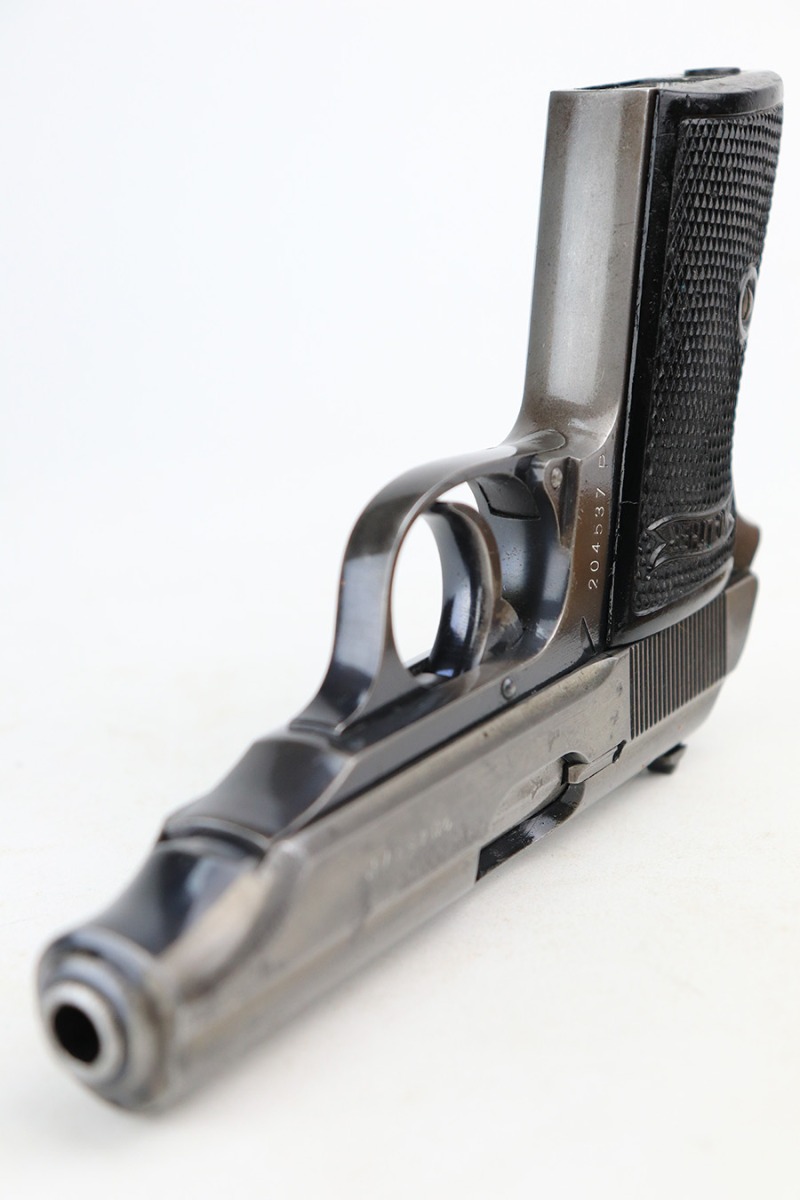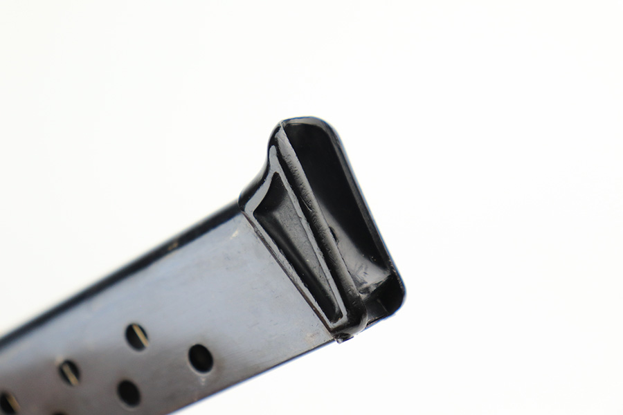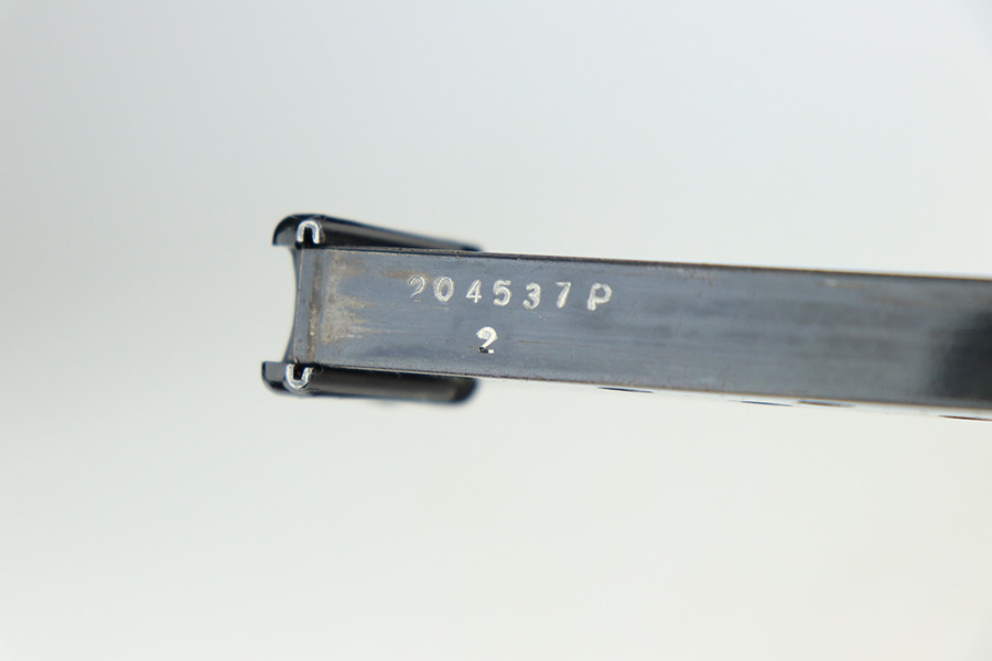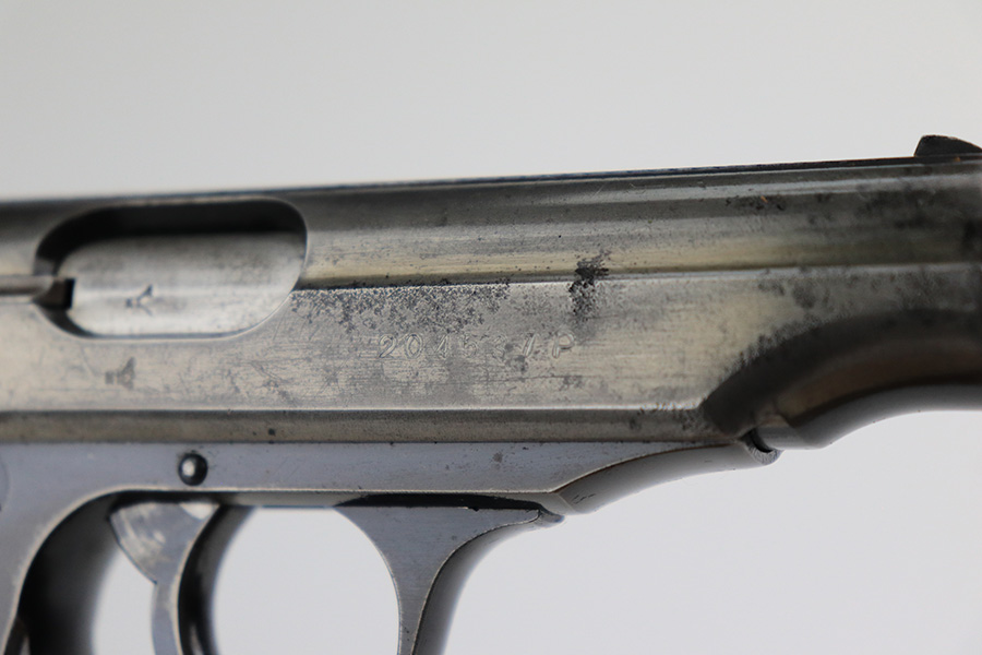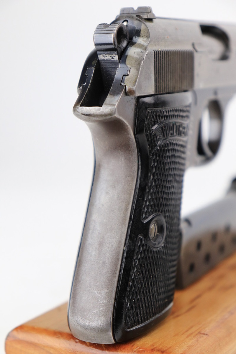 5/26/22 – This is a nice example of a Walther PP issued to the SS in 1940. The gun is all matching and has the proper “Eagle N” firing proofs. It is in the correct serial range for an SS-contract gun and comes with one original matching-numbered finger extension magazine. This particular magazine is unique because it has a factory over-stamp on the caliber legend. It was originally labeled 9mm and was changed to 7.65mm. The gun itself has lost most of its original bluing with only roughly 15% remaining. There is spotty brown patina on the back strap and areas of tiny pin-pricking along the whole slide. Comes with excellent period-correct grips. The bore is near-mint.