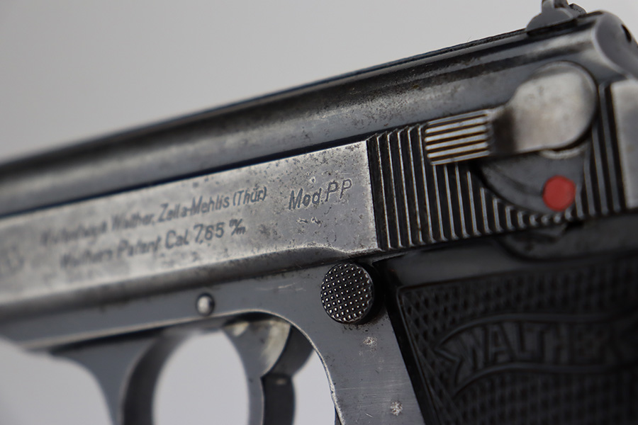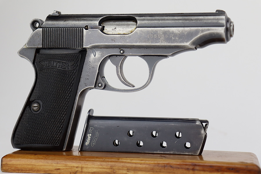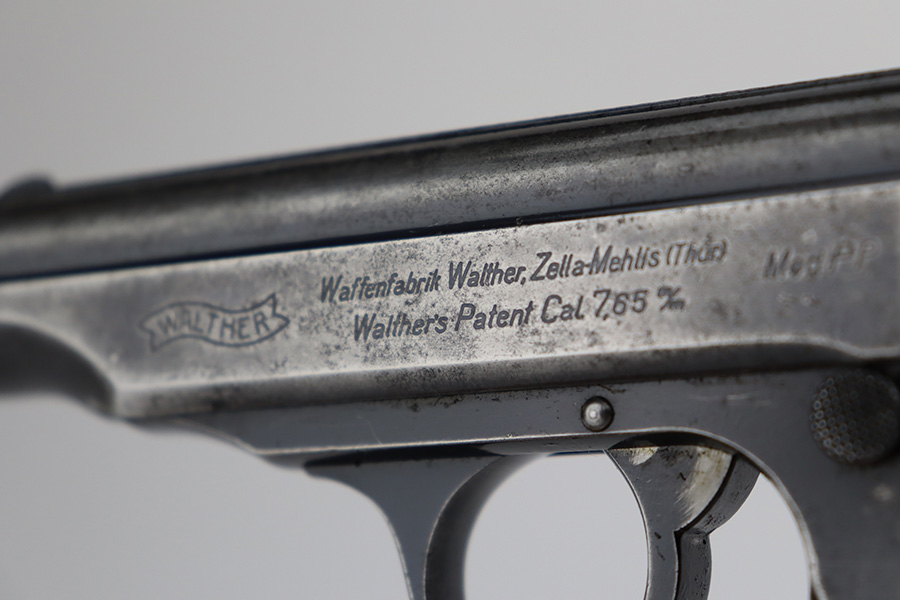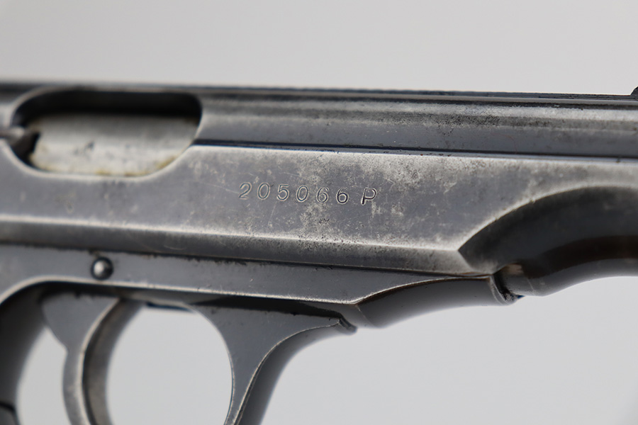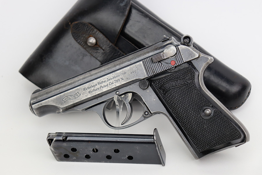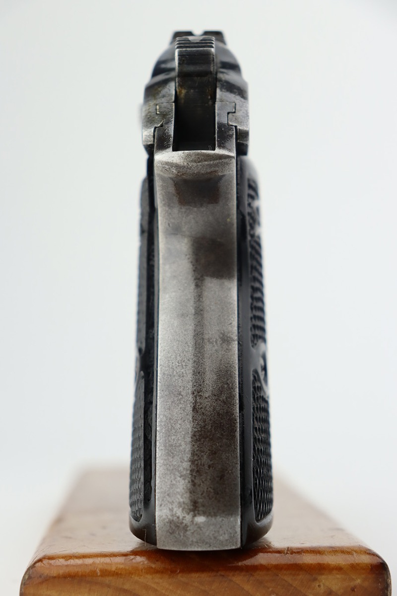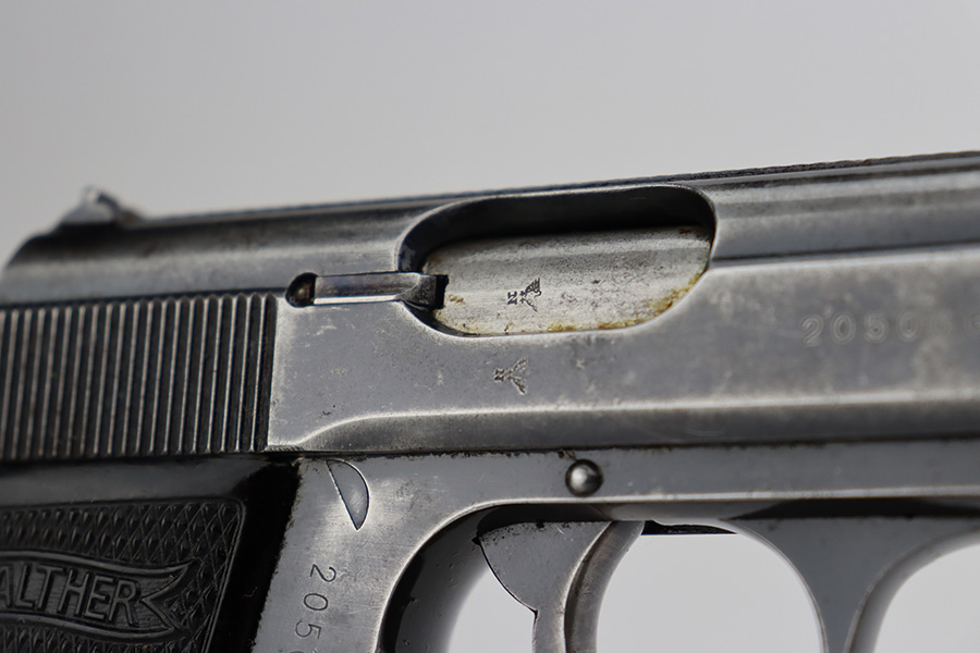 8/18/23 – This is a Walther PP that was issued to the SS in 1940. It is all matching, in a serial number block of other SS-issued guns, and has a properly numbered slide. It comes as a rig with an black leather SS holster (with black stitching) and a numbered but mismatched SS magazine in the same serial range. The top stitching on the holster belt loop has been replaced. The caliber designation on the magazine has a neat factory over-stamp it was originally labeled 9mm but changed to 7.65mm. The gun itself has lost most of its original high polish with obvious wear throughout. Areas of pin-pricking on the slide and on the grip straps. Fitted with nice period-correct black bakelite grips – small chip along the top edge of the left panel. The bore has good rifling, but there is minor frosting throughout. De-cocker is not functional.