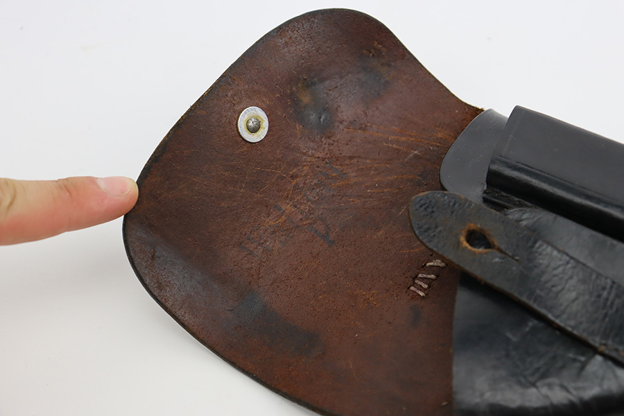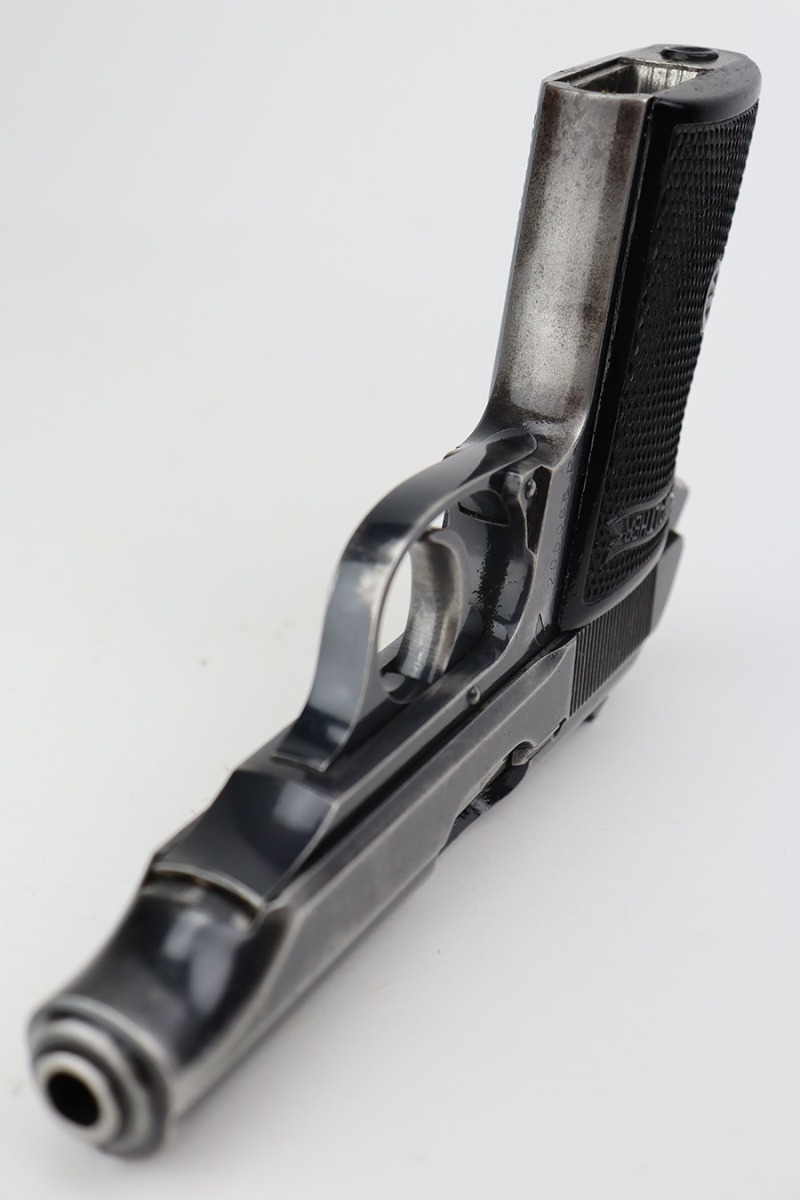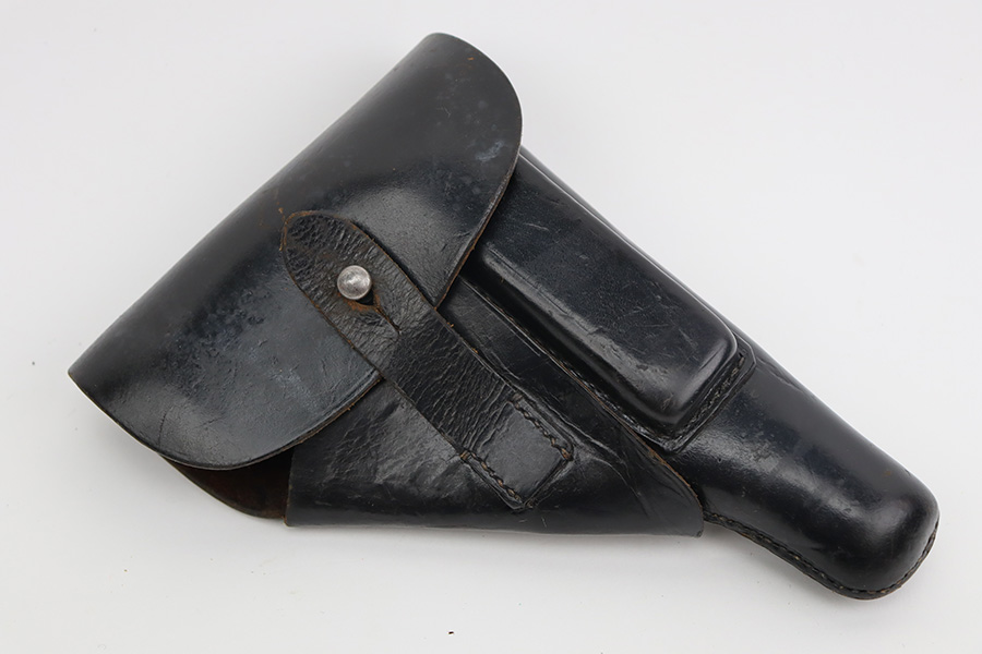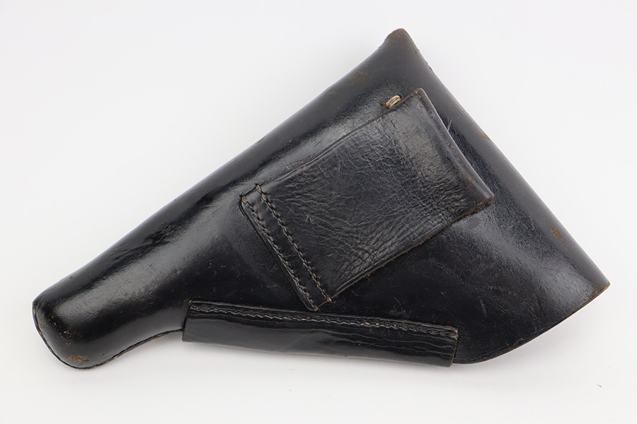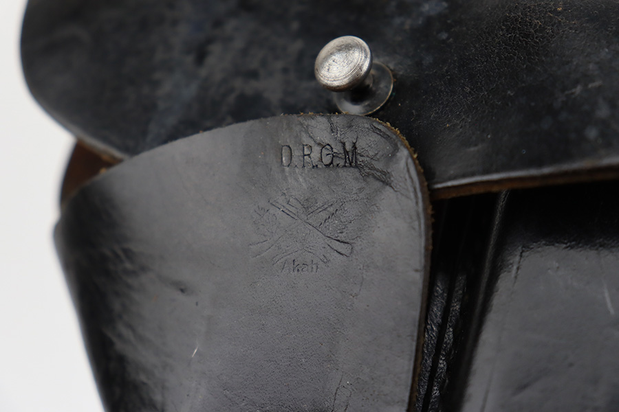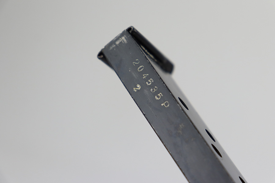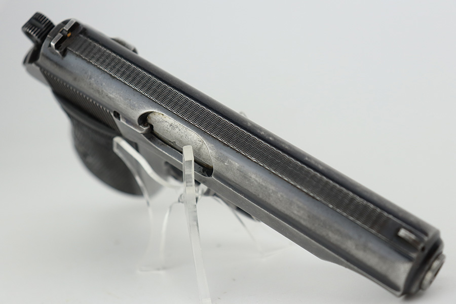 8/18/23 – This is a Walther PP that was issued to the SS in 1940. It is all matching, in a serial number block of other SS-issued guns, and has a properly numbered slide. It comes as a rig with an black leather SS holster (with black stitching) and a numbered but mismatched SS magazine in the same serial range. The top stitching on the holster belt loop has been replaced. The caliber designation on the magazine has a neat factory over-stamp it was originally labeled 9mm but changed to 7.65mm. The gun itself has lost most of its original high polish with obvious wear throughout. Areas of pin-pricking on the slide and on the grip straps. Fitted with nice period-correct black bakelite grips – small chip along the top edge of the left panel. The bore has good rifling, but there is minor frosting throughout. De-cocker is not functional.