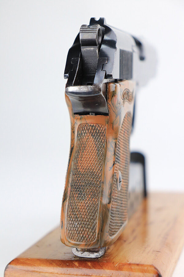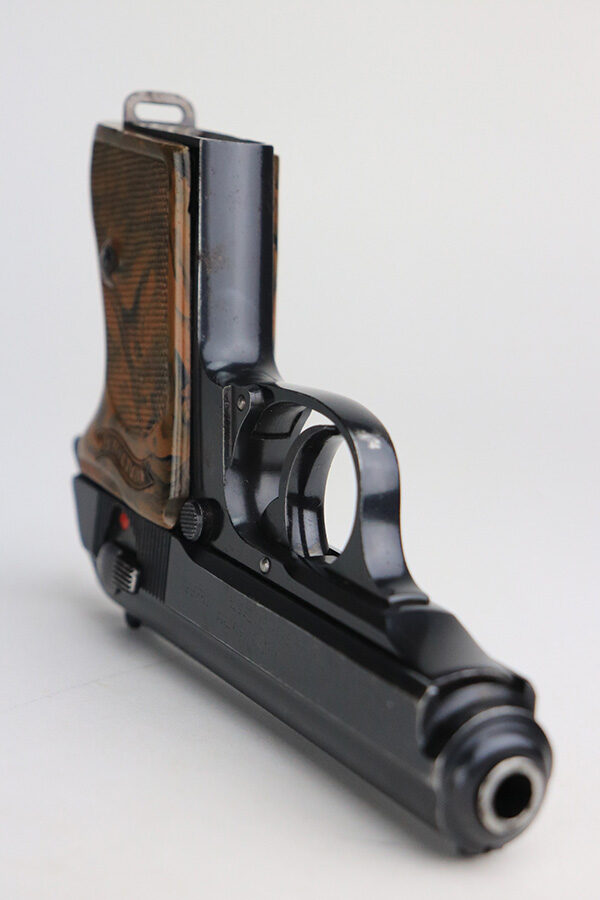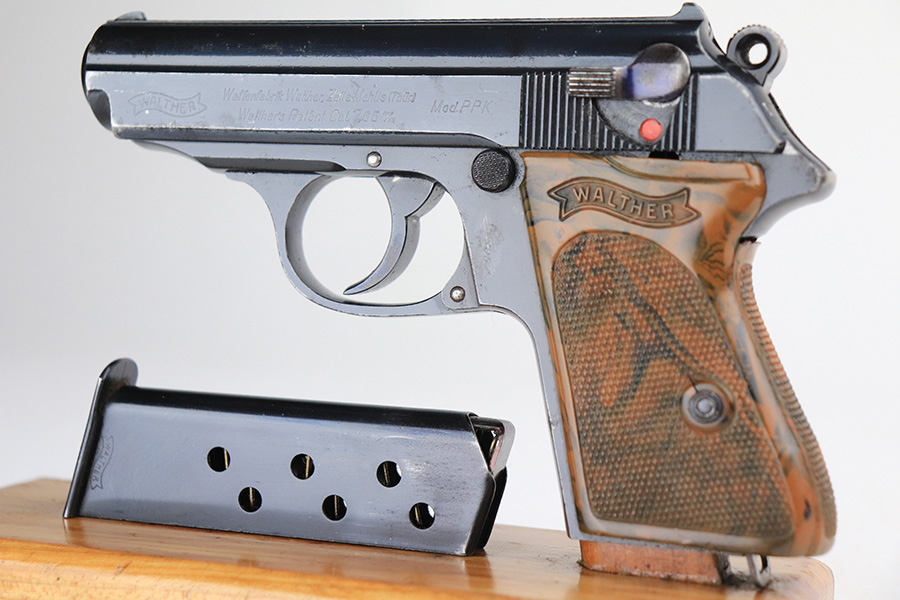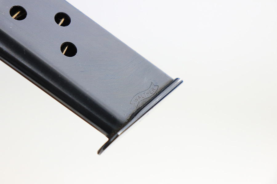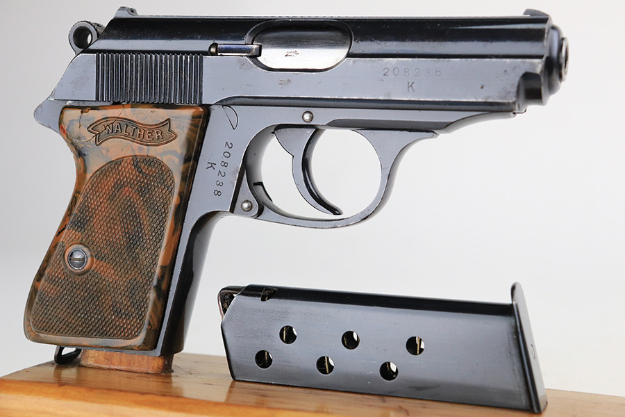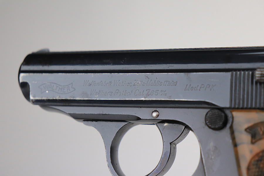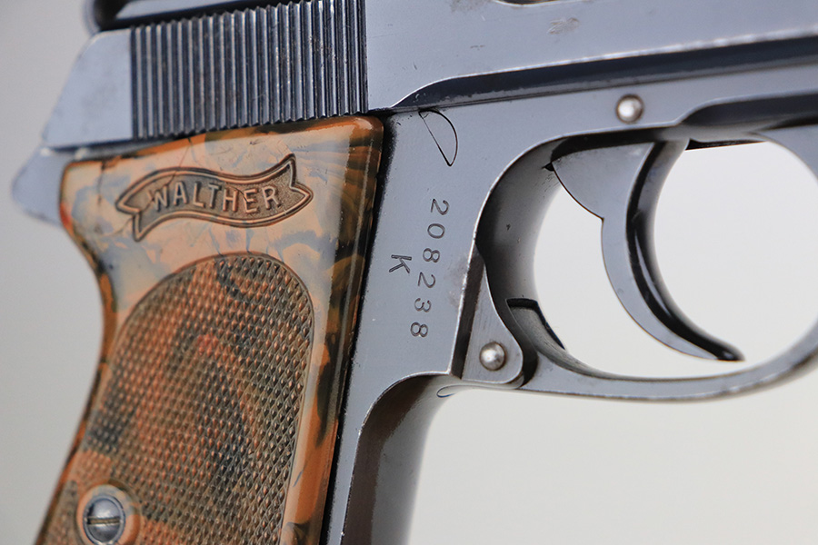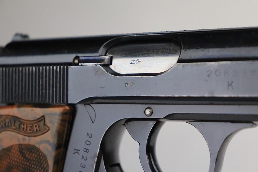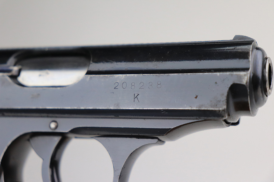 1/25/22 – This is an excellent example of a rare “K Under” Walther PPK issued to the SS in 1938. The gun is all matching and has the proper “Crown N” proofs. It has retained about 97% of its original high polish bluing. There are hints of wear around the high edges of the slide and around the muzzle. There are areas of very light, somewhat scratchy wear along the round edges of both sides of the slide. Some tiny pits here and there on the right side of the slide and one area with tiny pits on the left side of the frame. A spot of oxidation and a few tiny handling marks on the front strap. Comes with a nice brown grip (noticeable crack on the right side) and an un-numbered banner-only magazine. The bore is near-mint.