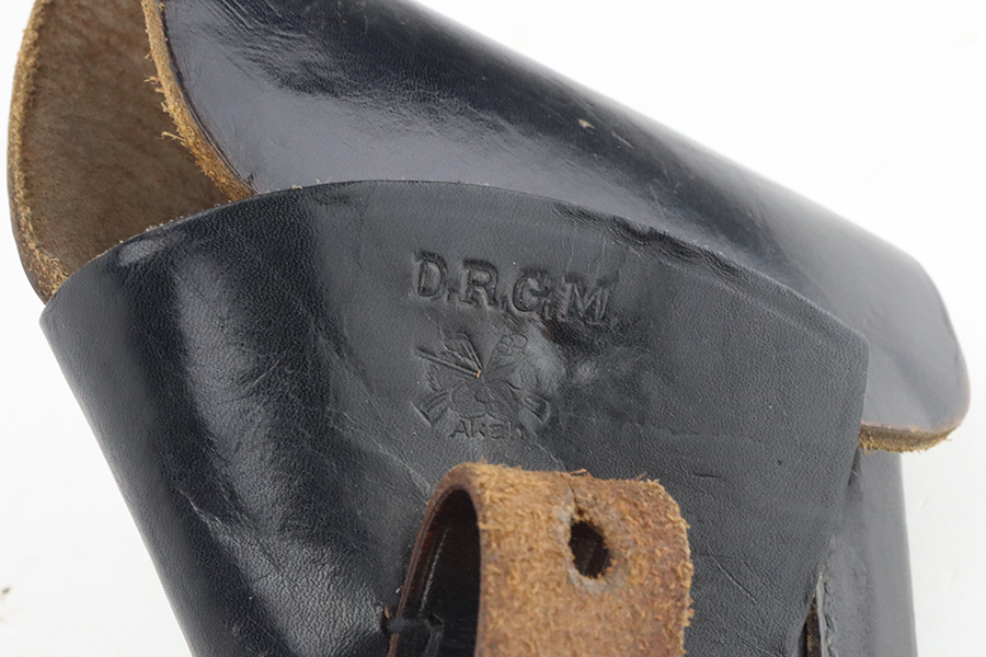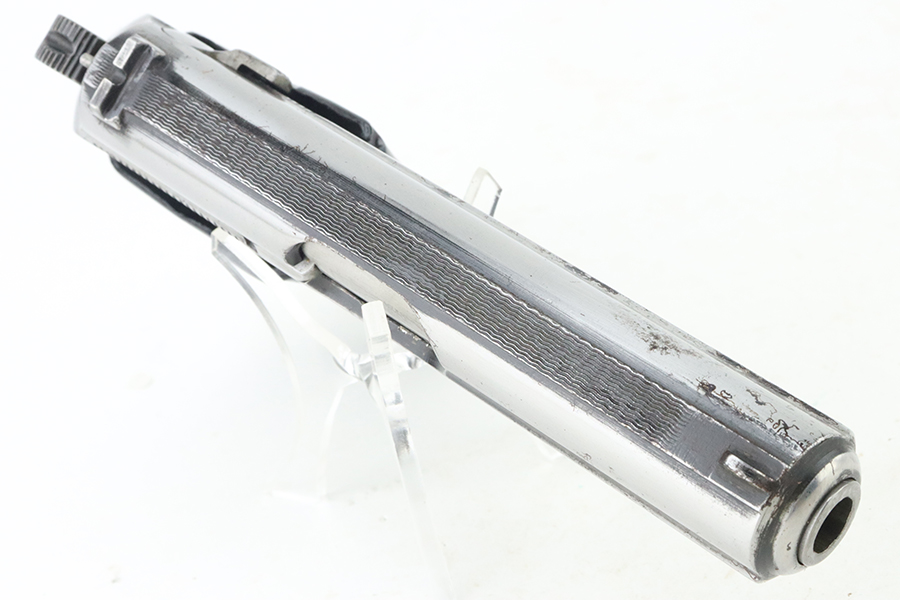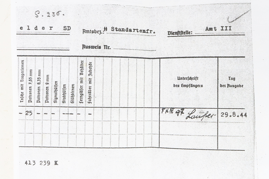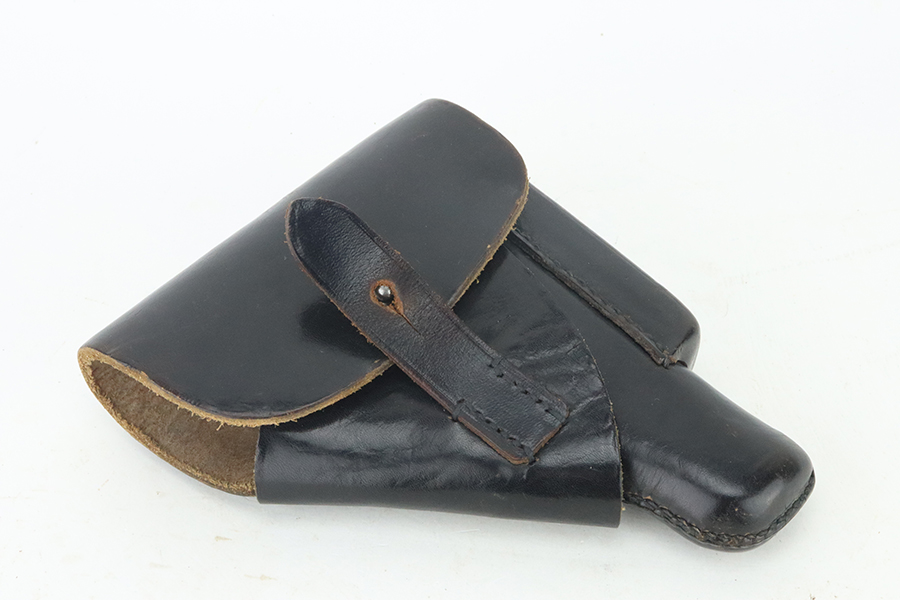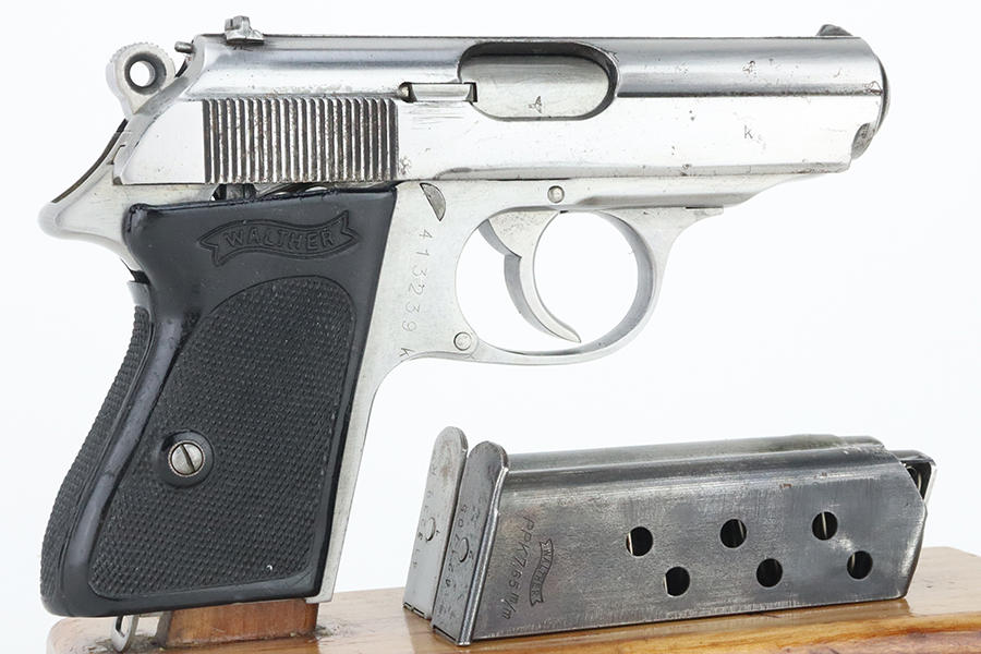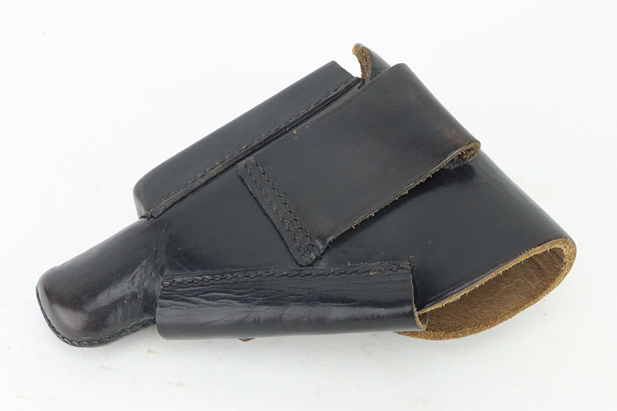 6/13/24 – This is a nice example of a Walther PPK issued to the SS in 1943. The serial number on the slide has been ground away, so we cannot say it is matching. The gun comes as a rig with one original matching-numbered magazine (factory over-stamp of one of the numbers), a spare SS-contract magazine that is not matching to the gun, and a minty SS-contract black leather leading-edge Akah holster. The gun also comes with photocopies of the original SS issue paperwork that lists this exact gun by serial number. The gun has no finish with obvious spotty oxidation on the slide. Fitted with a late-war black bakelite grip. Excellent, shiny bore.