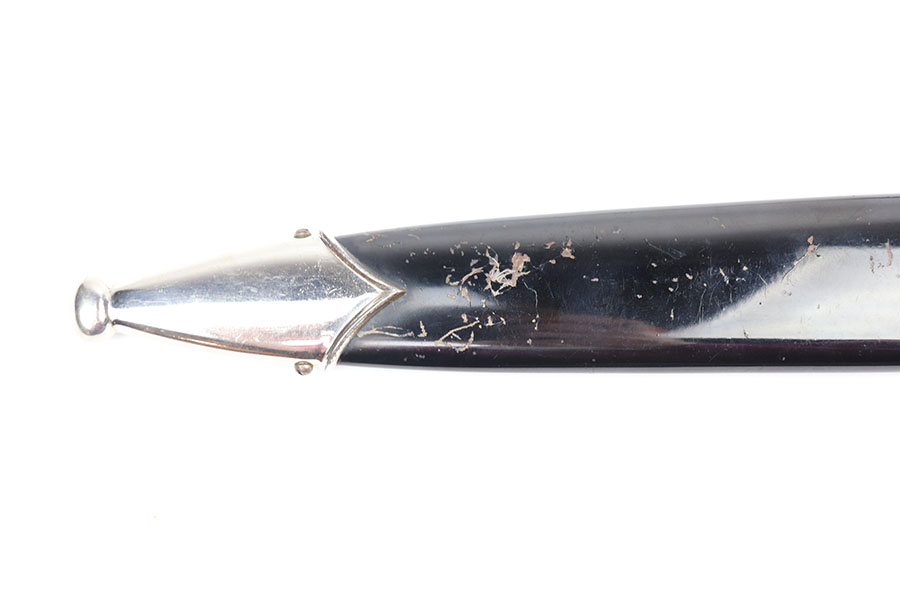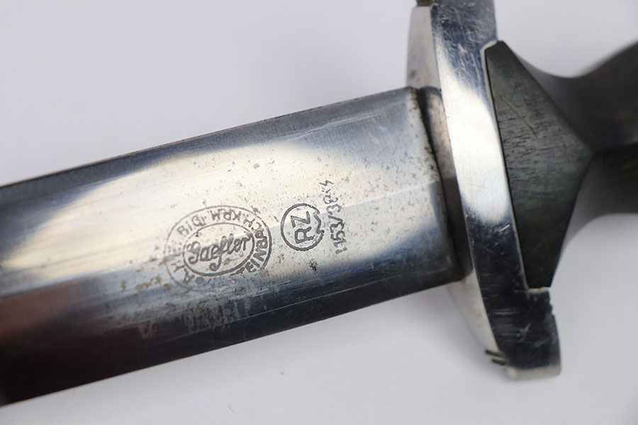 3/23/21 – This is an original SS Dagger made by F & A Helbig (Gaegler), Steinbach K.R.M. The dagger is in great shape and comes with the original scabbard. The blade has a visible “my honor is called loyalty” inscription and a maker stamp on the reverse. Next to the maker stamp is a RZM stamp as shown. Part of the maker stamp and RZM code have worn away, but the markings are still clearly visible. There is some light surface wear and minor discoloration on the blade but no major issues. The wood handle has no cracks or chips but the black finish on the wood has faded slightly. The scabbard has a few small areas of missing paint but is mostly in tact and is void of dents.