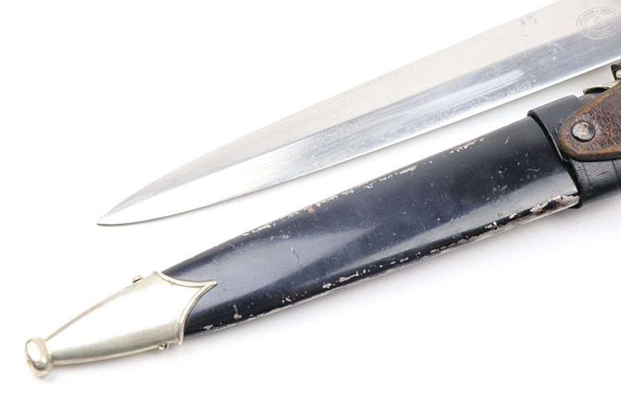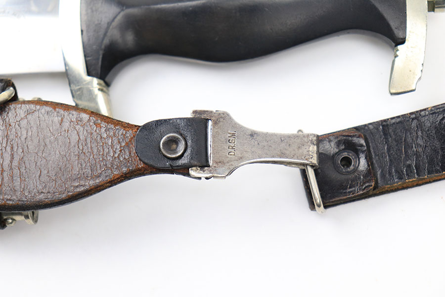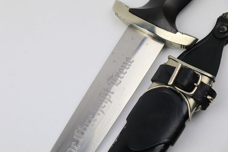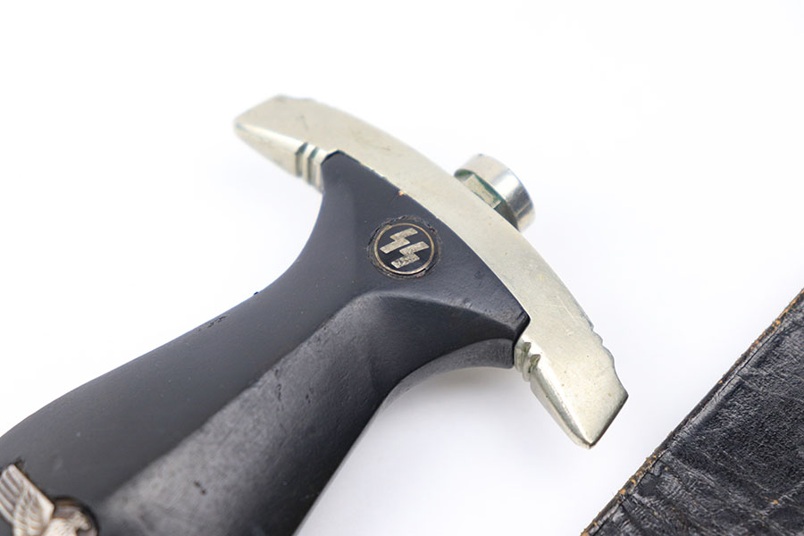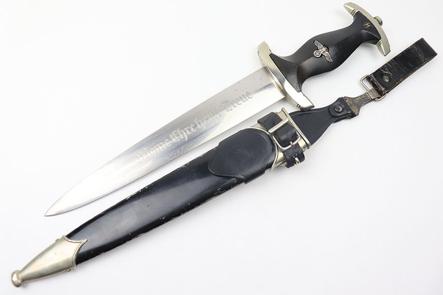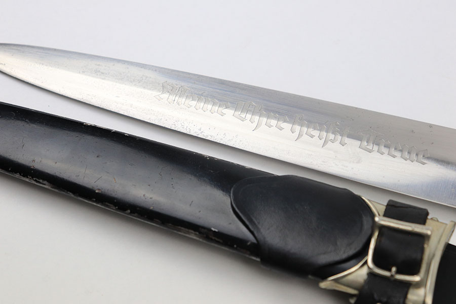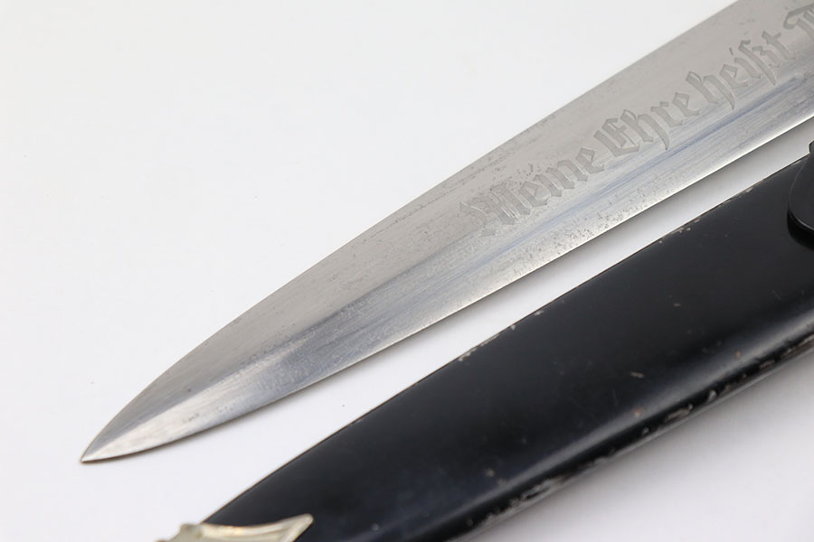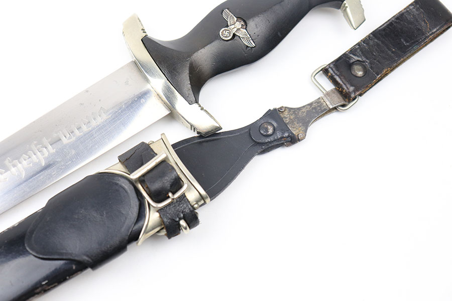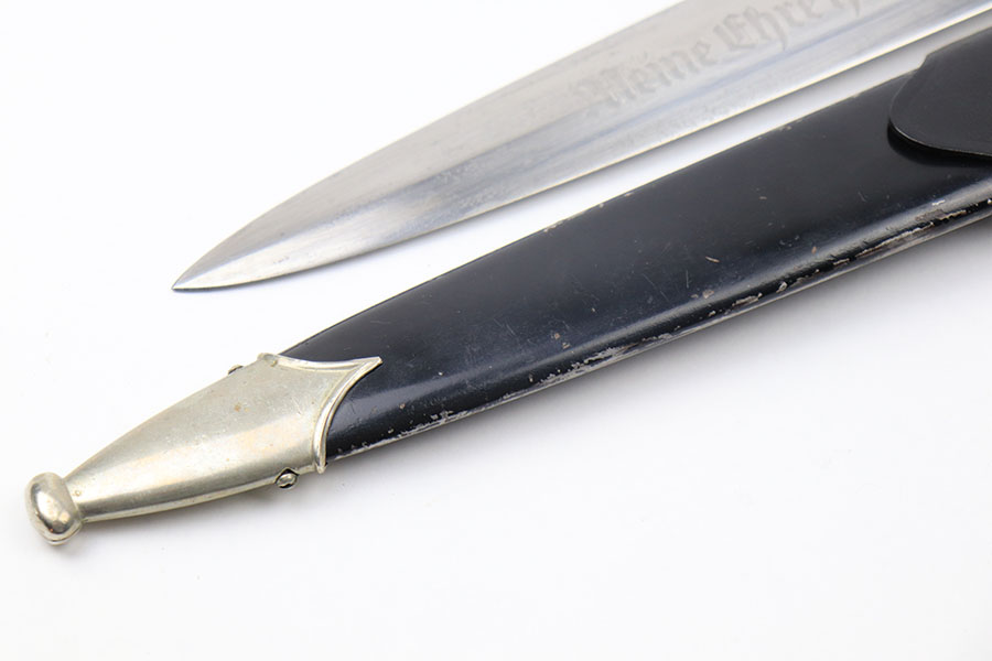 11/5/21 – This is a rare variation SS Dress Dagger with scabbard and a leather hanger. The dagger blade is in great condition with minimal surface wear and oxidation. Very nice cross graining. Maker marked on one side and inscribed “Meine Ehre heisst Treue” on the reverse. There are a few minor indents on the wood handle, but no notable cracks or chips. Clean metal fittings. The scabbard ahs some mild finish loss but no notable dents. The leather frog is in great condition and DRGM stamped on the reverse of the clip.
