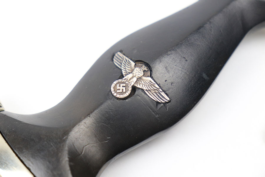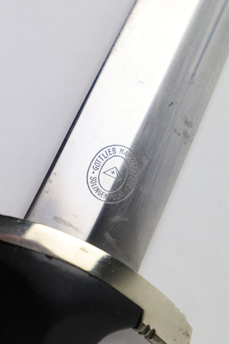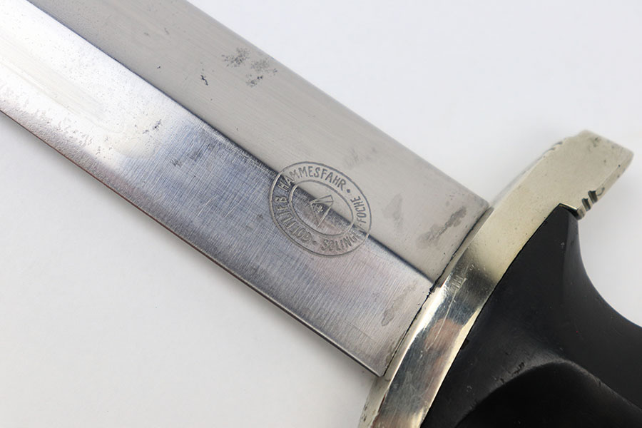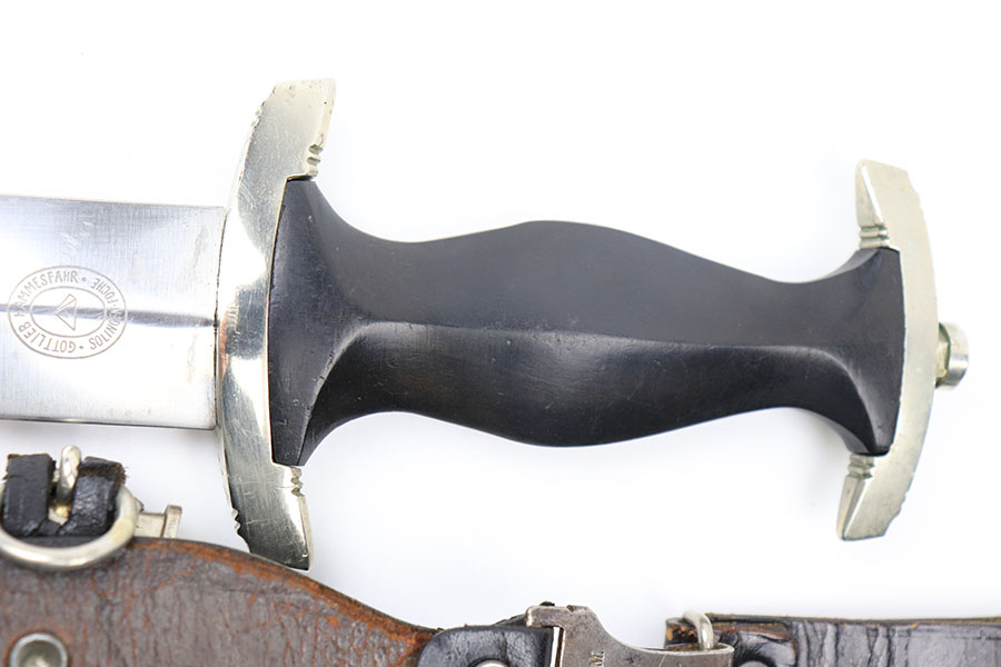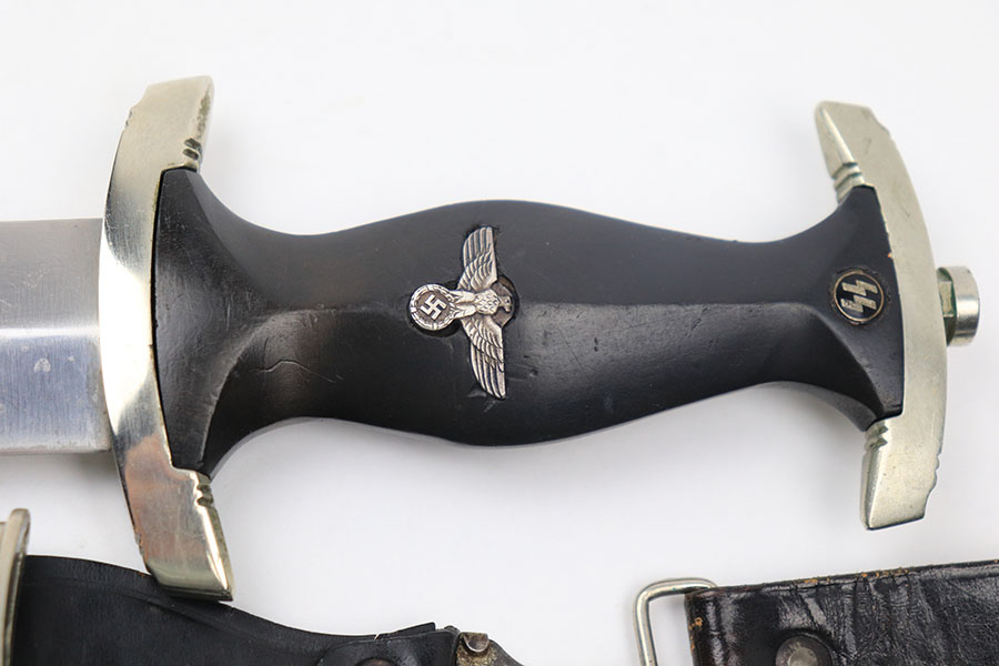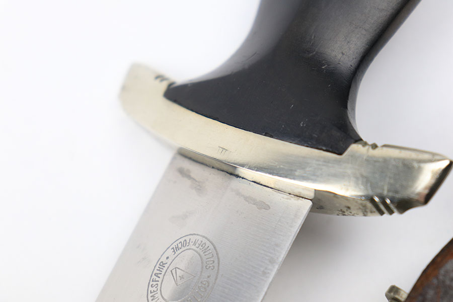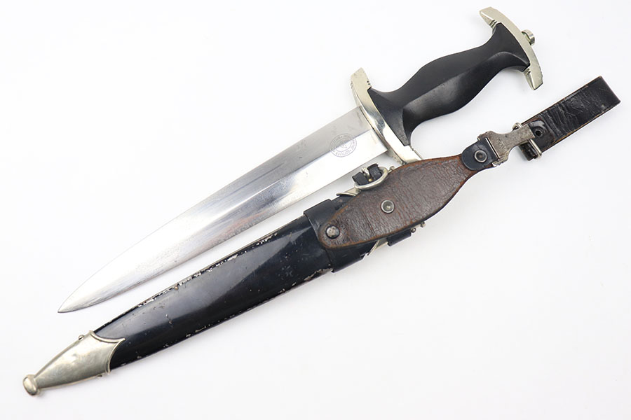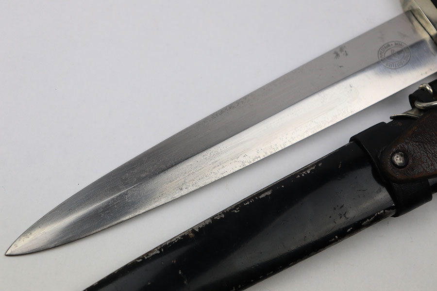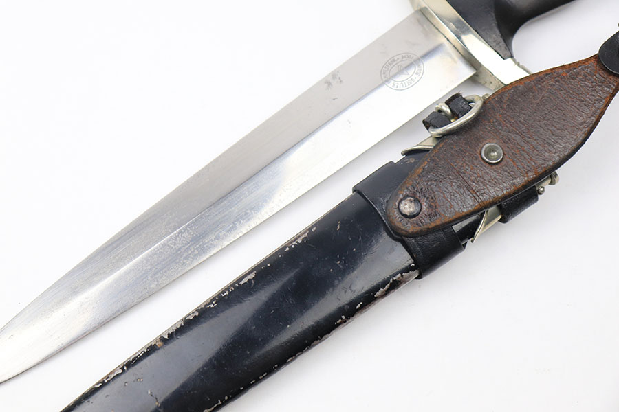 11/5/21 – This is a rare variation SS Dress Dagger with scabbard and a leather hanger. The dagger blade is in great condition with minimal surface wear and oxidation. Very nice cross graining. Maker marked on one side and inscribed “Meine Ehre heisst Treue” on the reverse. There are a few minor indents on the wood handle, but no notable cracks or chips. Clean metal fittings. The scabbard ahs some mild finish loss but no notable dents. The leather frog is in great condition and DRGM stamped on the reverse of the clip.