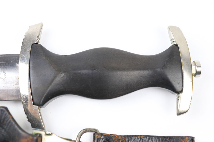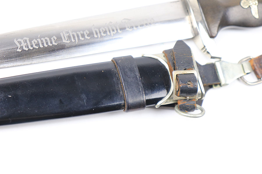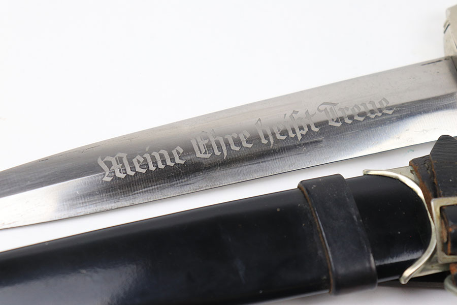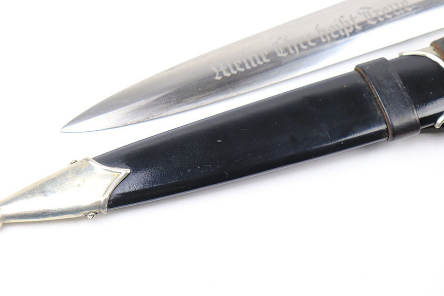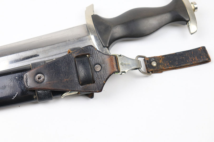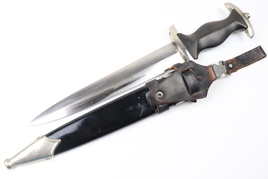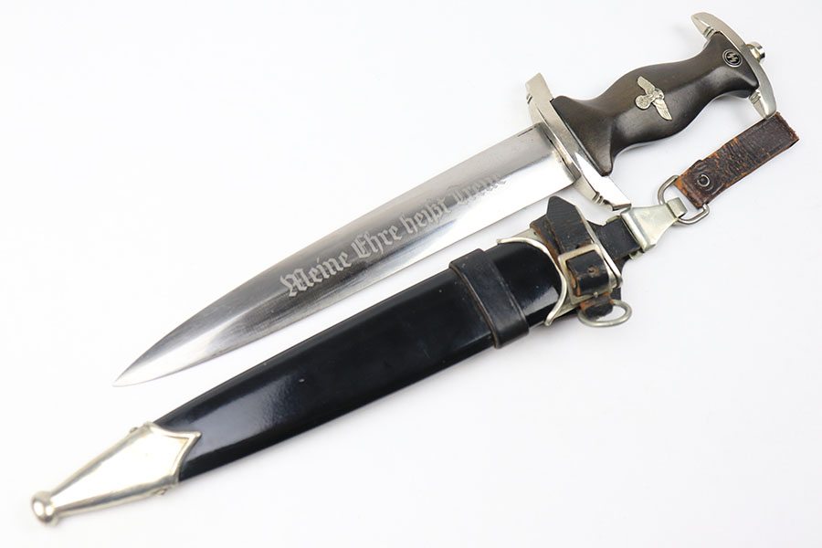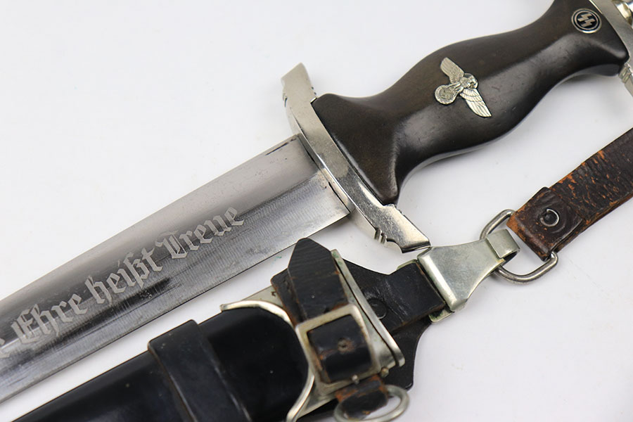 8/6/21 – This is an original Nazi SS issued dagger. The dagger comes with an original scabbard and hanger, as shown. The blade is inscribed on one side and maker stamped on the reverse. There is some mild scabbard wear and light surface oxidation but no major issues. Nice cross graining. The wood handle has no cracks or chips and the metal fittings are excellent. The scabbard has excellent black paint and on small dent across the front of the scabbard. The leather hanger is Assmann maker stamped on the metal and is in good condition despite the leather being cracked at the top loop. See photos.