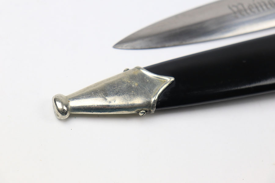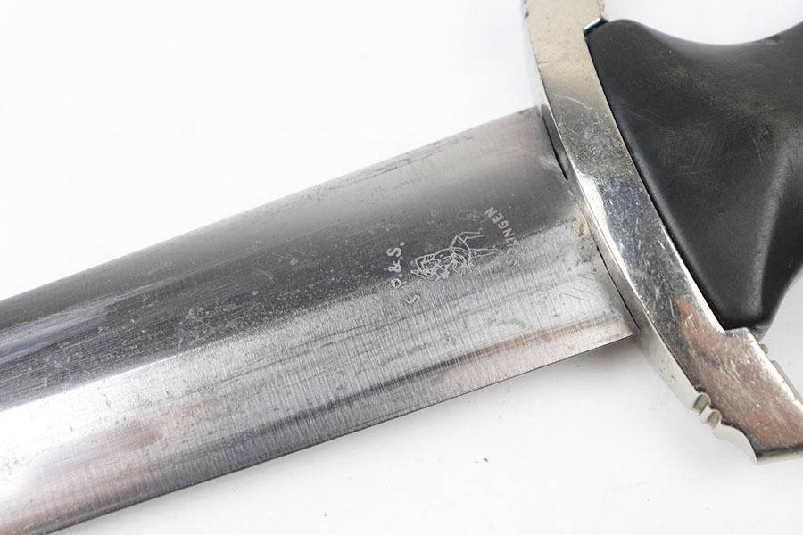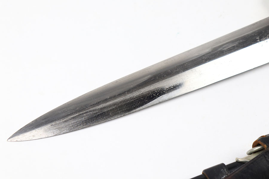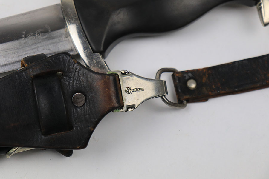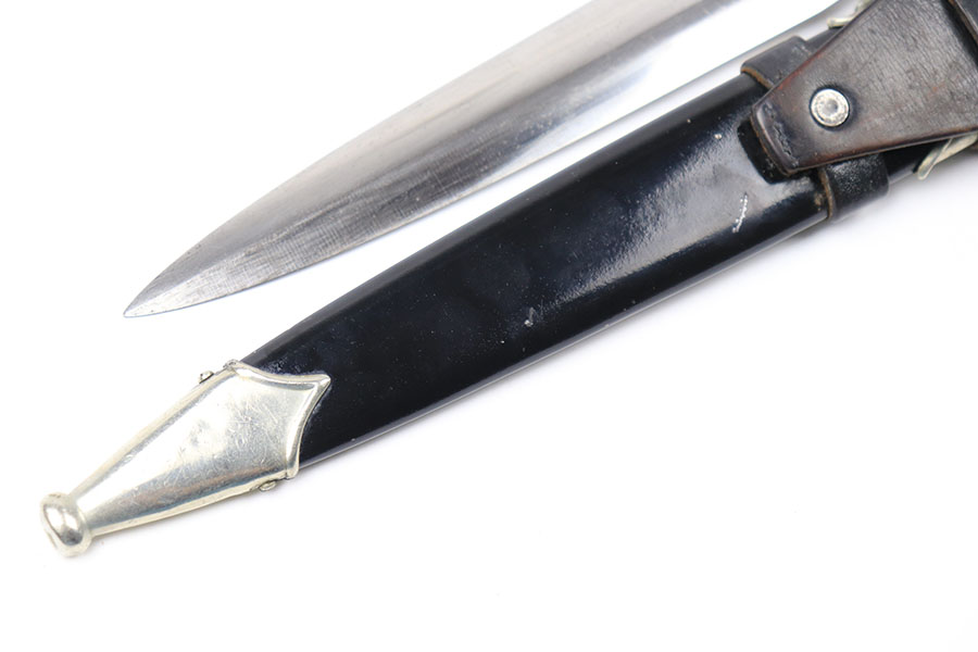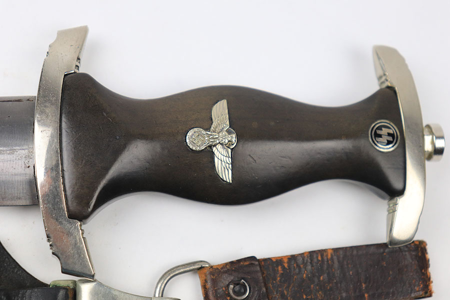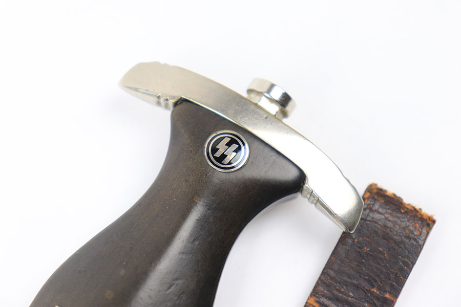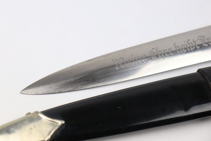 8/6/21 – This is an original Nazi SS issued dagger. The dagger comes with an original scabbard and hanger, as shown. The blade is inscribed on one side and maker stamped on the reverse. There is some mild scabbard wear and light surface oxidation but no major issues. Nice cross graining. The wood handle has no cracks or chips and the metal fittings are excellent. The scabbard has excellent black paint and on small dent across the front of the scabbard. The leather hanger is Assmann maker stamped on the metal and is in good condition despite the leather being cracked at the top loop. See photos.