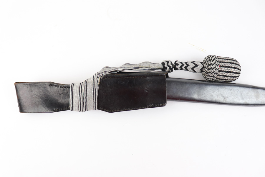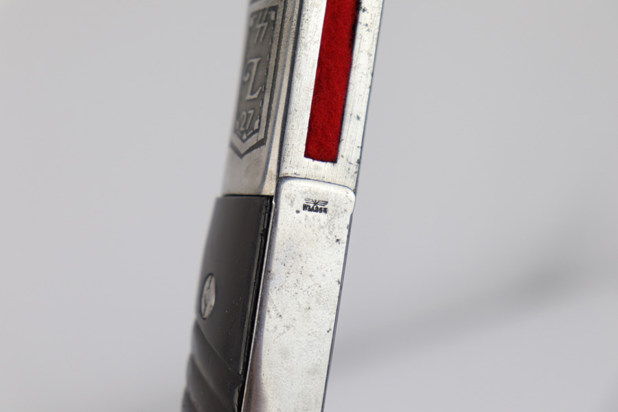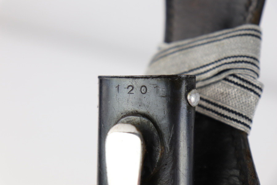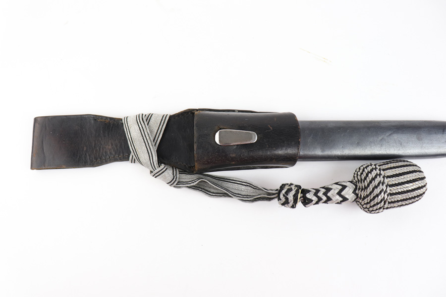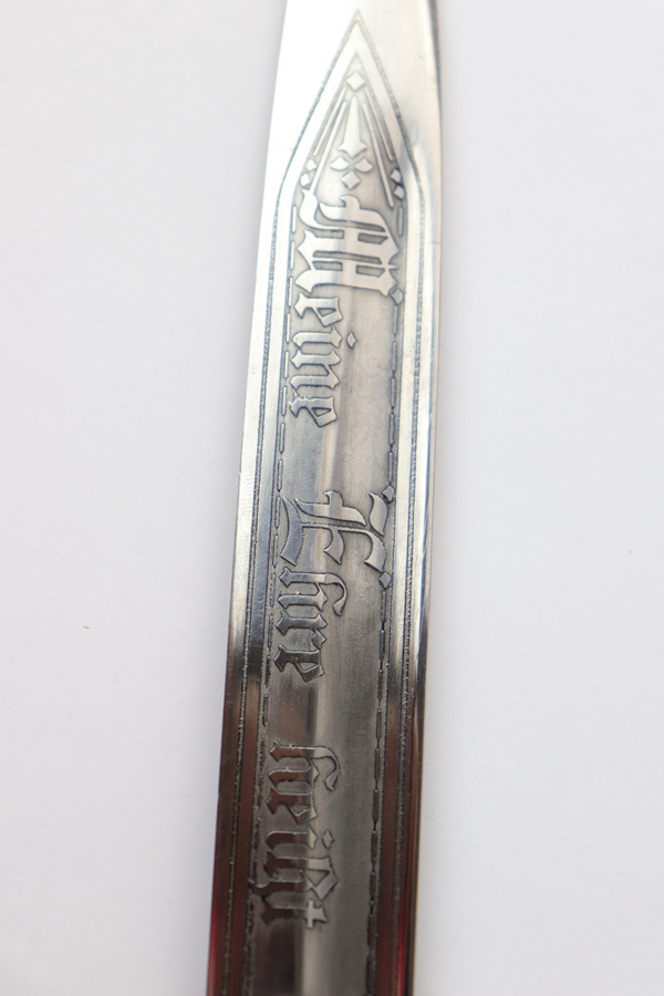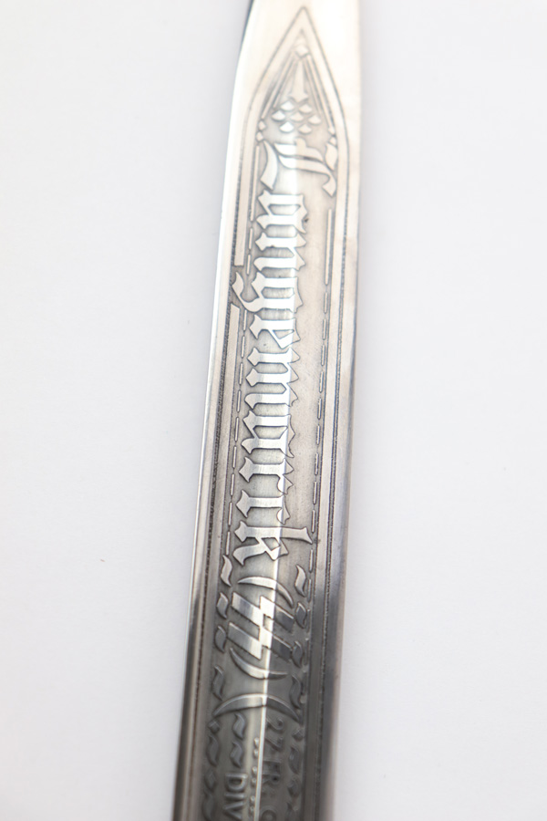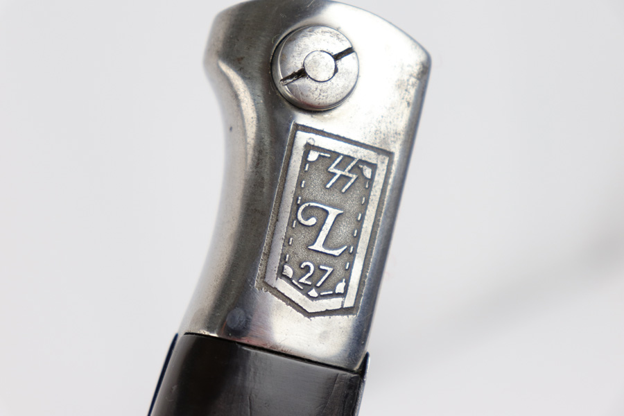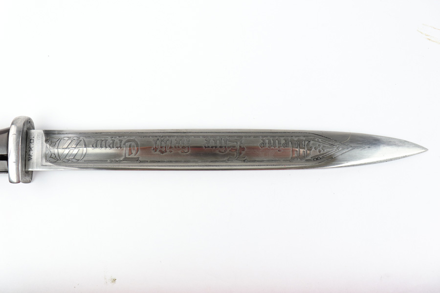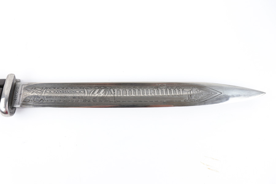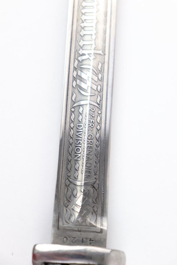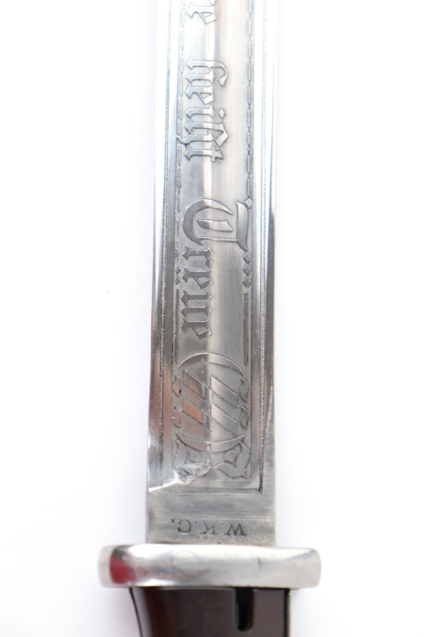 5/2/19 – This is a very interesting engraved parade / presentation SS rifle bayonet. The bayonet blade is engraved on two sides with SS ruins on each side. One side has “Meine Ehre Heist Treue” while the other indicates the 27th Grenadier Division. There is also engraving on the metal of the handle on one side. These engravings must have been custom added as this is not a known variation of parade dagger. My guess is a wealthy & proud SS member had this engraved for himself. Another theory would be a G.I. had this engraved before he left Germany to “spruce up” his captured prize. The engravings look correct to other period engraved pieces we have seen in German style (hence why we believe this was engraved in Germany either during or immediately post WW2). The bayonet overall is excellent. The portepee is original and SS as well. The scabbard is not matching to the bayonet, but is period correct as well. The frog is unmarked but period correct as well.