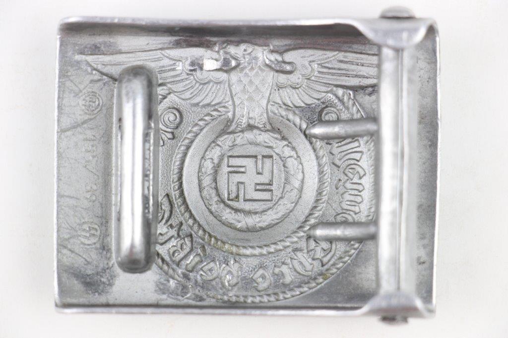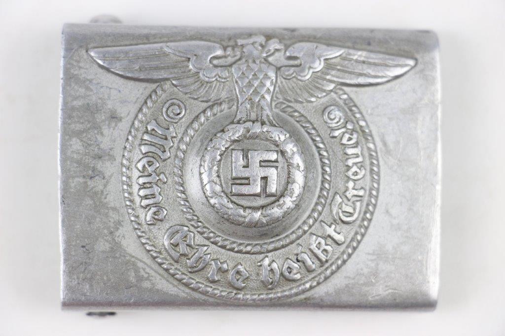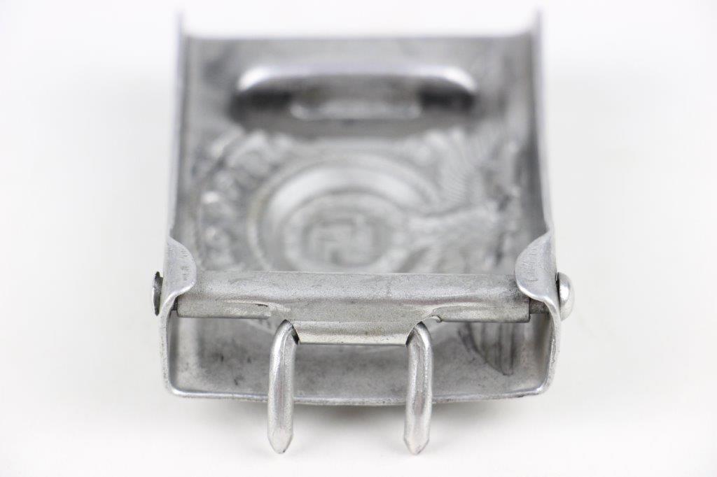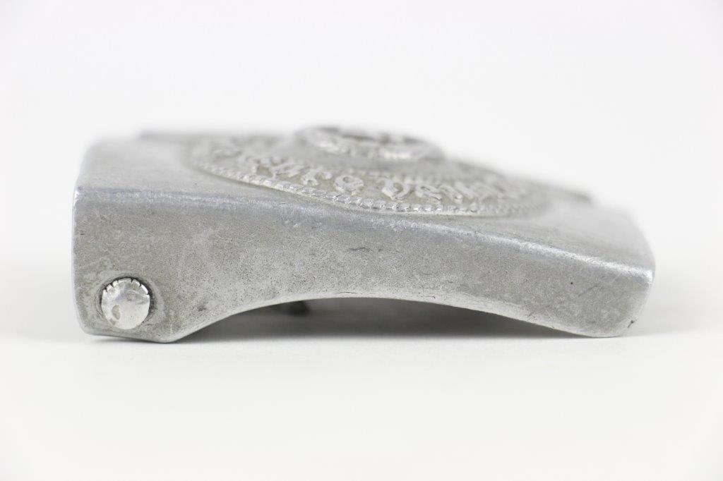 7/8/24 – This is a great condition example of a 1939 production SS Belt Buckle. The buckle is silvered aluminum with traces of the silvered finish visible on the front of the buckle, mostly near the depressed portions of the buckle below the eagle’s wings and near the wreath / inscription. The buckle has great detail and shows typical surface age and natural patina without any excessive wear or damage. The interior of the buckle has a crisp maker stamp, “RZM 155/39 SS” by Assmann.