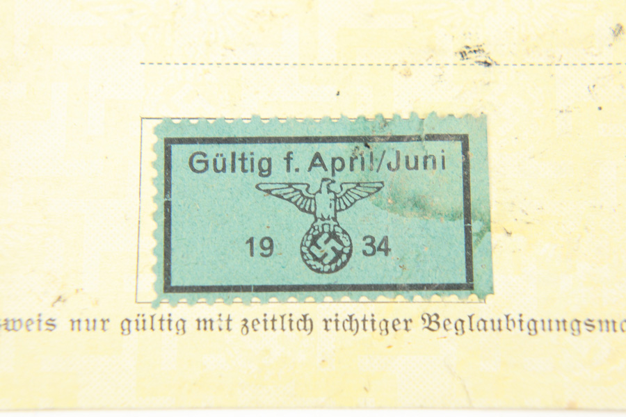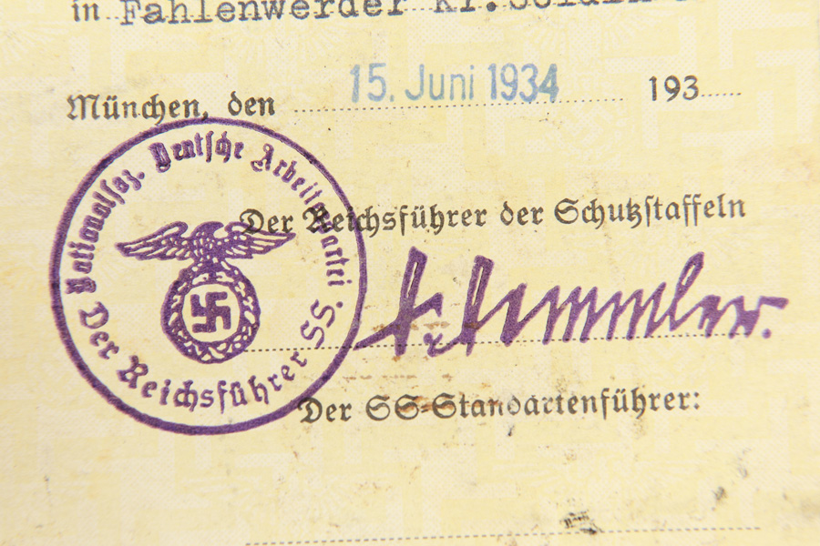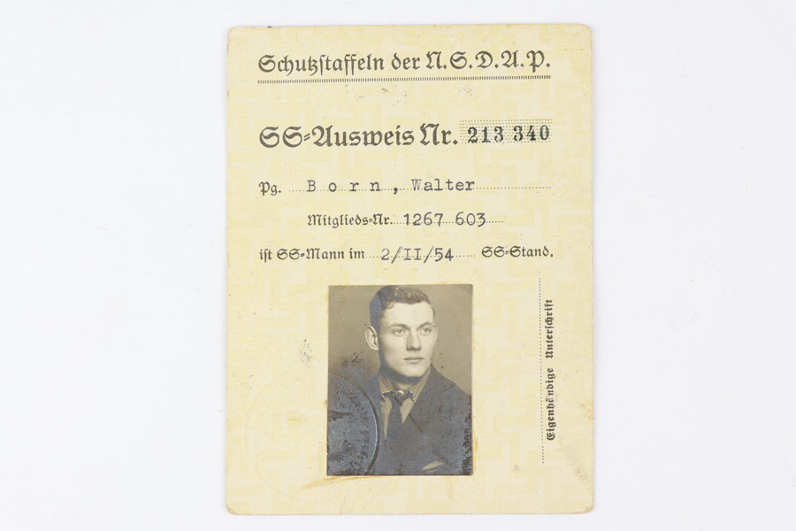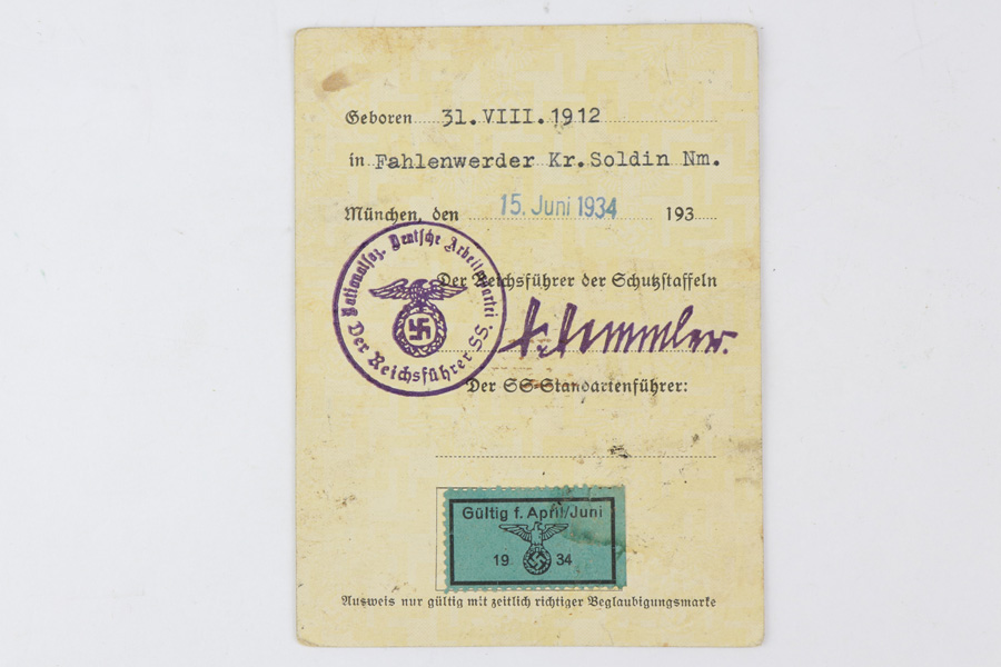 11/9/18 – This is an I.D. card for Walter Born, a Nazi SS recruit during WW2. It was purchased from an estate in Germany. Walter would have joined the SS early on in the war, as the I.D. was issued in 1934. It is very rare to find a card in such pristine condition. Most notably, the I.D. has an amazing example of a Nazi 1934 stamp and Himmler signature. Guaranteed original and authentic.
