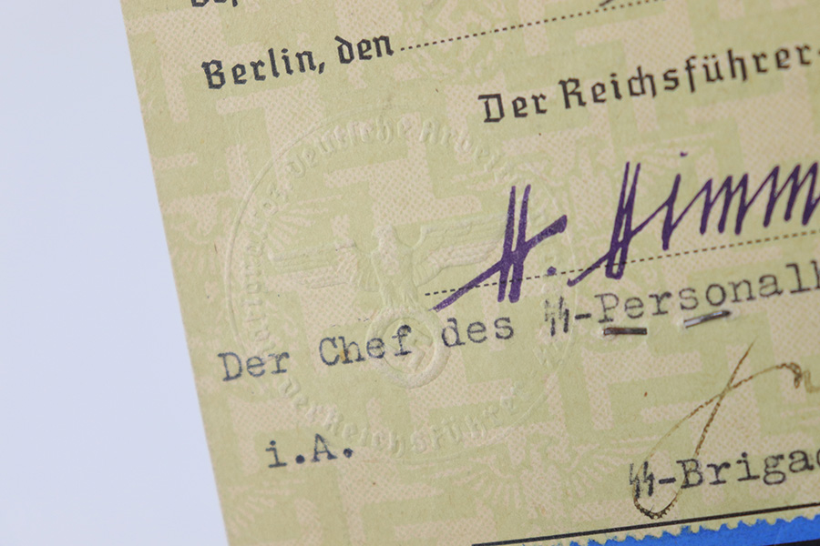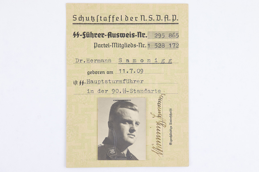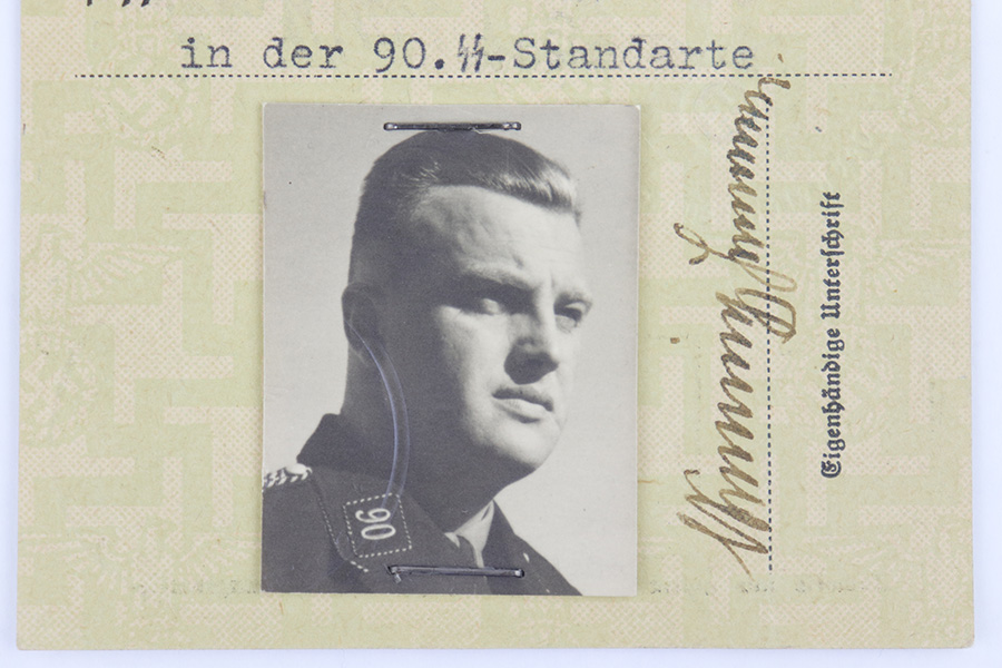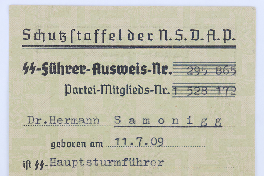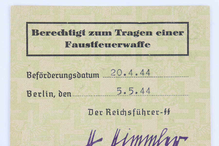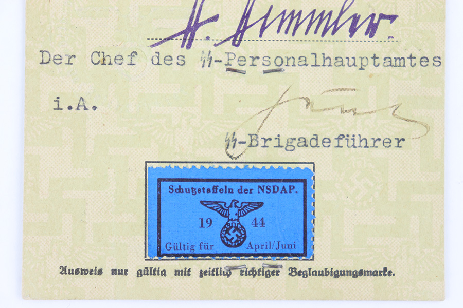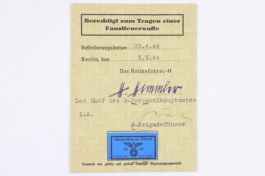 6/13/23 – This is a 1944 dated German ID Card. The card is titled, “Schutzstaffel der NSDAP” which roughly translates to “protection staff of the NSDAP”. There’s a SS license number and party membership number, as well as the soldier’s name and date of birth (July 11, 1909). A black and white photos is stapled to the front, and there are two embossed German Party Eagle stamps on the card. The backside of the card roughly translates to “Authorized to carry a handgun / military weapon”. The card expires on April 20, 1944, and was issued May 5th, 1944. Excellent overall condition.