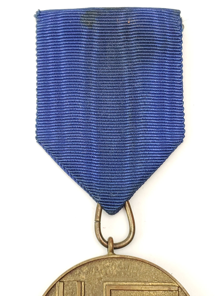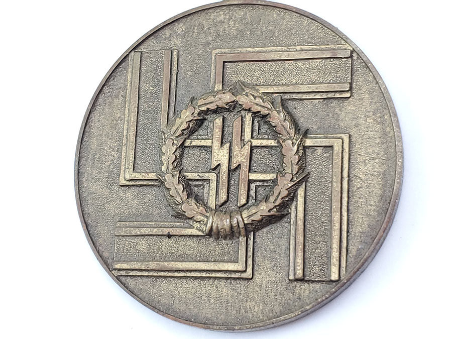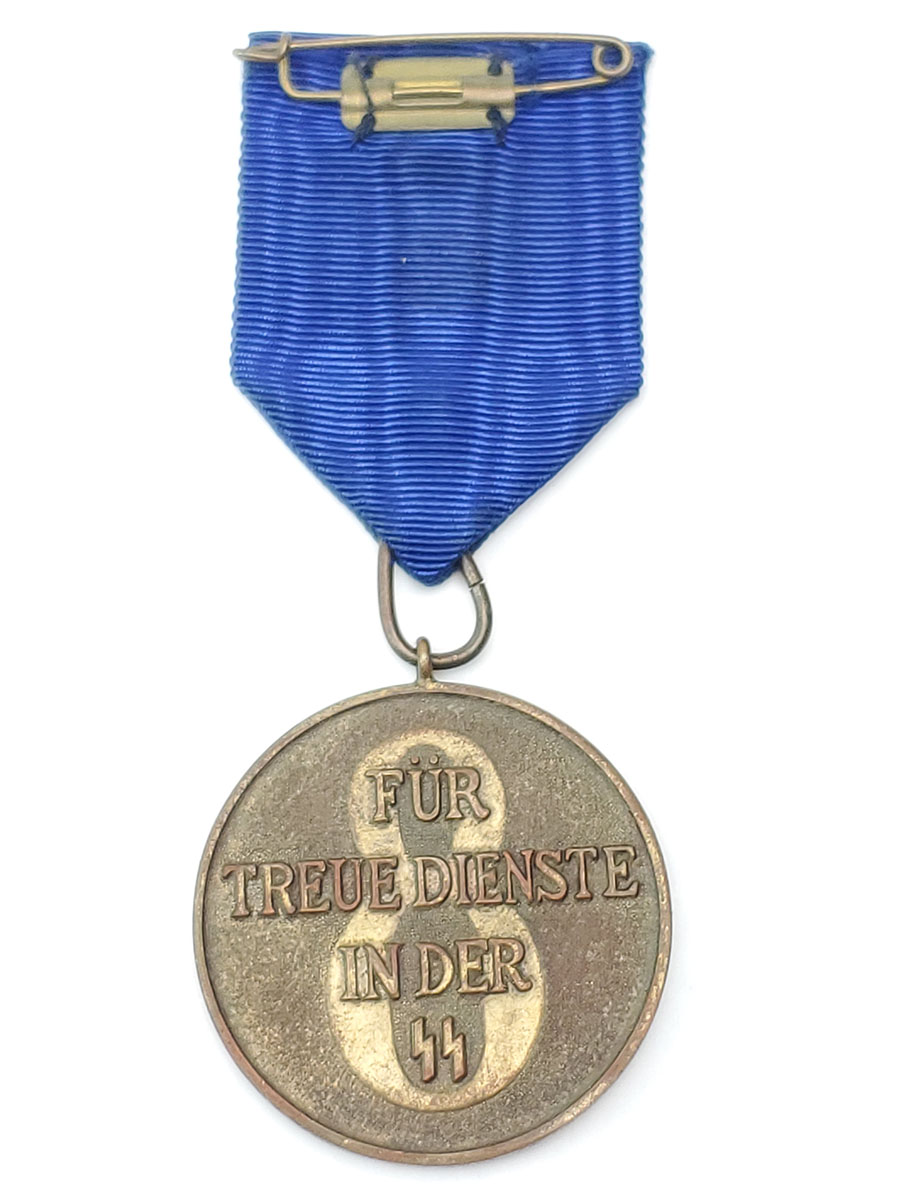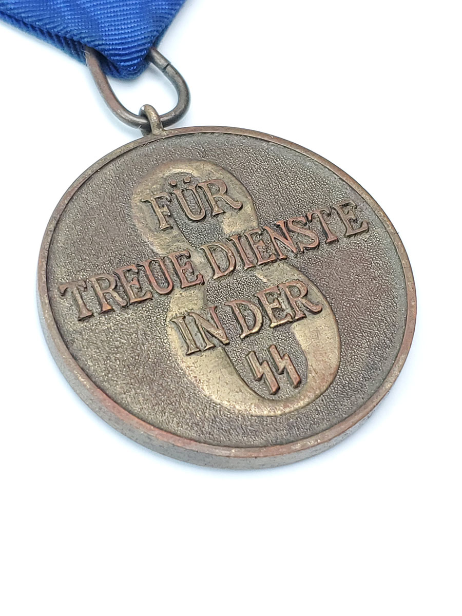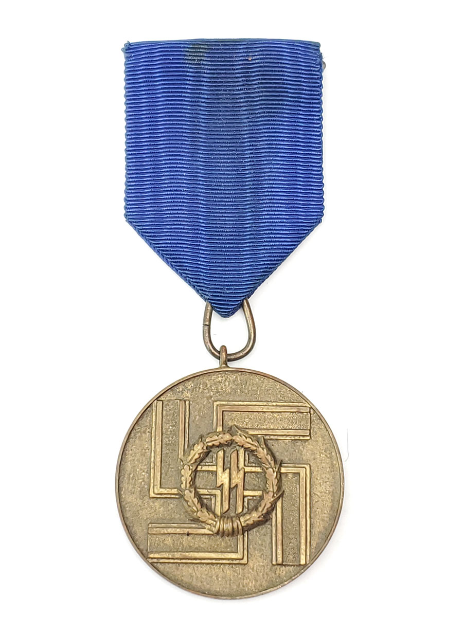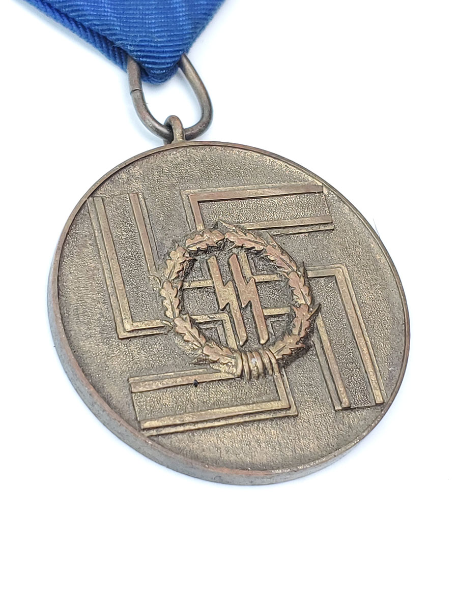 9/1/20 – This is a very nice, typical example of a SS long service award. Awarded for 8 years of service with the nazi SS. The medal has a bronze finish and some light patina and edge wear as shown. Comes with the original ribbon.
