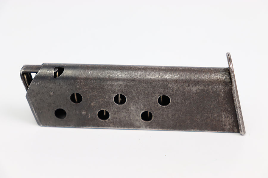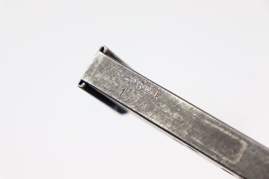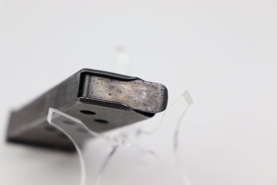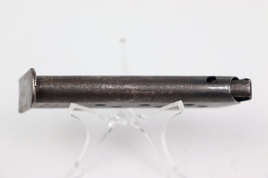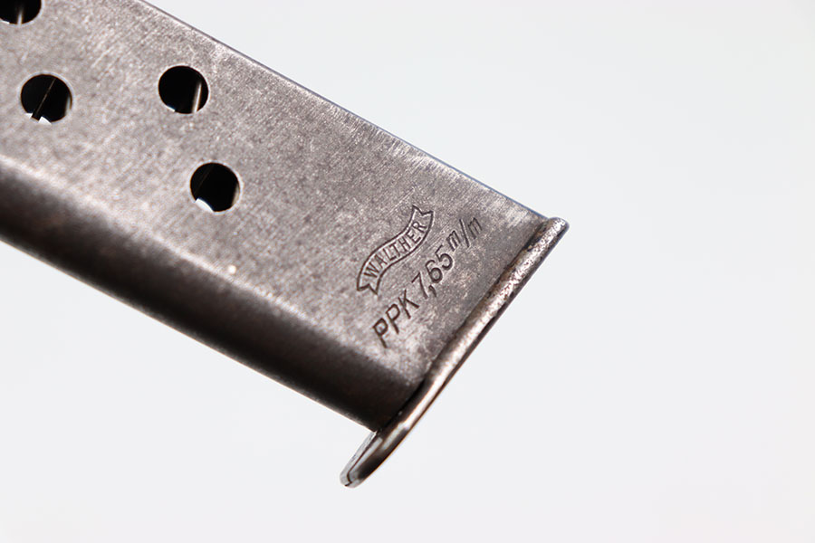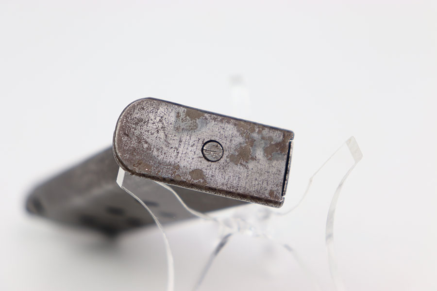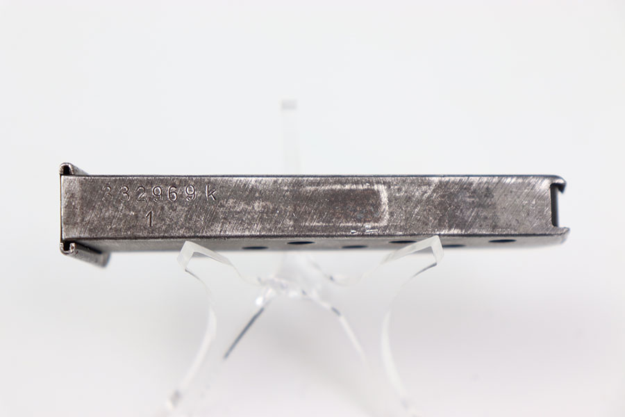 2/22/24 – This is an original WW2 wartime production Walther PPK magazine that was issued with an SS PPK. The magazine has a dull blued finish that’s in good condition with some finish loss throughout. The back of the magazine is numbered “332969k” (a known SS serial number) with “1” underneath indicating this is the main magazine to a SS PPK. The spring is strong and fully functional.