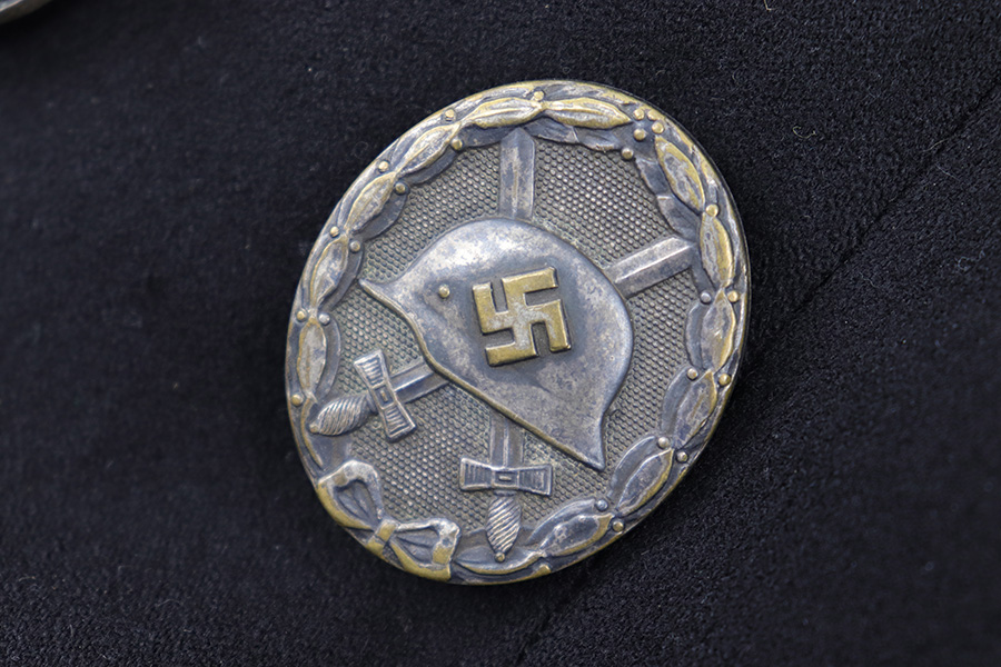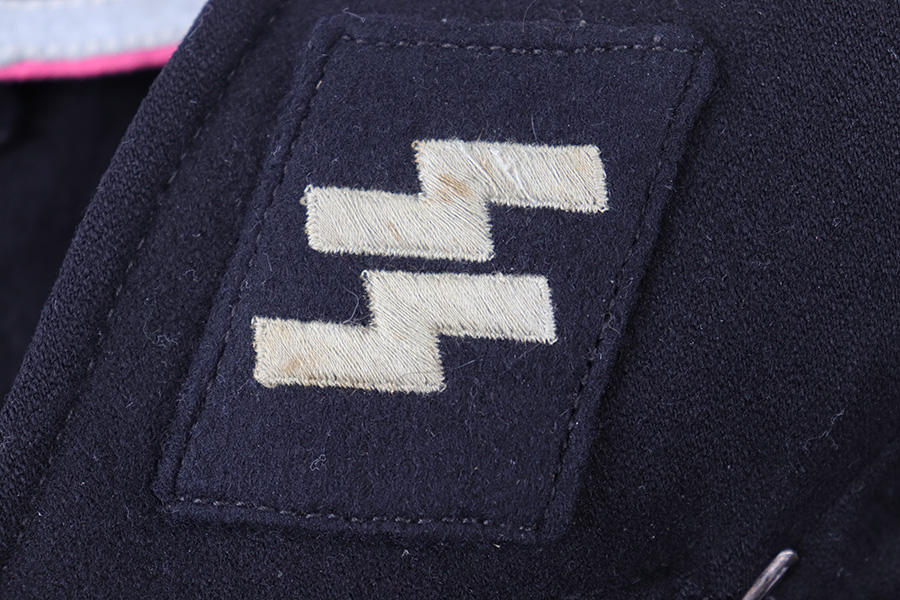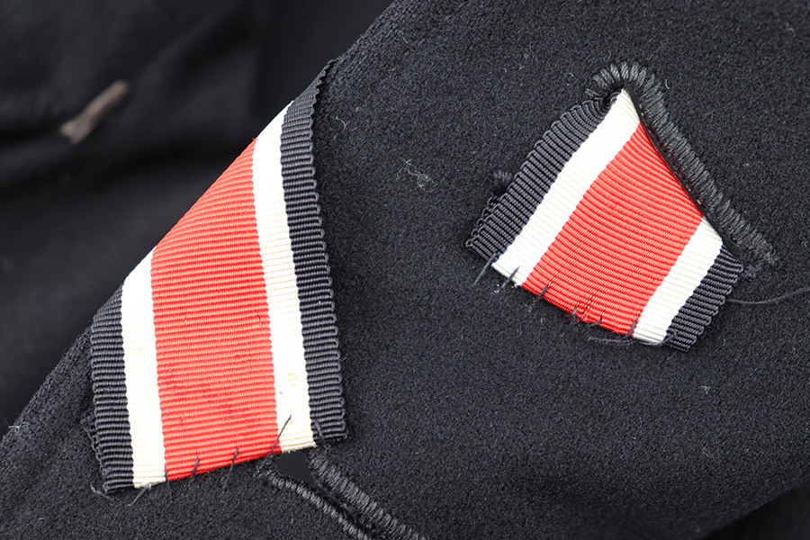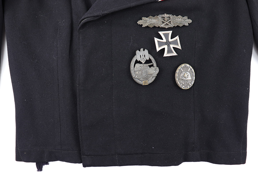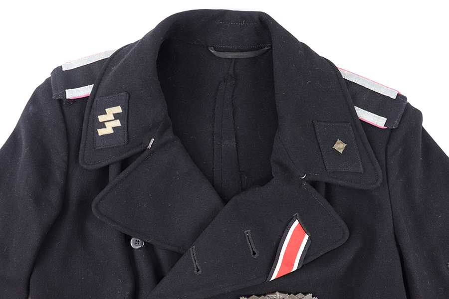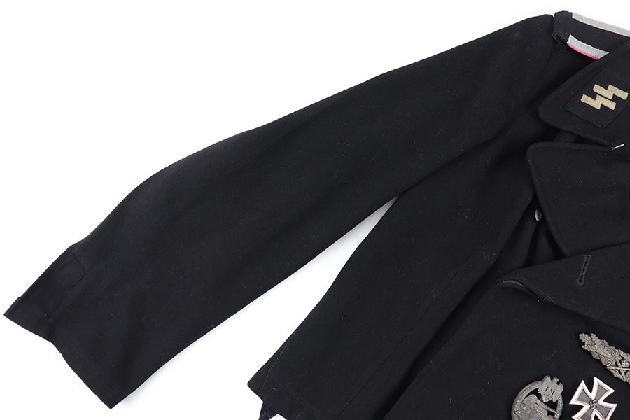 5/24/23 – This is an original Waffen SS Panzer Officer’s “Wrapper” Tunic, complete with attached medals and RZM pattern Wiking Division Cuff Title. The tunic is in near-excellent overall condition with no major issues in the cloth and all original stitching throughout. The back of the tunic, near the central spine of stitching, has a few small scuffs that have been repaired with stitching (shown in photos). There’s also one small hole near the cuff sleeve, but this is small and very minor. The cuff title appears machine-sewn and is in excellent condition. The epaulet / collar tabs and shoulder boards are also machine sewn and excellent. The left sleeve eagle patch is zig-zag machine sewn. The attached medals are a close combat badge, a black wound badge, 25 engagement bronze panzer badge, and a merit cross. All of the attached awards are original and in great condition. No interior wear or damage on the tunic, and all buttons intact. The 5th SS Panzer Division “Wiking” was one of the elite Panzer divisions of the thirty-eight Waffen-SS divisions of Nazi Germany during World War II. It was among the first divisions of the Waffen-SS to be formed, and its members were recruited from foreign volunteers, predominantly from Scandinavia, the Netherlands, and Belgium, under the command of German officers.