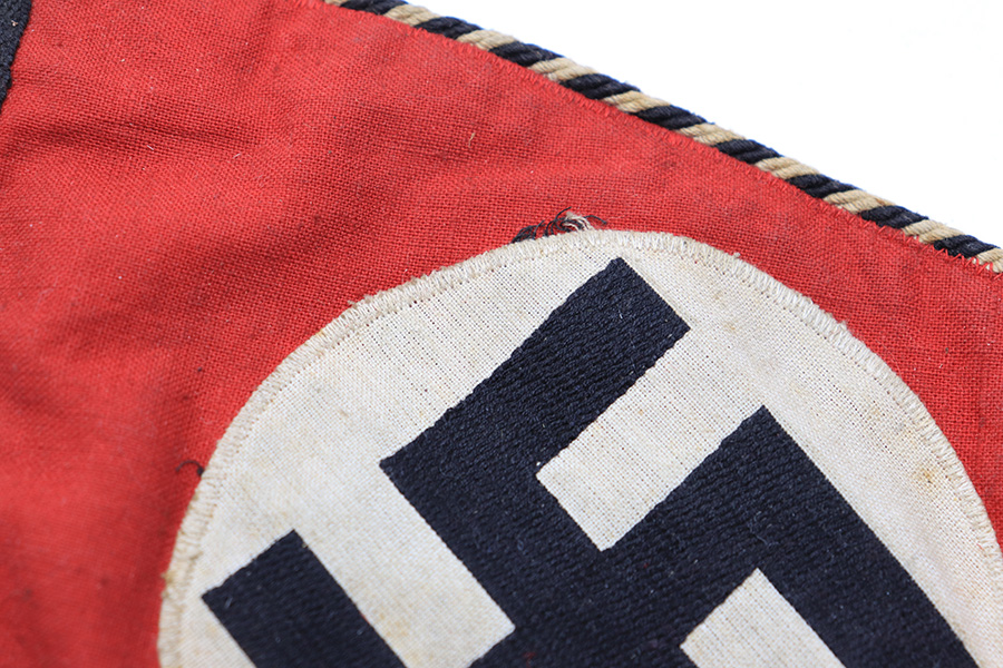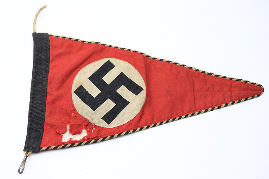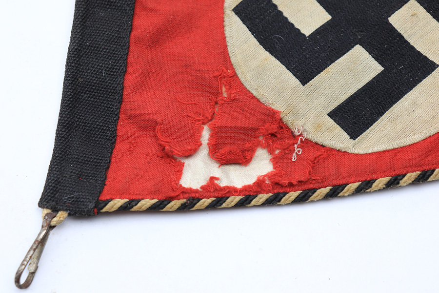 3/29/22 – This is an original SS Vehicle Pennant Flag. The flag is double sided and measures about 11.5 inches long and about 6.25 inches wide. The stitching throughout is intact and original. There’s a nice white and black edging throughout. One side of the flag has some ripping on the red cloth, as shown. Otherwise there’s no issues and typical light surface wear.