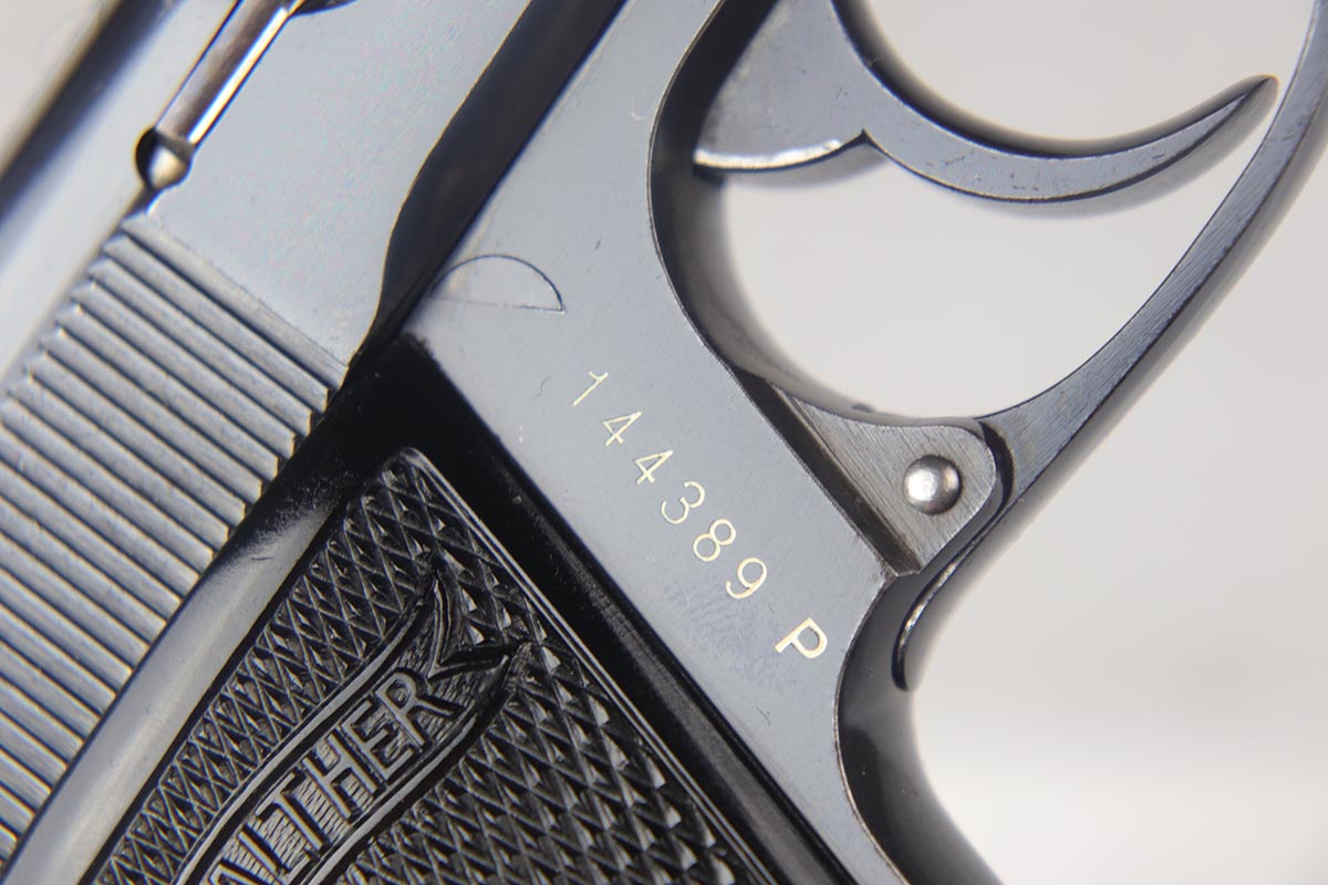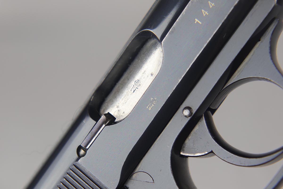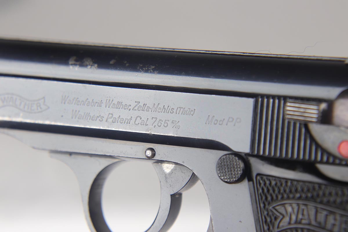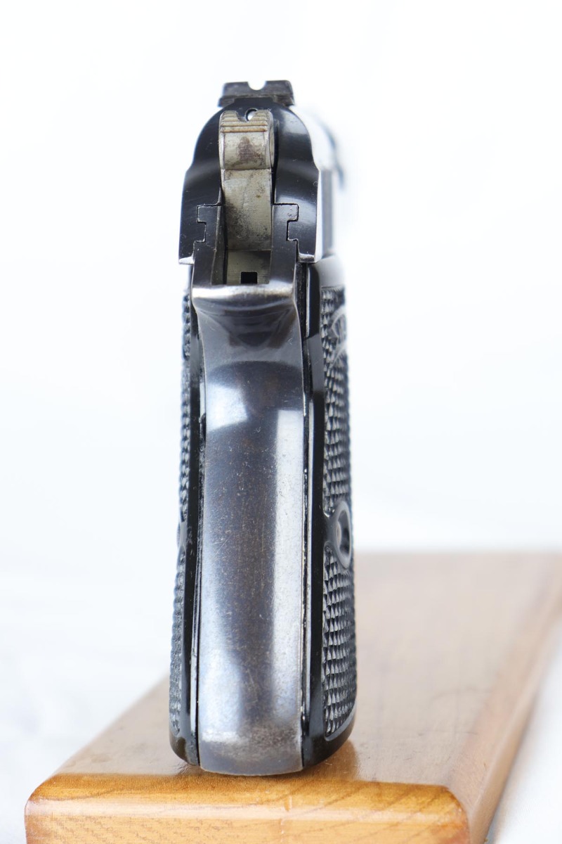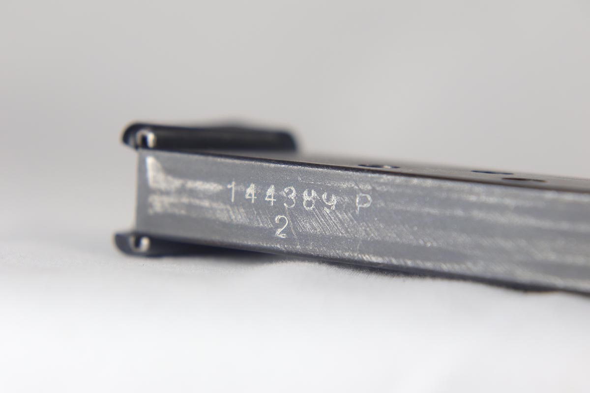 2/22/19 – This is a scarce Walther PP in the SS contract serial range with original, matching numbered magazine in the SS style. The pistol retains about 93-95% blue with majority of finish loss on the muzzle, trigger guard and bottom of the back strap. Very nice grips with only minor signs of age/wear. Finger extension magazine shows a few dings but no major cracks. Bore shows minor use but strong rifling and no corrosion. SS contract gun. The SS PP variation is RARER than the PPK SS contract pistols.