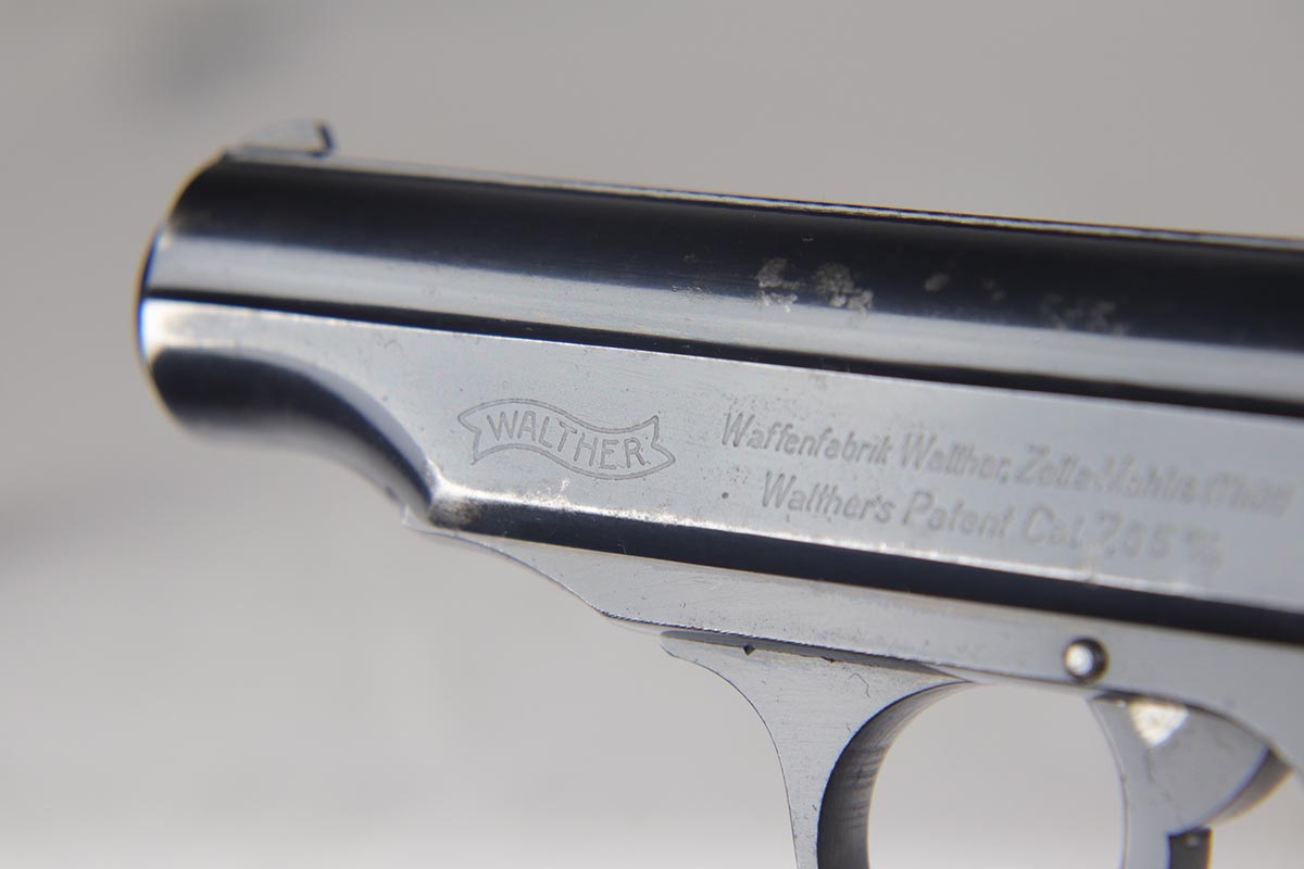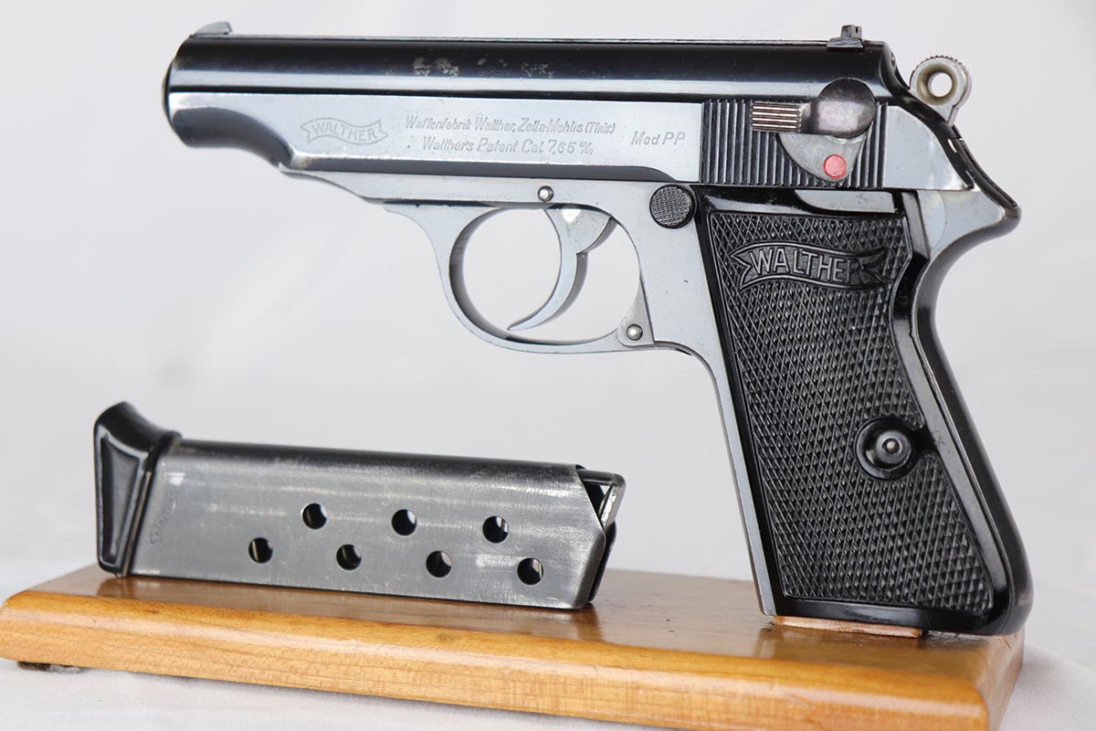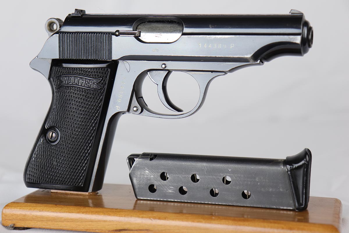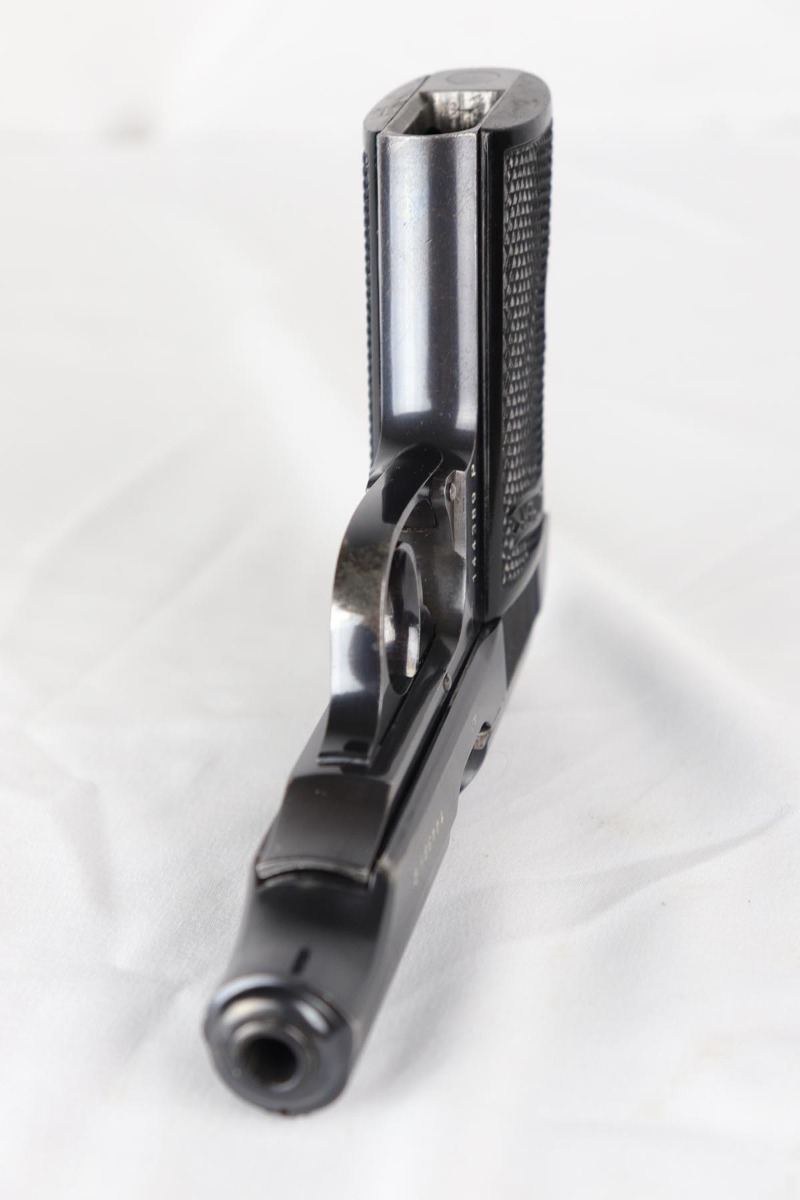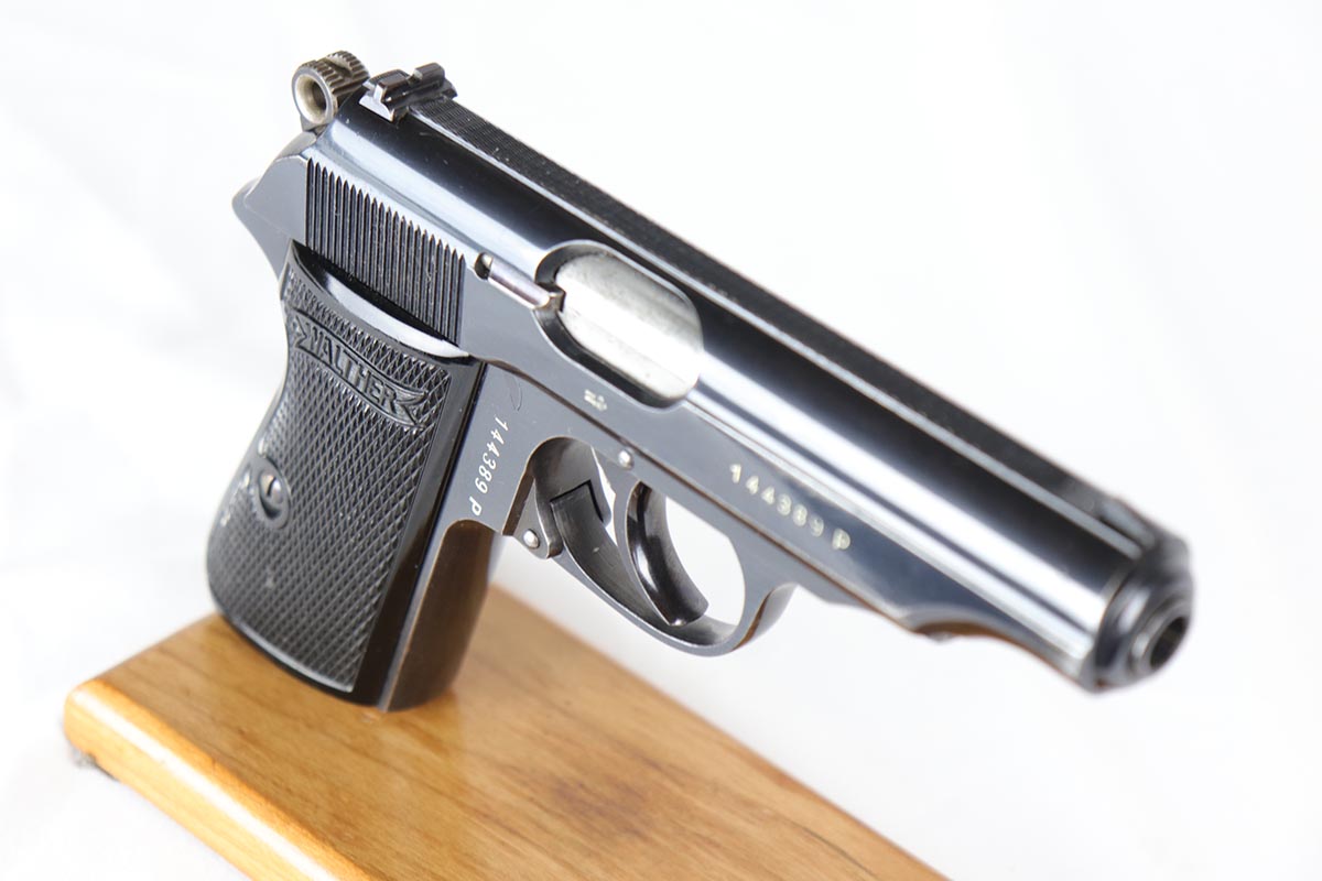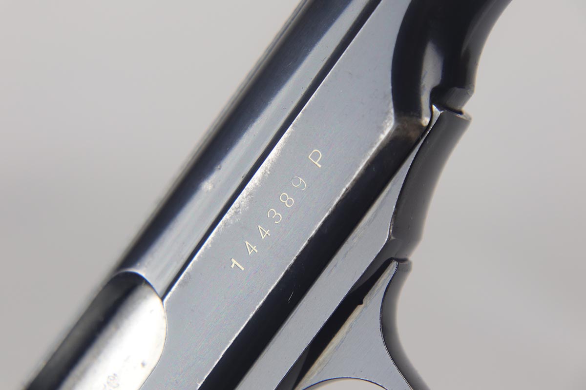 2/22/19 – This is a scarce Walther PP in the SS contract serial range with original, matching numbered magazine in the SS style. The pistol retains about 93-95% blue with majority of finish loss on the muzzle, trigger guard and bottom of the back strap. Very nice grips with only minor signs of age/wear. Finger extension magazine shows a few dings but no major cracks. Bore shows minor use but strong rifling and no corrosion. SS contract gun. The SS PP variation is RARER than the PPK SS contract pistols.