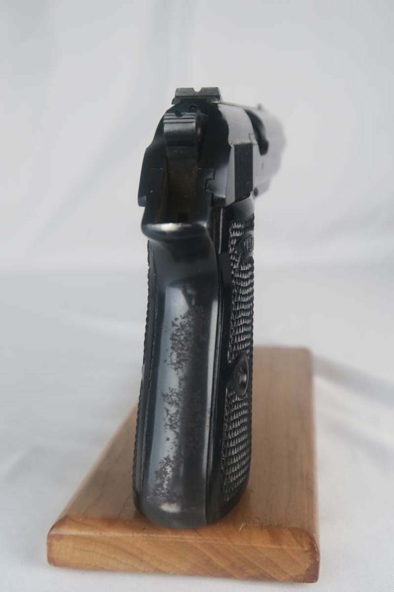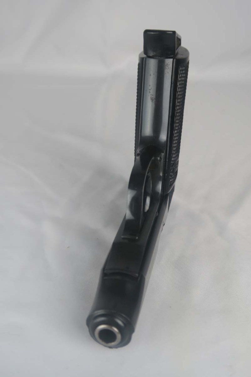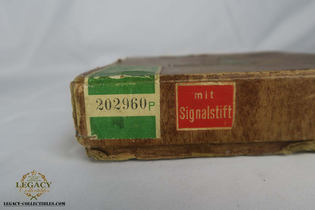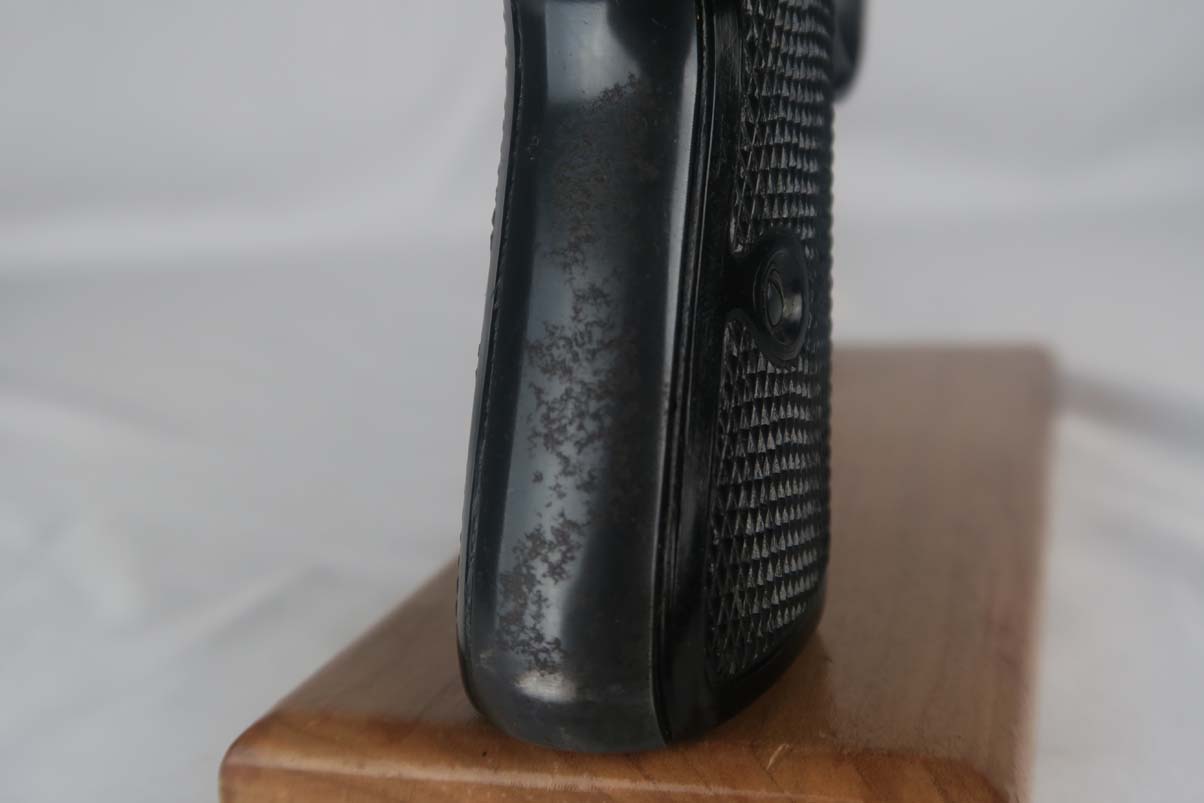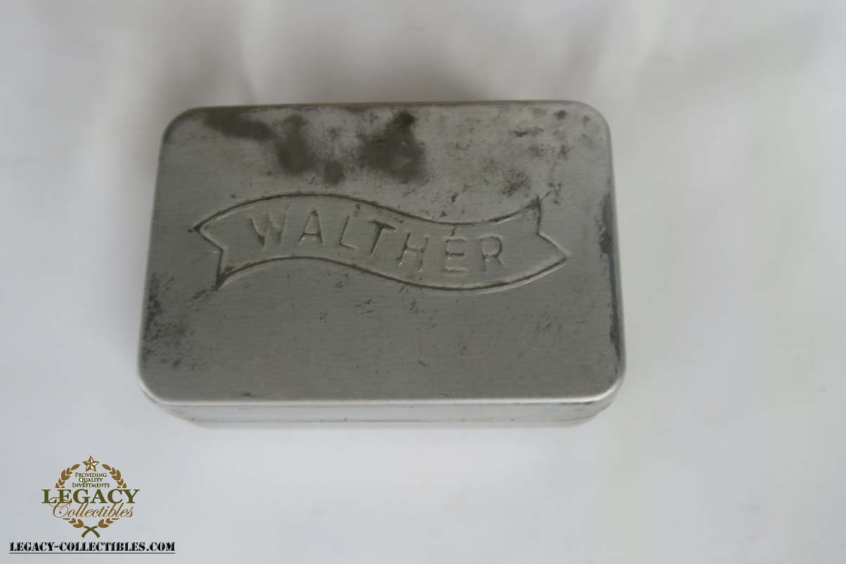 5/17/17 – This is a rare SS-issued Walther PP, with both original matching numbered magazines, the original numbered box, and a wartime Walther tin and oiler. This is a 4th variation SS pistol, with about 97% original bluing. The finish loss can be found on some of the high edges of the slide, as well as the bottom of the back strap. The back strap also does show a sizable spot of patina/freckling on the surface, but it is not deep pitting. 4th variation SS Walther PP’s feature spine-numbered magazines with P suffix, serial numbered slides, high-polish finish, and Eagle/N proofs on this late subvariation. The original box does show some flaking, as well as some adhesive applied to keep the frame of it sturdy. Correct wartime tin and oiler is included in the box. Excellent bore with no freckling or frosting.