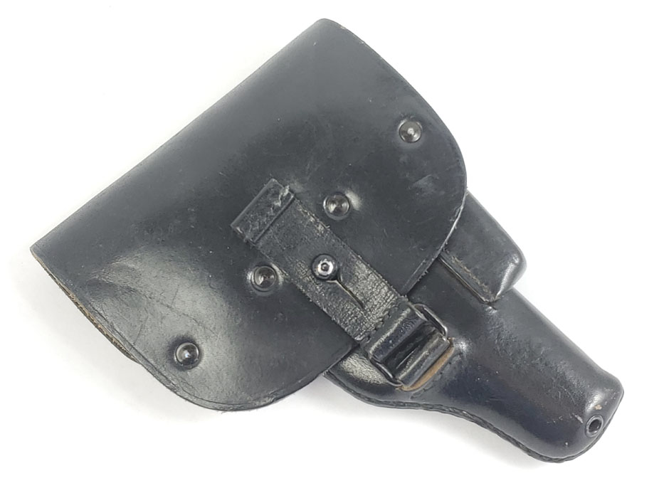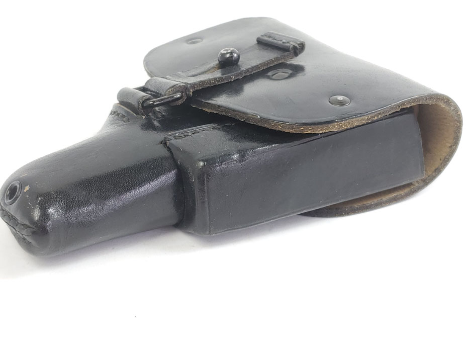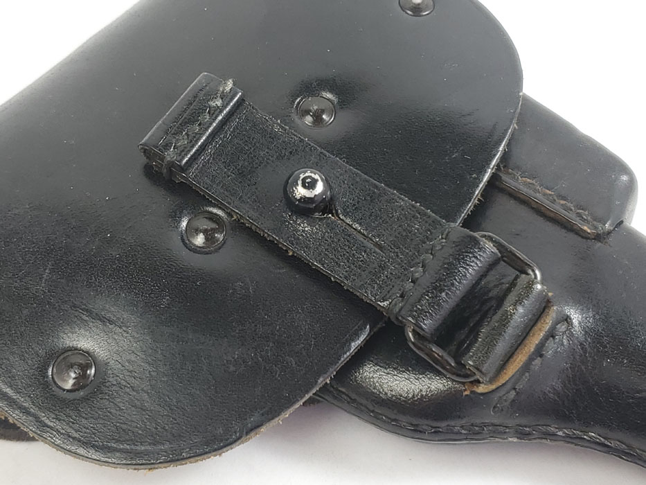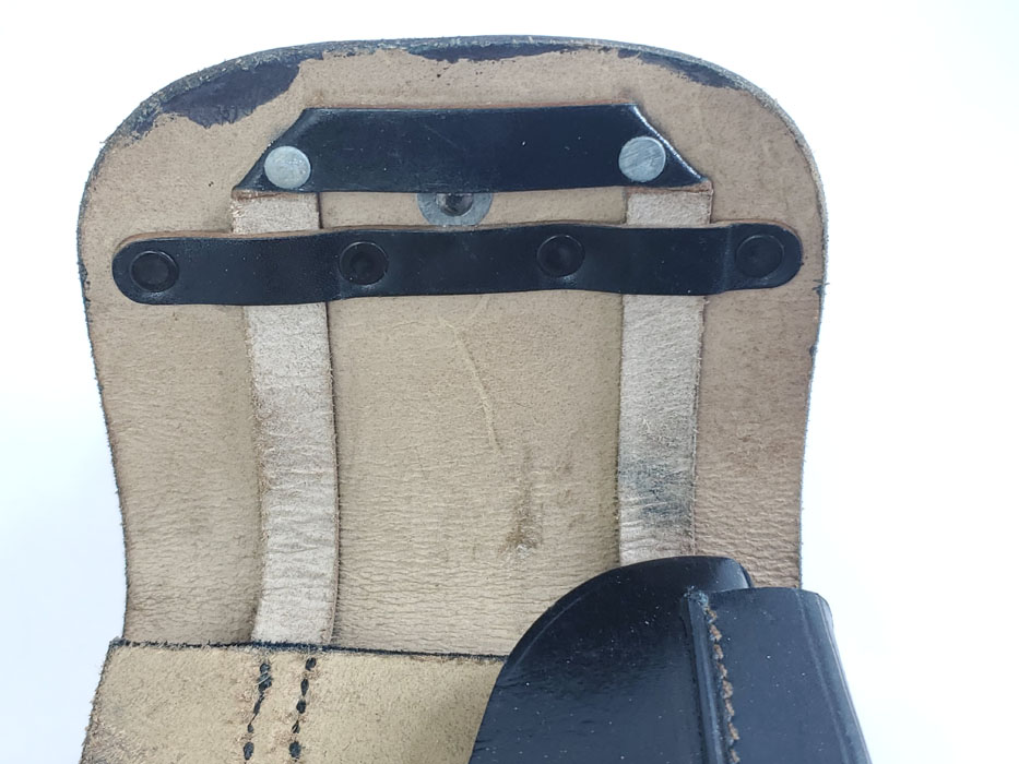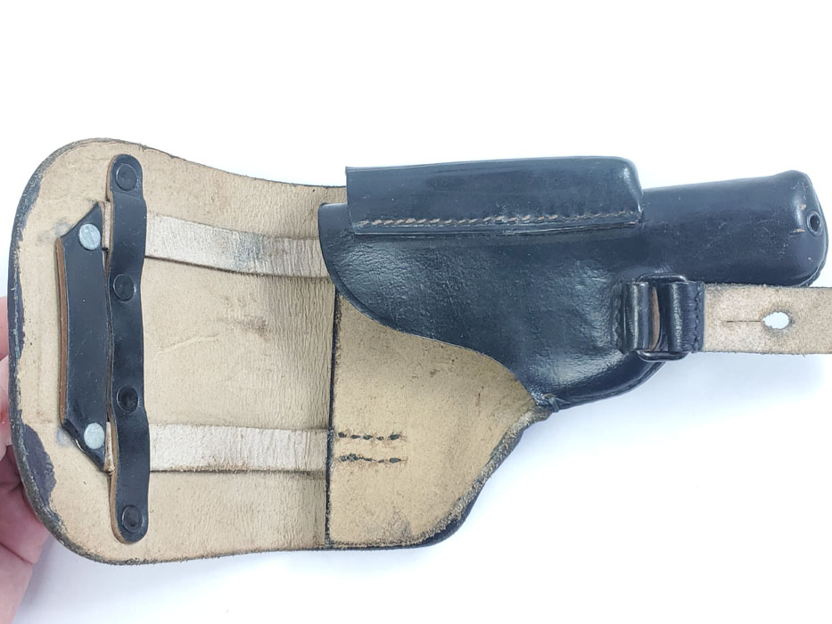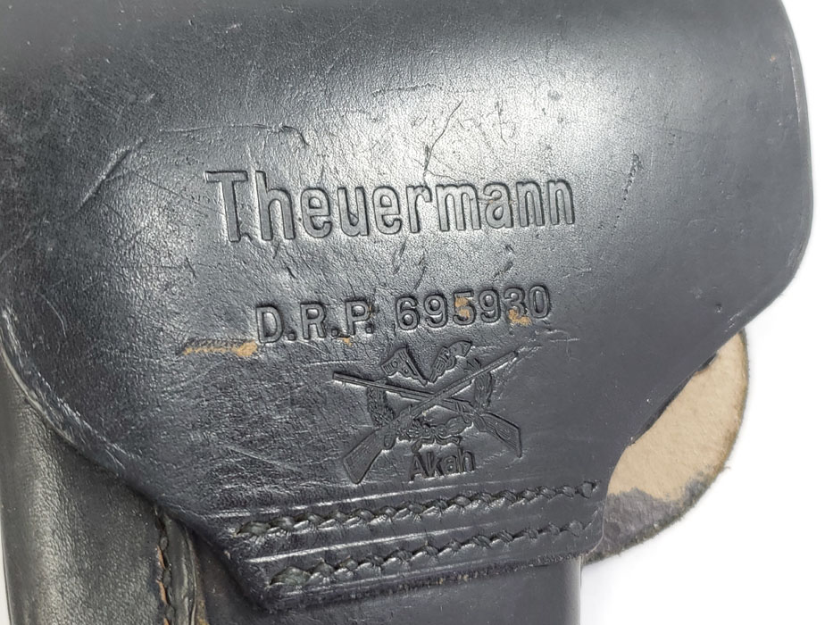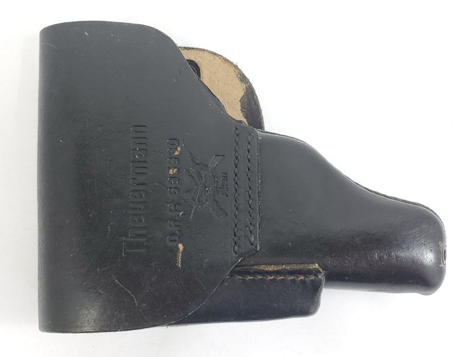 5/21/20 – This is a very rare and desirable Theuermann Walther PPK holster. The holster is considered a “Type 1”, which is the earlier style (and more desirable). This is due to the interior lift straps on the holster. These holsters are often seen & associated with SS Walther PPK pistols, because they were the first black leather specialty PPK holsters. The holster is in beautiful condition as well with gorgeous interior leather and no notable issues. All original black stitching in tact as well. Great collector holster.