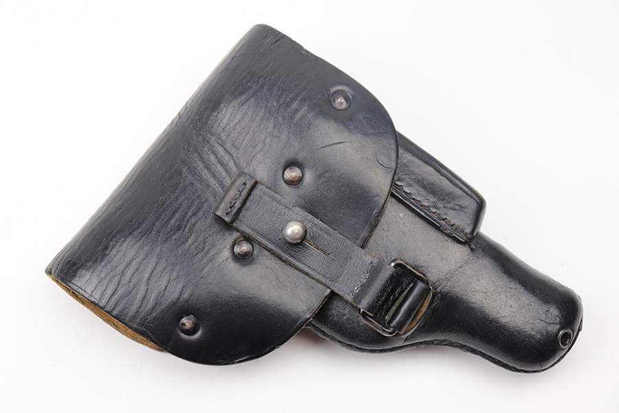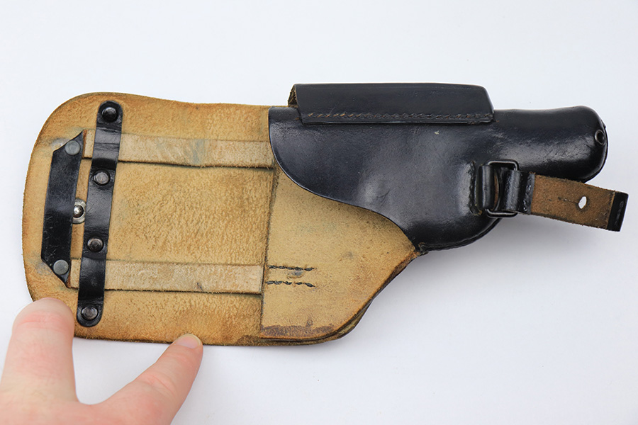 04/30/21 – This is an excellent example of an SS-contract Theuermann Dropping-Style Walther PPK holster made by Akah during WW2. This particular holster is in excellent condition – just a few light handling marks here and there. There is some light wrinkling in the top flap. Excellent Stitching. There are a few minor scuffs on the back. Minty closure strap.