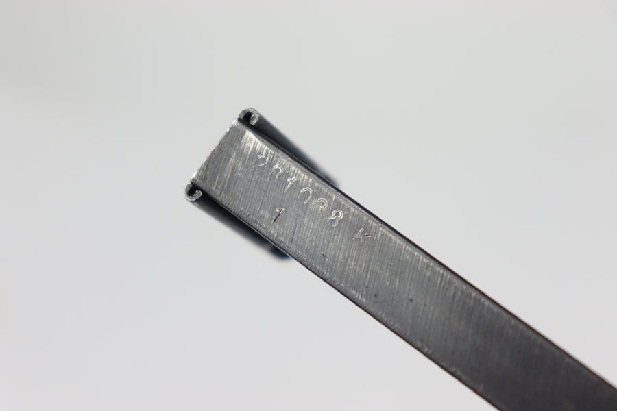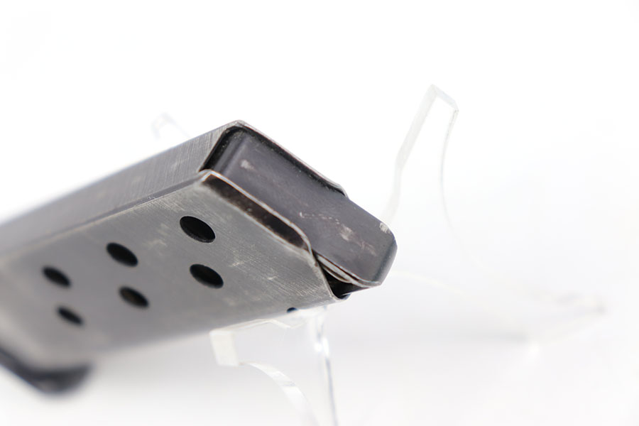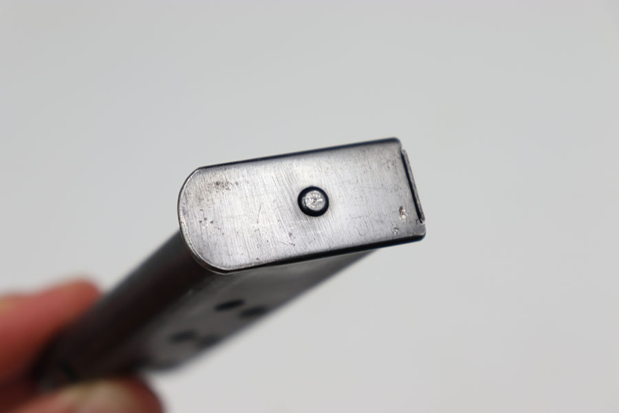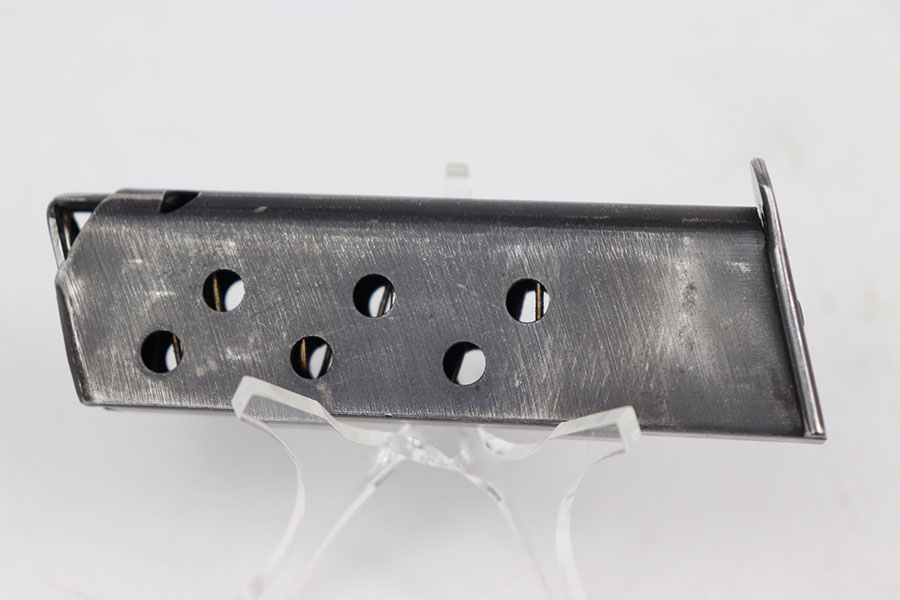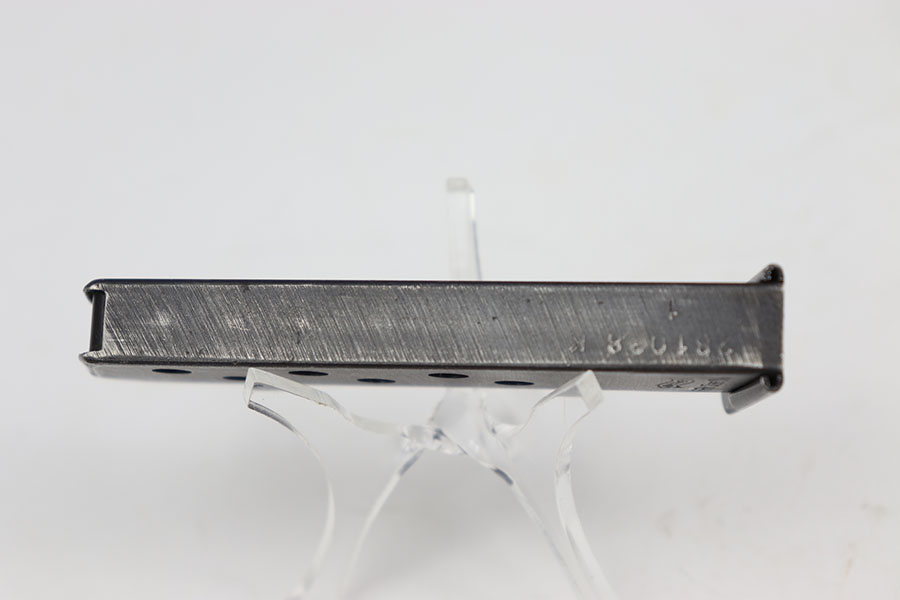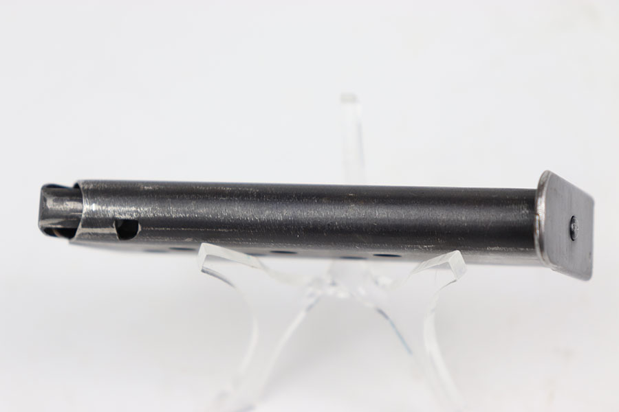 7/12/2024 – This is an original Wartime SS Walther PPK magazine. This magazine is in great condition even though it has some moderate amounts of wear to its original bluing because there are no severe scratches, dents, or signs of oxidation. The wear is consistent on both sides of the tube and favors the top half on the front edge and the spine. The spine of this magazine is numbered, “281038 K” over “1” indicating it is the first magazine for a SS Walther PPK. The left side of the tube is marked with the Walther banner and the caliber. Strong and functional spring.