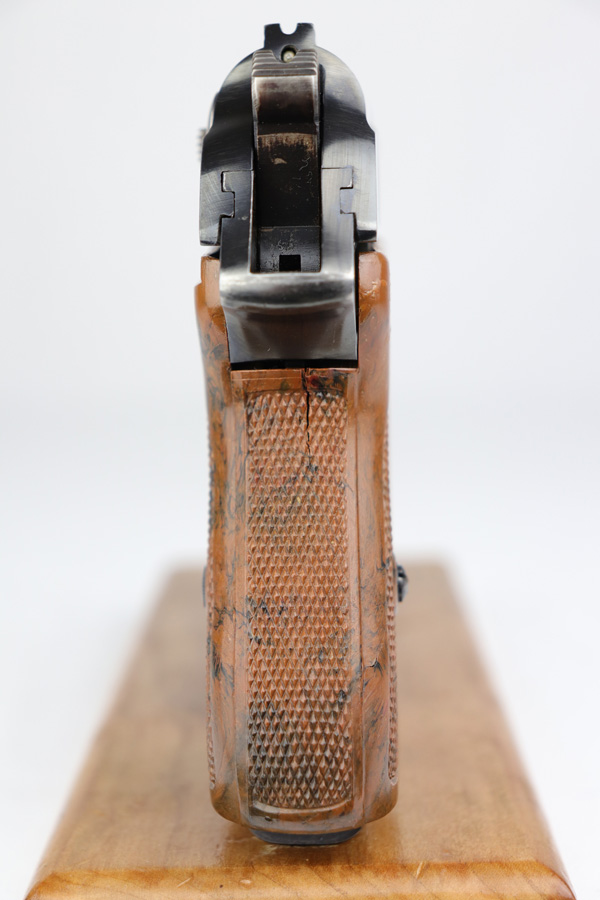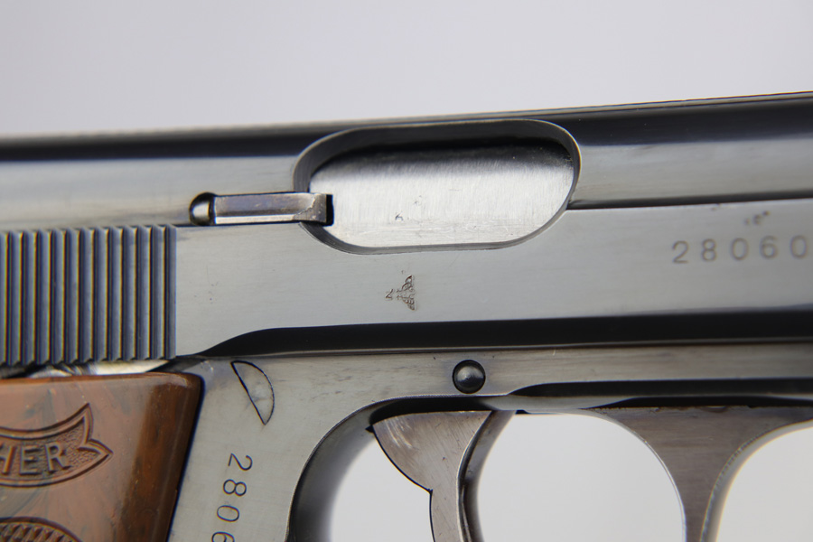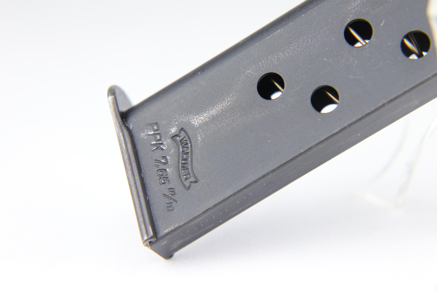 11/20/18 – This is an excellent SS-issued Walther PPK with the original matching magazine. It is all matching and original with about 95-96% high-polish blue remaining, with nearly all finish loss on the trigger guard and front strap. This is a variation 5 SS PPK with serial on frame and slide, as well as spine of magazine. The grip is in good shape but does have a crack on the spine. Bore is shiny with strong rifling.