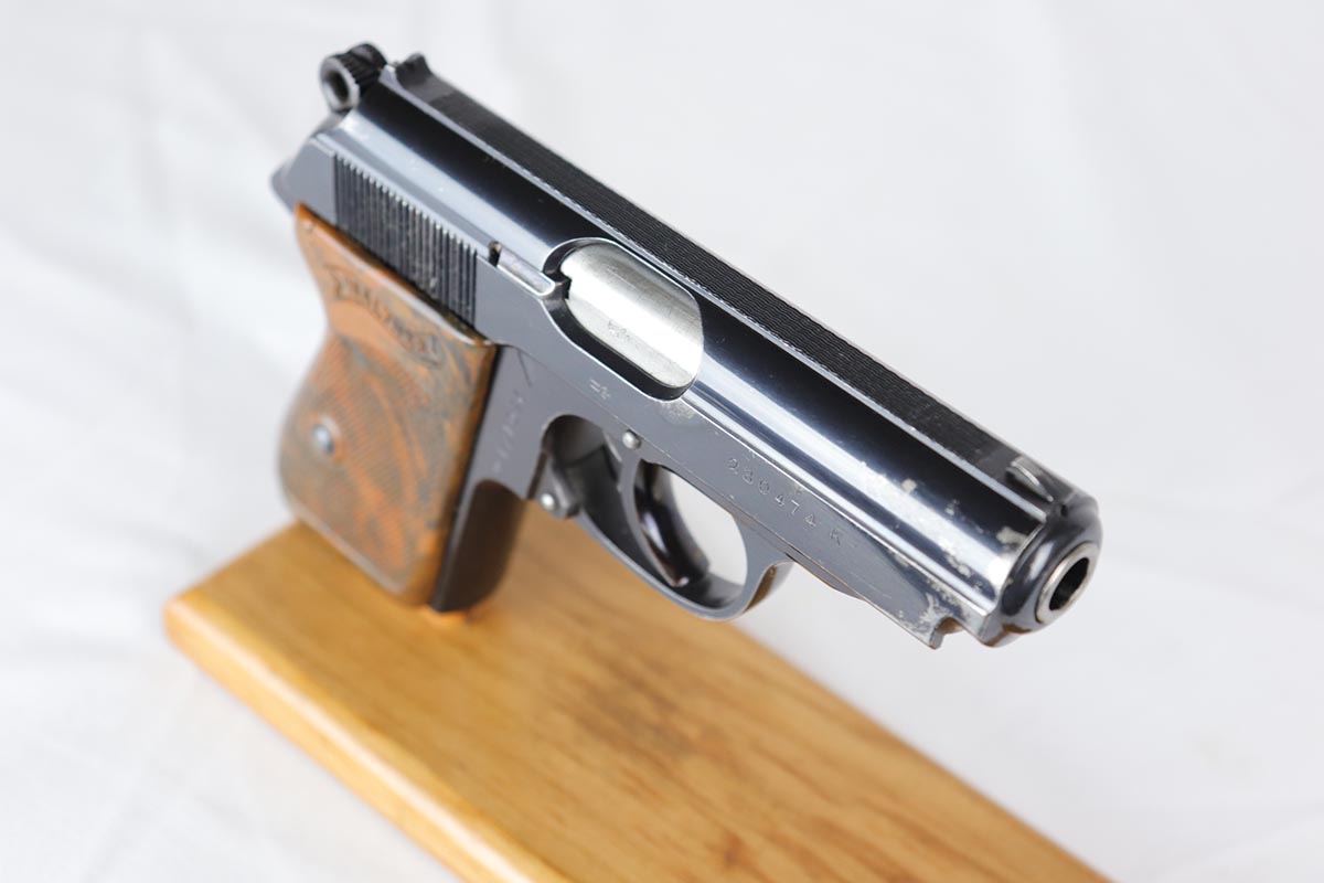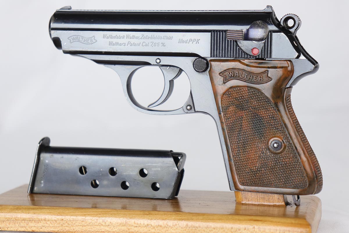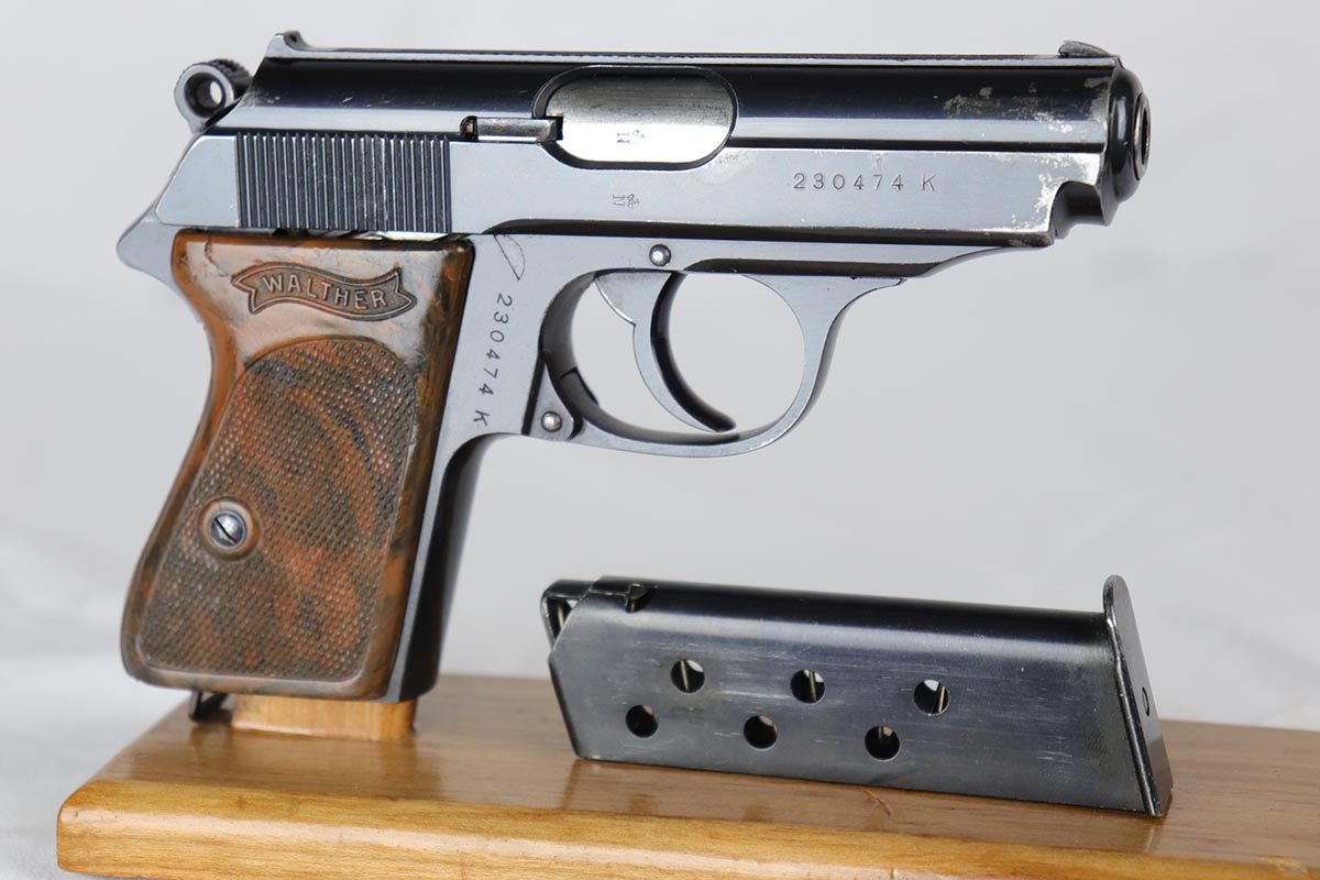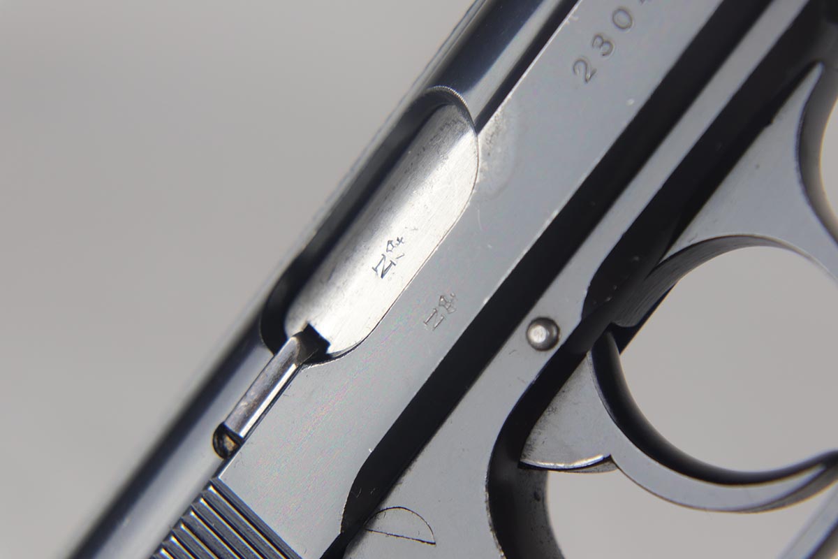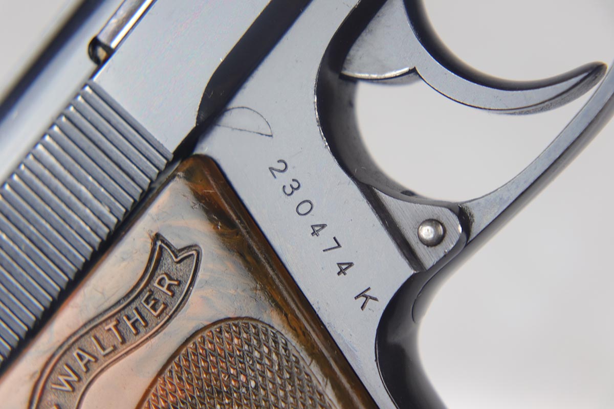 8/27/18 – This is an all original and matching Walther PPK in the SS contract serial range with near matching magazine. The pistol retains about 94-95% high-polish blue with majority of finish loss on either side of the slide, near the muzzle. SS style serial is visible on slide and the magazine is only about 60 digits off. Nice original grip but there is a small surface crack on the right side. Excellent bore.