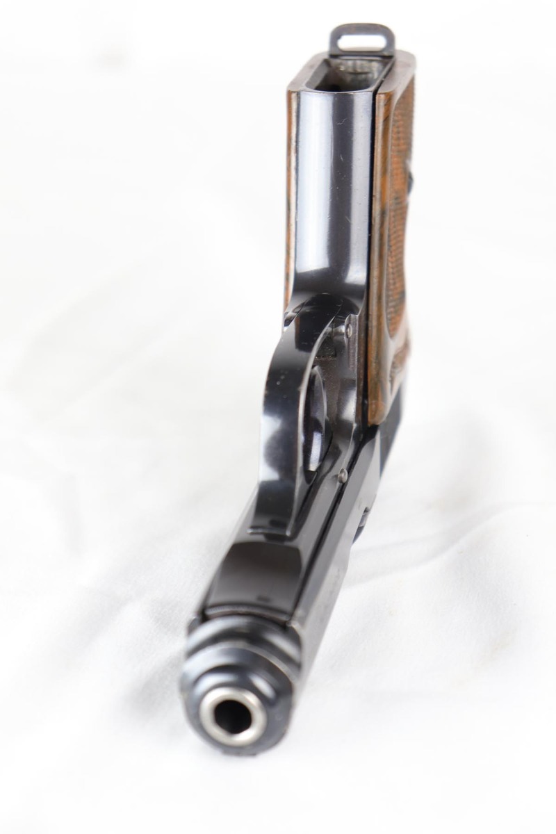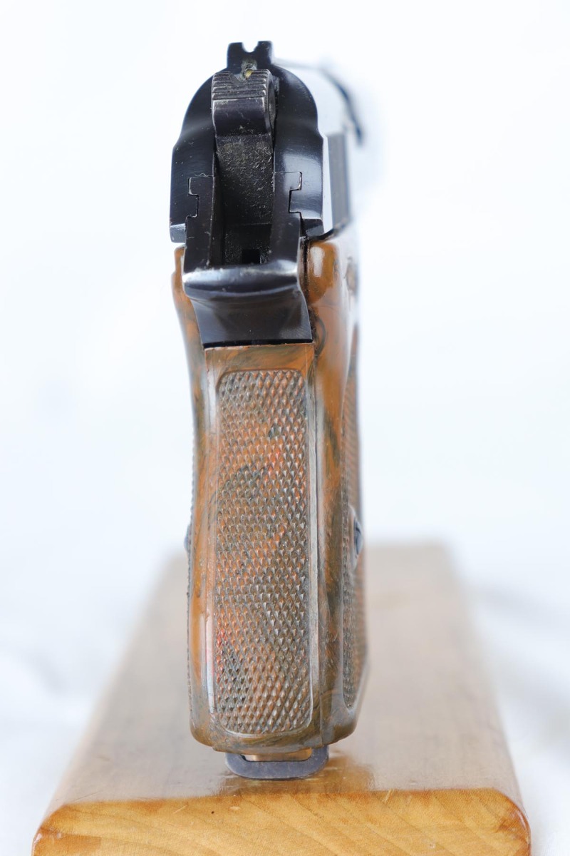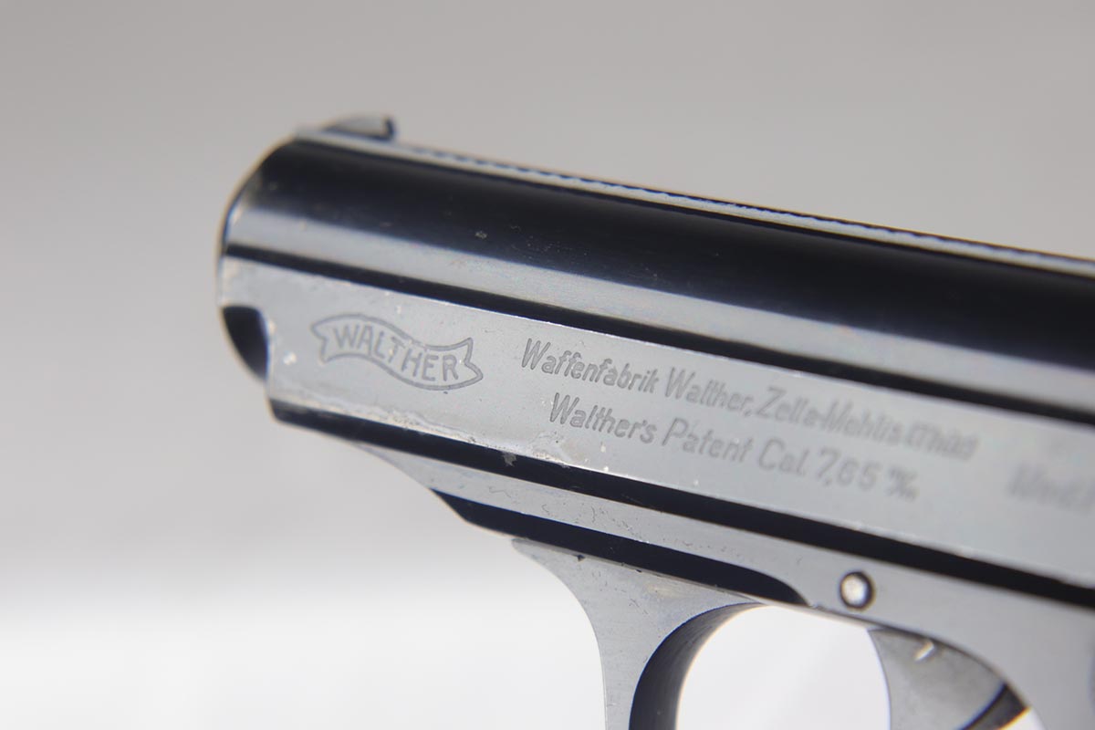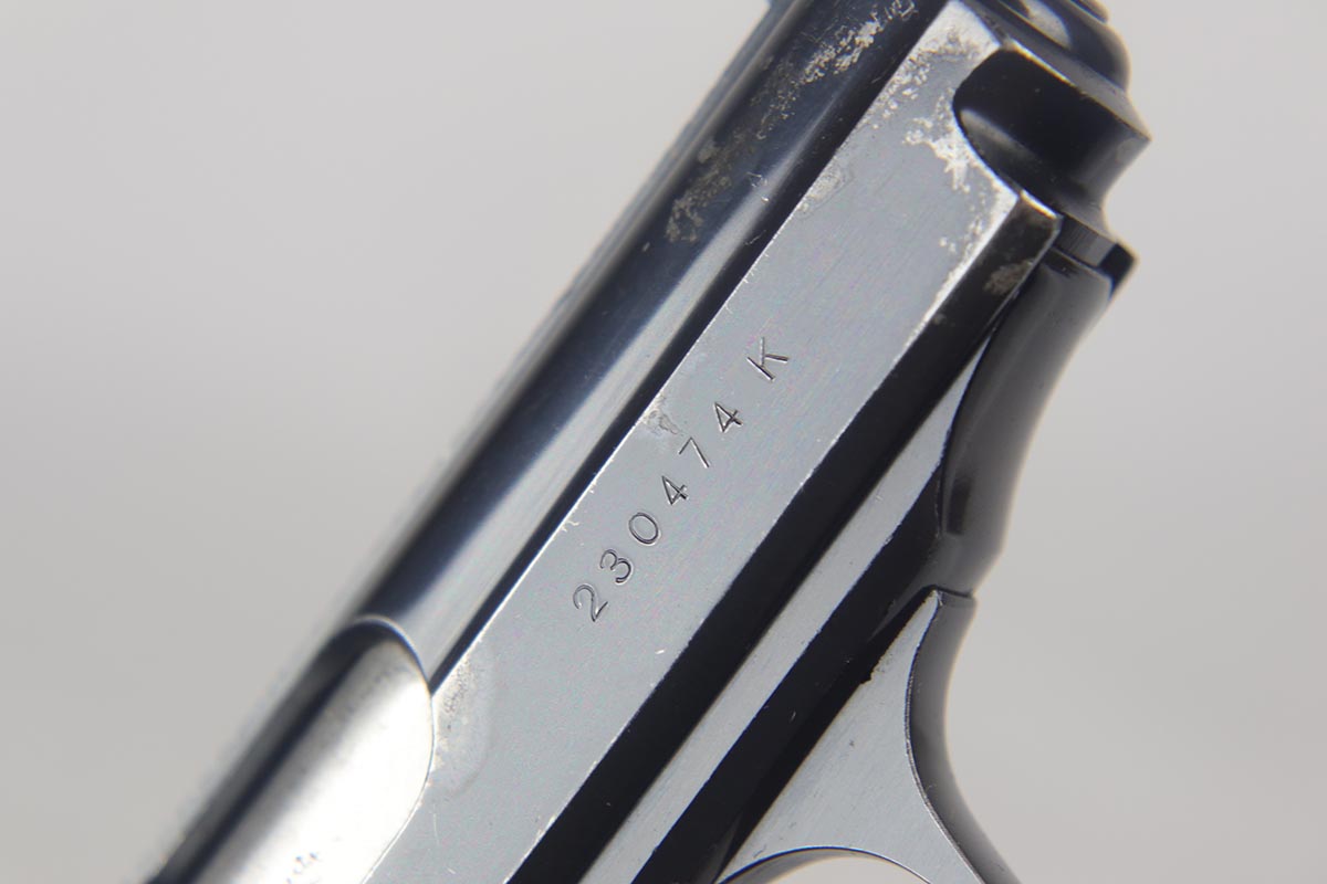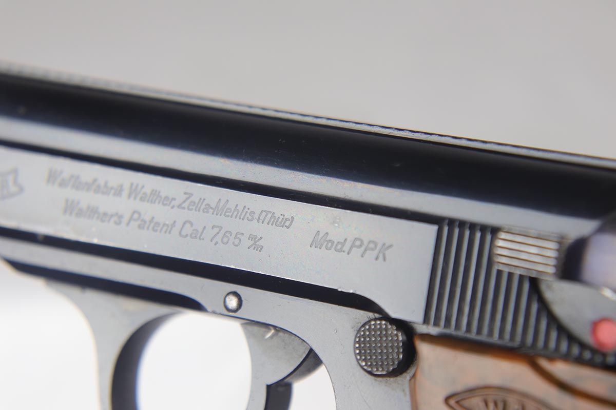 8/27/18 – This is an all original and matching Walther PPK in the SS contract serial range with near matching magazine. The pistol retains about 94-95% high-polish blue with majority of finish loss on either side of the slide, near the muzzle. SS style serial is visible on slide and the magazine is only about 60 digits off. Nice original grip but there is a small surface crack on the right side. Excellent bore.