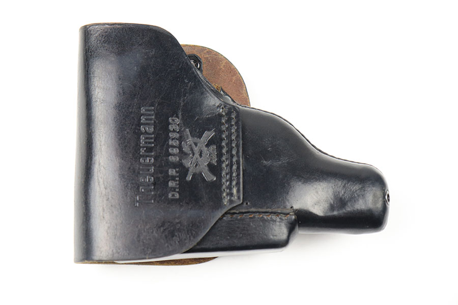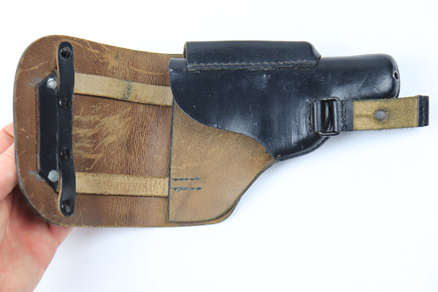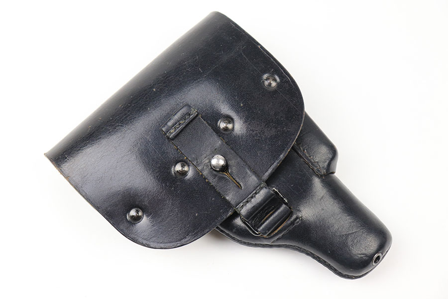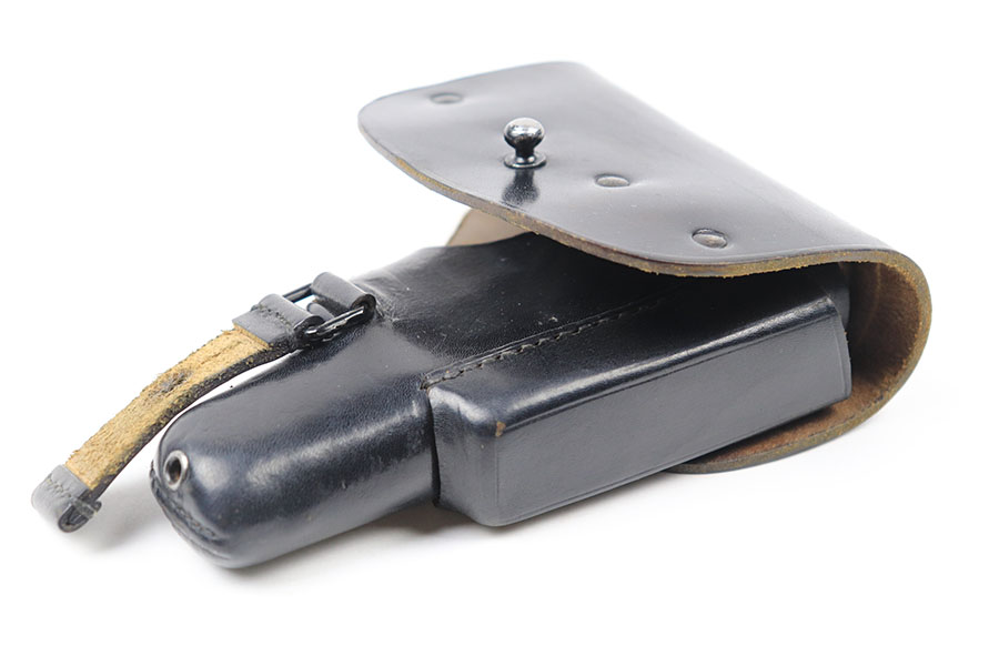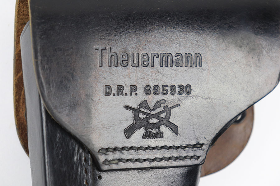 8/3/21 – This is an excellent, near mint example Theuermann style AKAH Walther PPK holster with black leather and stitching. These holsters are often paired with SS issued PPK pistols. The back leather is stamped with a crisp Theuermann AKAH maker stamp. The leather is firm with mild pliability. The interior leather shows signs of previous use but no major wear. No stitching issues.