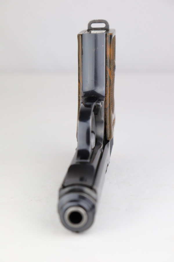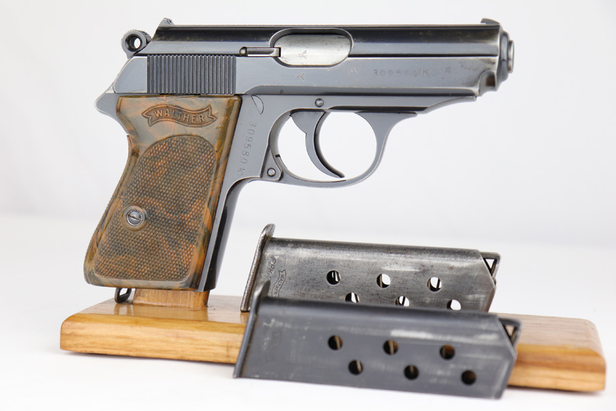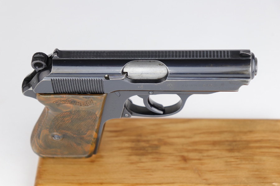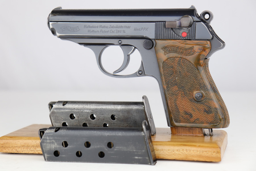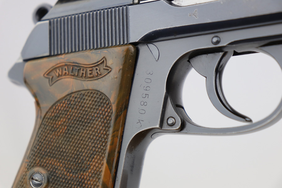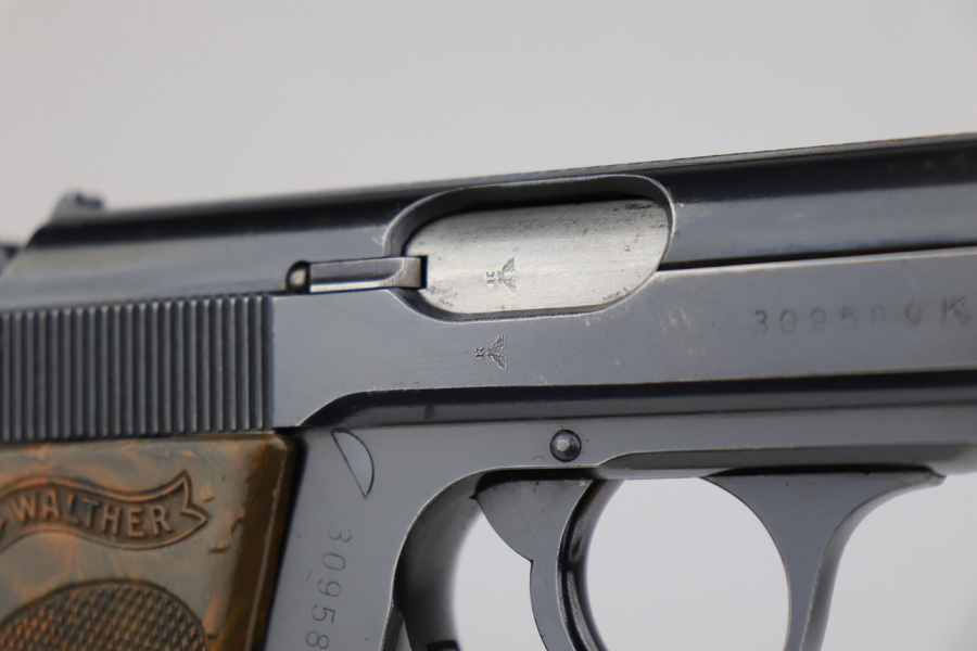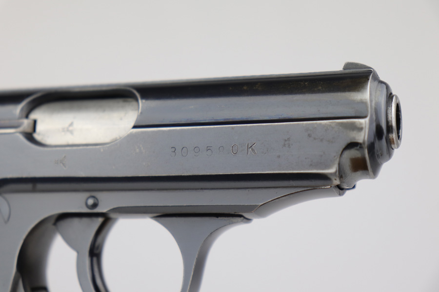 5/10/19 – This is an original SS Walther PPK pistol with one original matching numbered magazine, and one non-matching but correct (and closely numbered) ss magazine. This is a type 4 variation made at the end of 1940 or early 1941. High polish finish is about 93-95% overall with some light muzzle wear and slide wear near the ejection port, as well as normal edge wear. The front strap is excellent but there is a small spot of bluing loss. The bore is clean and shiny with only minor signs of use. The grip is excellent condition. The serial number on the slide does have the last digit and “K” much deeper than the other numbers. We have seen this before, and believe this is factory original and unaltered.
