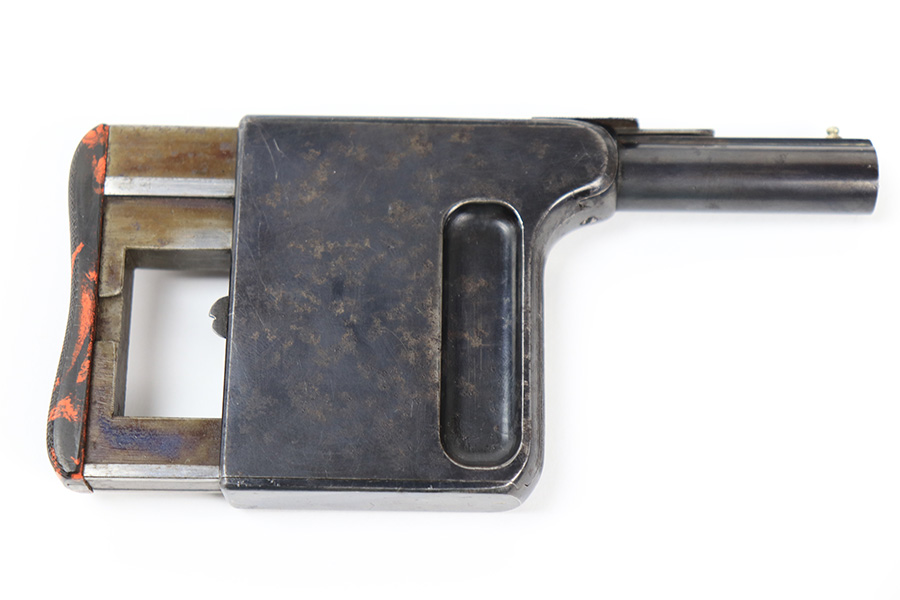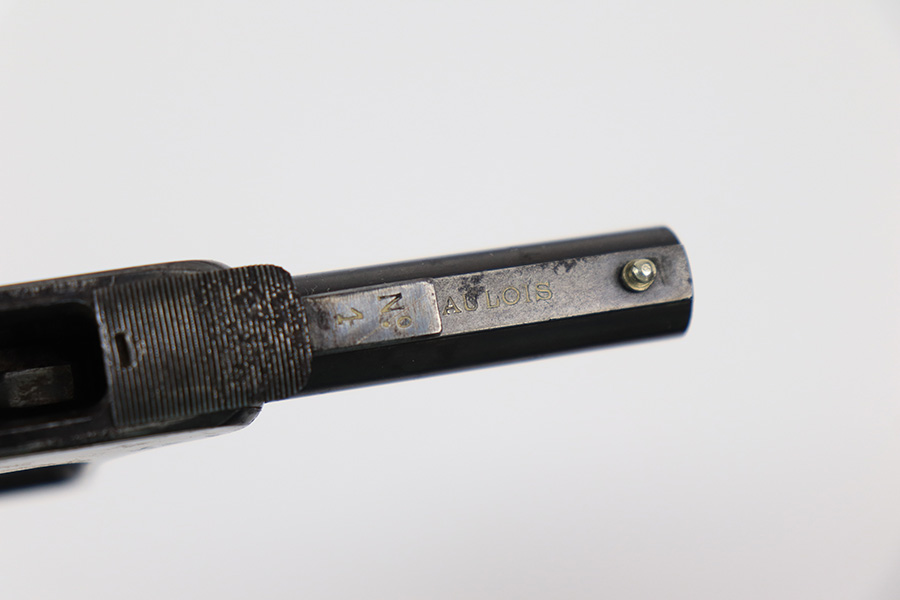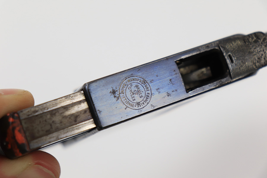 5/16/23 – This is an example of a St. Etienne Gaulois No 1 Palm Pistol, manufactured from 1895 to 1912. It uses a tactile “squeeze fire” action with an internal magazine. Has a single bead sight on the barrel rib with a manufacturer mark on the rear of the frame at the top, “Cal. 8m/m” at the front, “No./1” on the dust cover, and the manufacture Francoise logo along with “GAULOIS” on the barrel. The left side of the action has a unique three-position “S/F/D” (safe/fire/unload) safety switch. It has retained roughly 85% of its original finish. There is spotty oxidation and areas of light pin-pricking throughout. Some spotty discoloration on the front strap. Most of the case-hardening on the action is intact. The bore has noticeable pitting throughout. Comes with the original red and black hard rubber pad, which functions as both the trigger mechanism and grip and is in excellent condition, with sharp checkering and no chips or cracks.