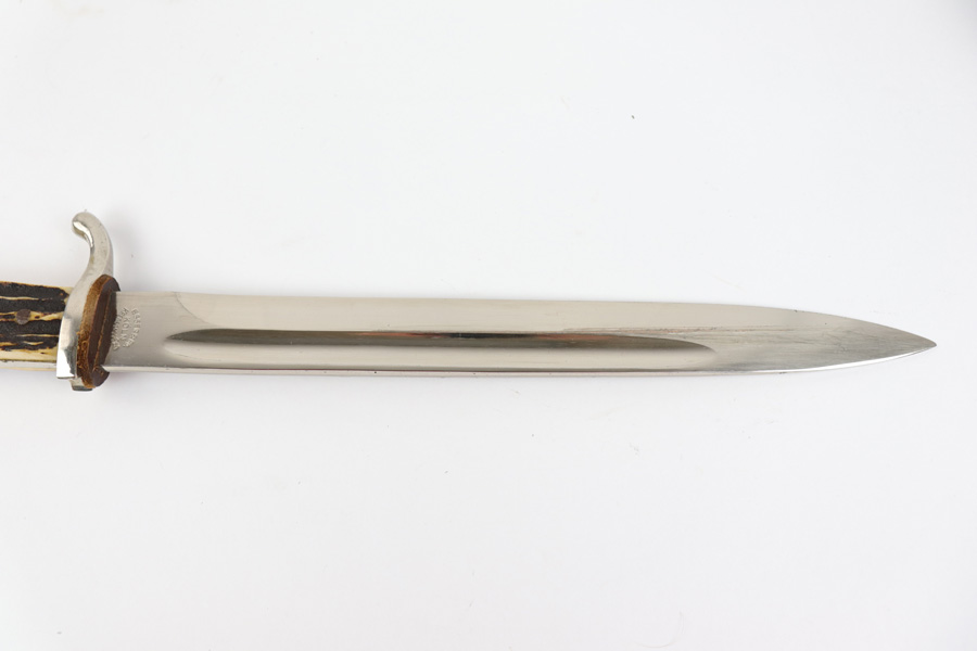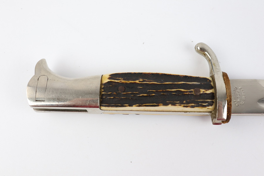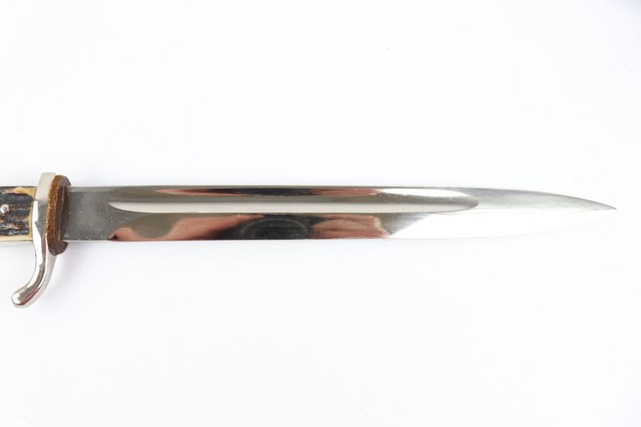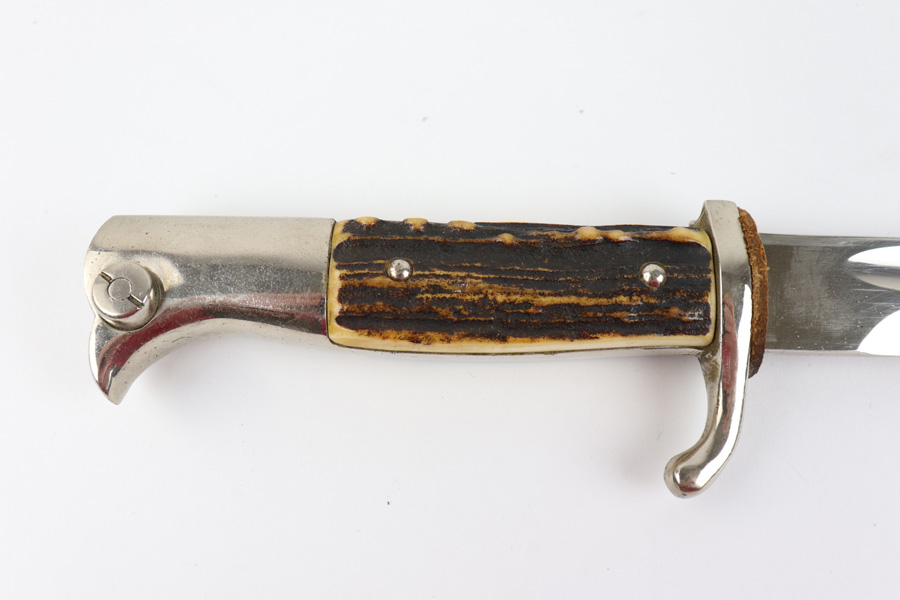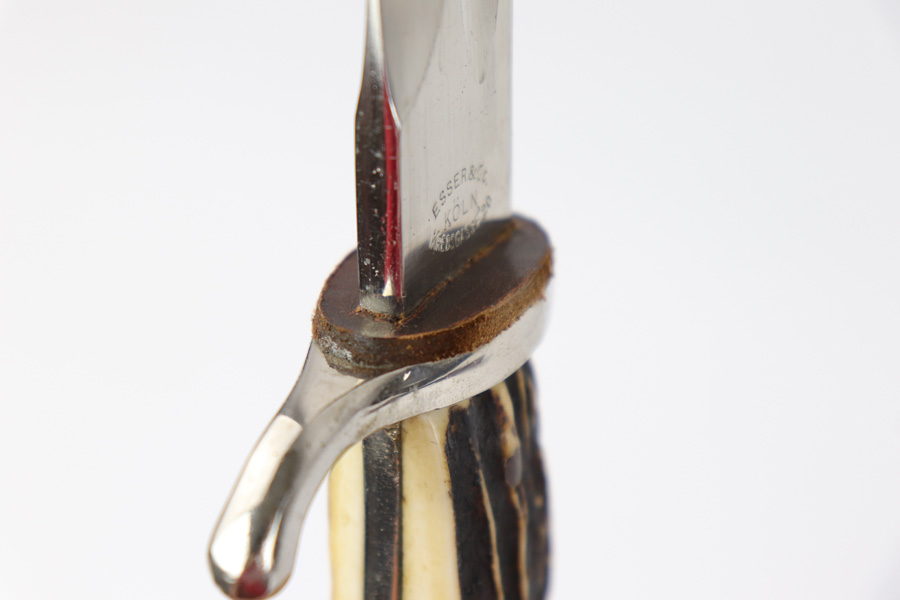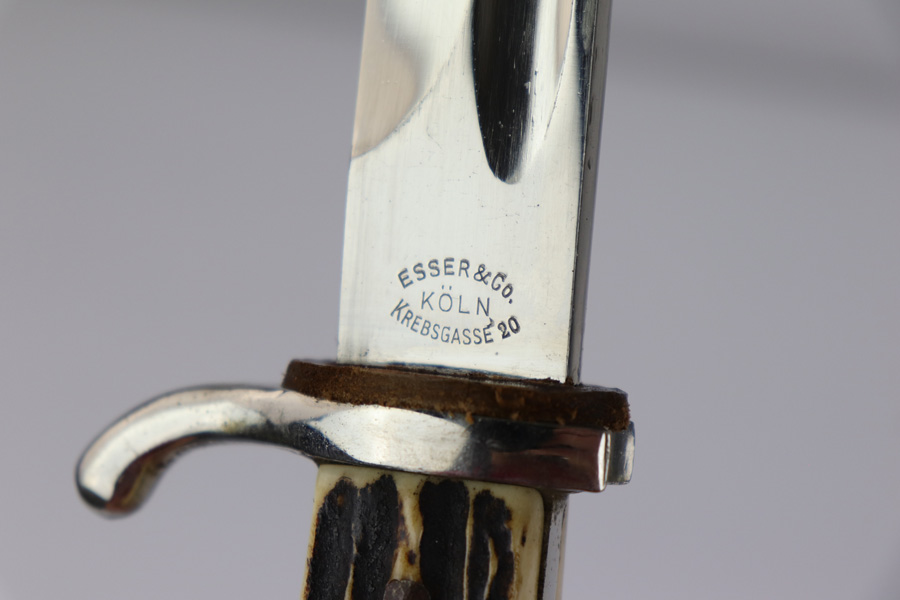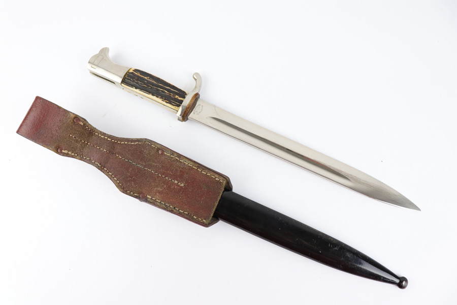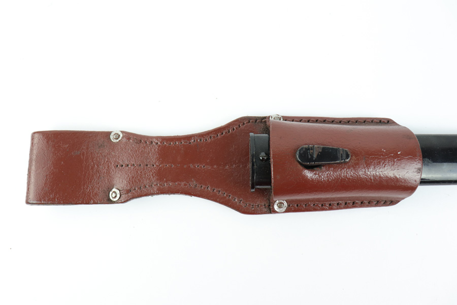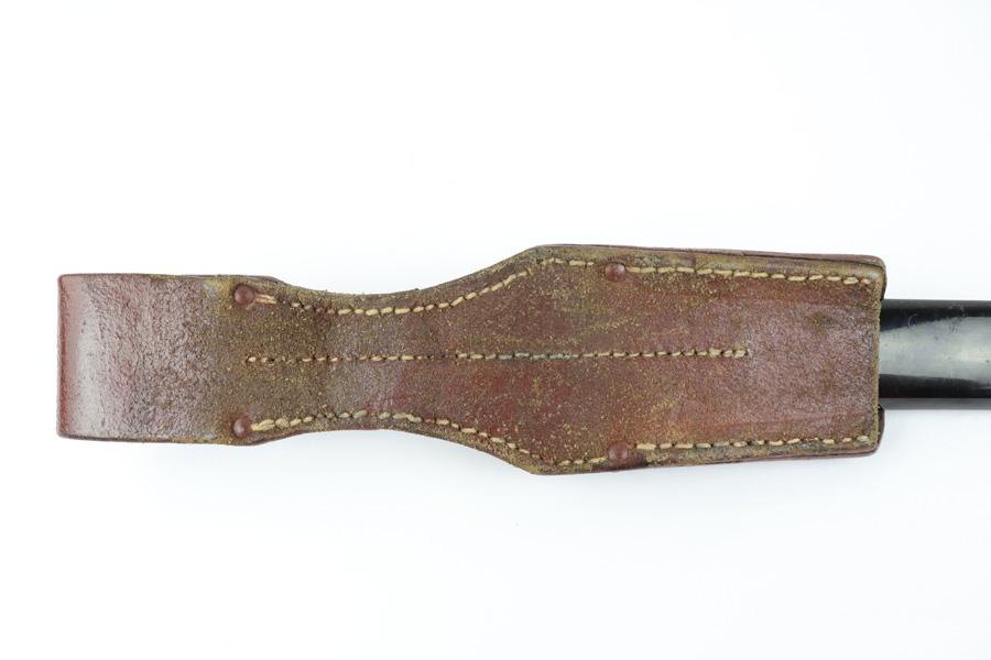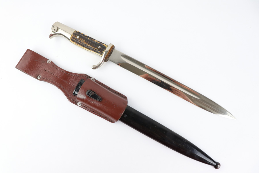 5/8/19 – This is an original & fairly rare K98 dress bayonet from WWII. The bayonet has an “upgraded” stag handle. Which is original and correct. The bayonet is also fairly rare because of the uncommon maker “Esser & Co”. The blade is minty and the maker stamp is crisp. The scabbard has the original black paint and is mostly in tact, although there is some minor / normal wear and spots of paint missing. No dents though. The leather scabbard is painted brown in the front and is in great condition. Overall all original and correct.